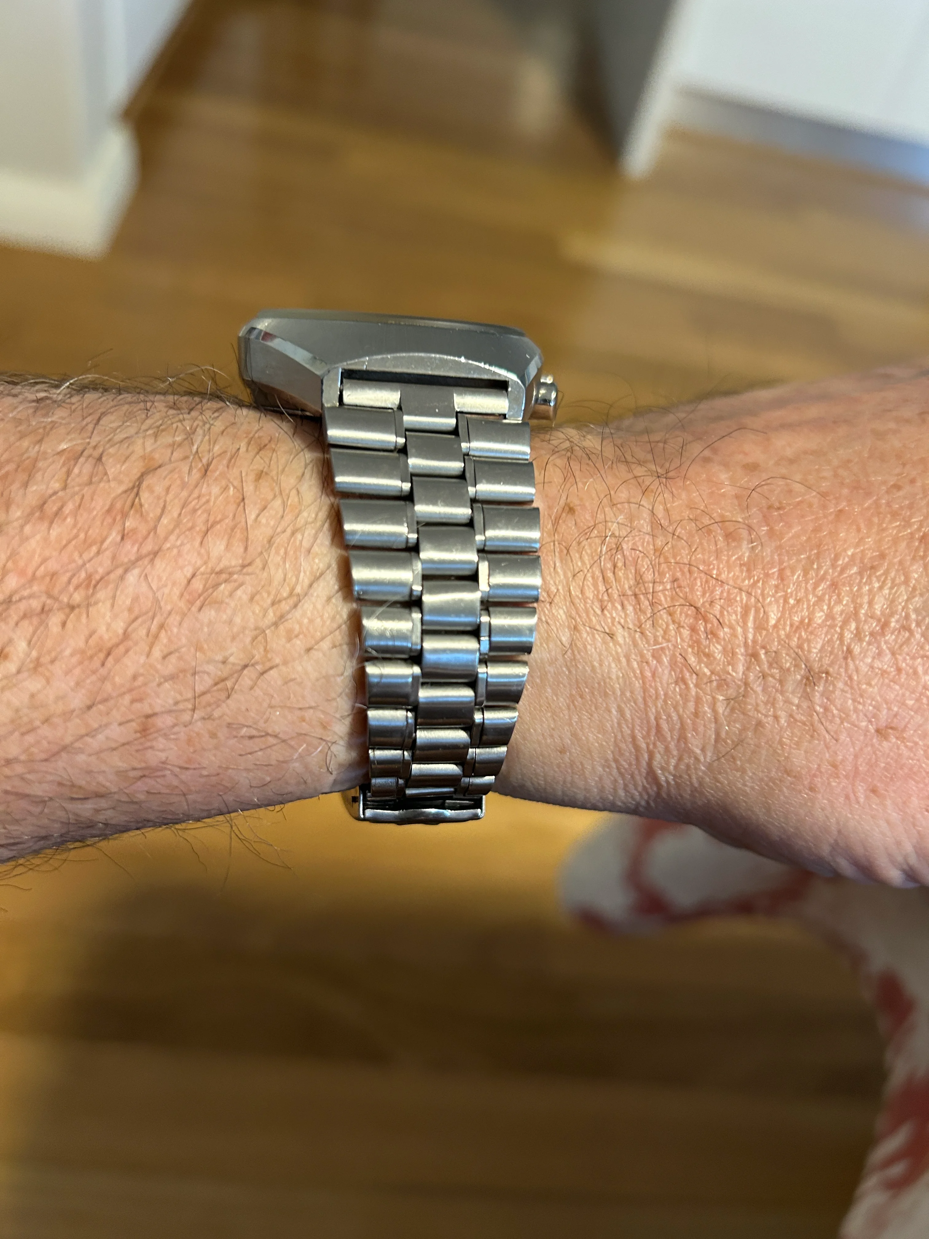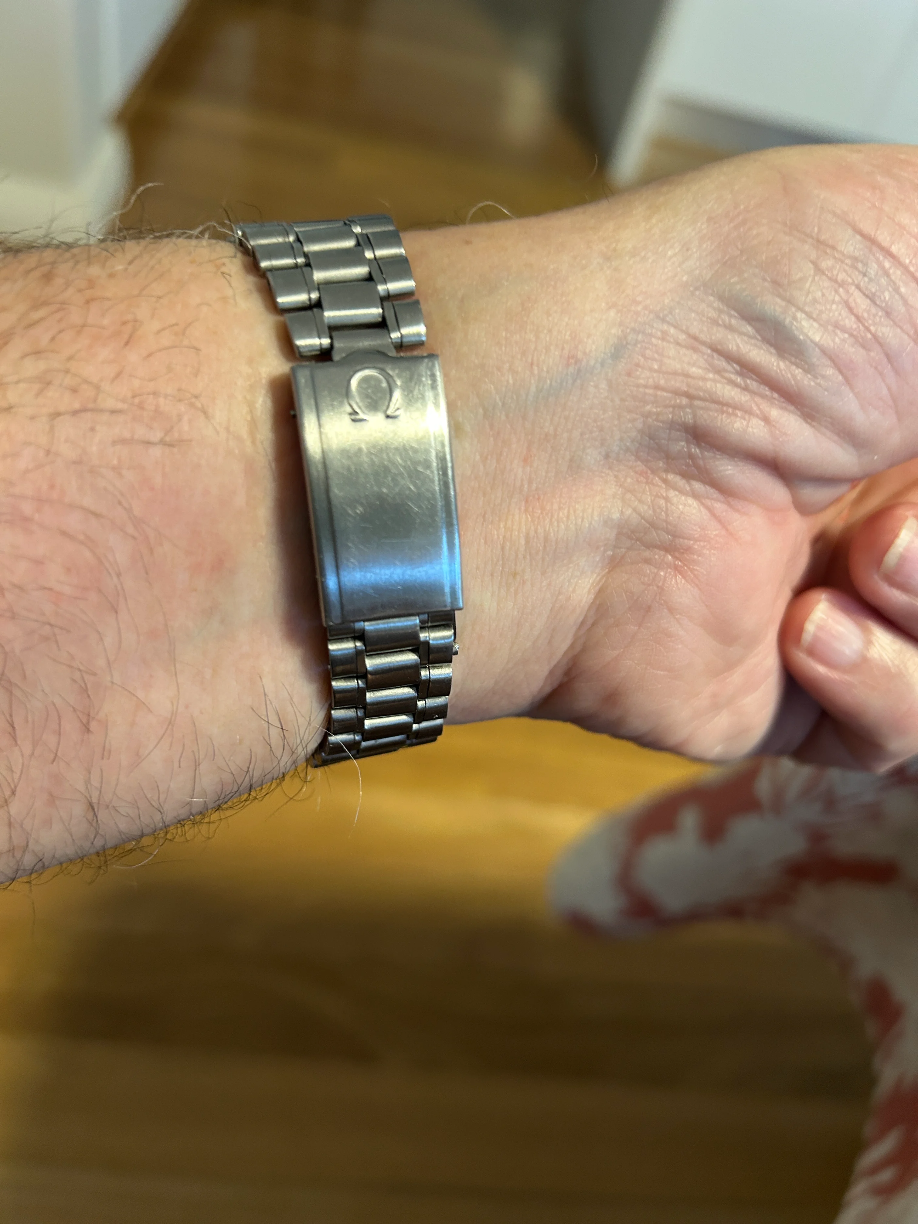 The watch comes on the original Omega steel bracelet with folding clasp in good length with minimal stretch and suitable up to around 7 3/4" wrist circumference.