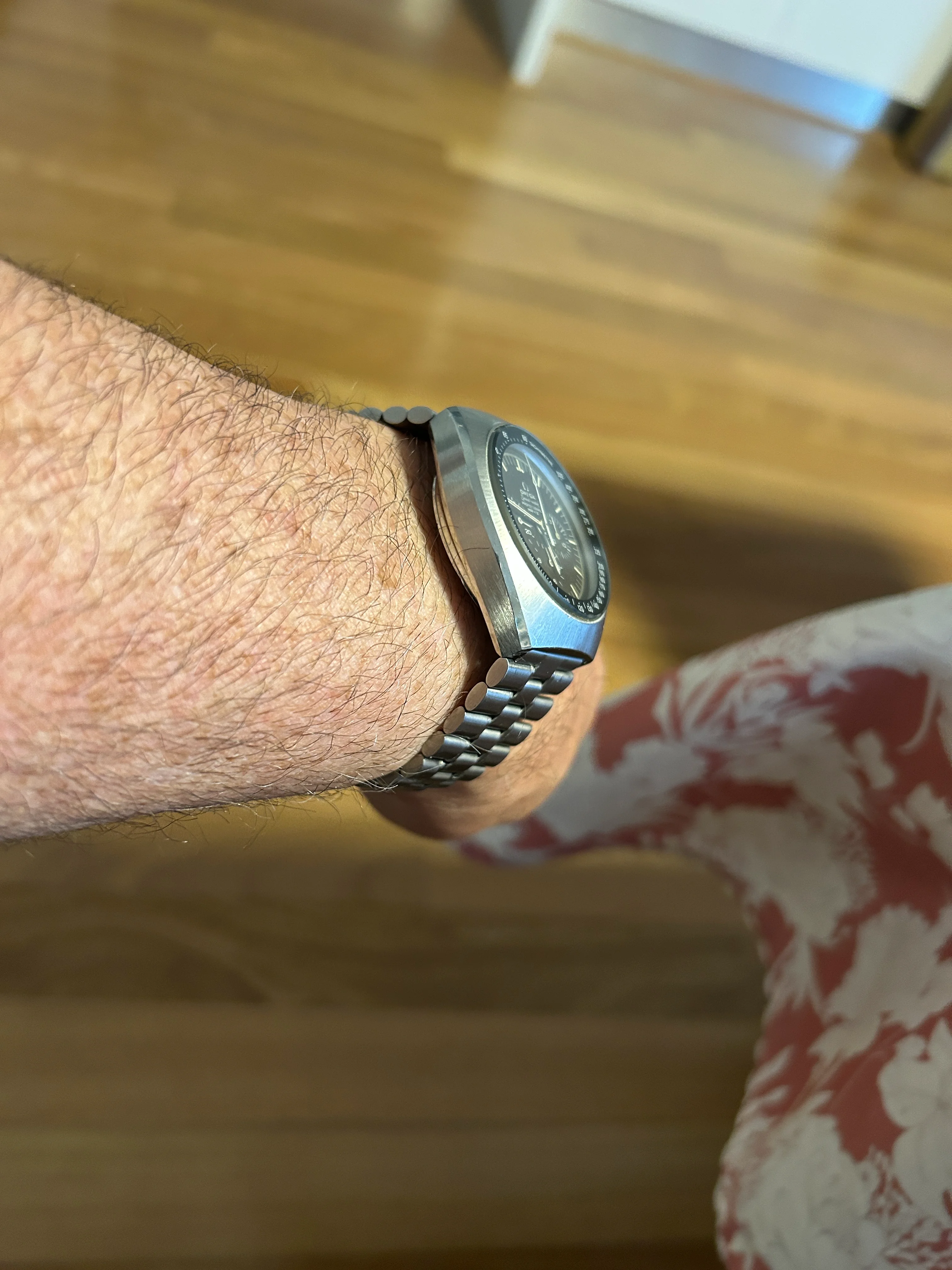 Very good vintage condition with some slight signs of wear and scratches. Case top still exhibits sunray brushing and case sides appear unpolished. I cannot spot a Ω symbol; etched into the crystal, so I am assuming a later replacement.