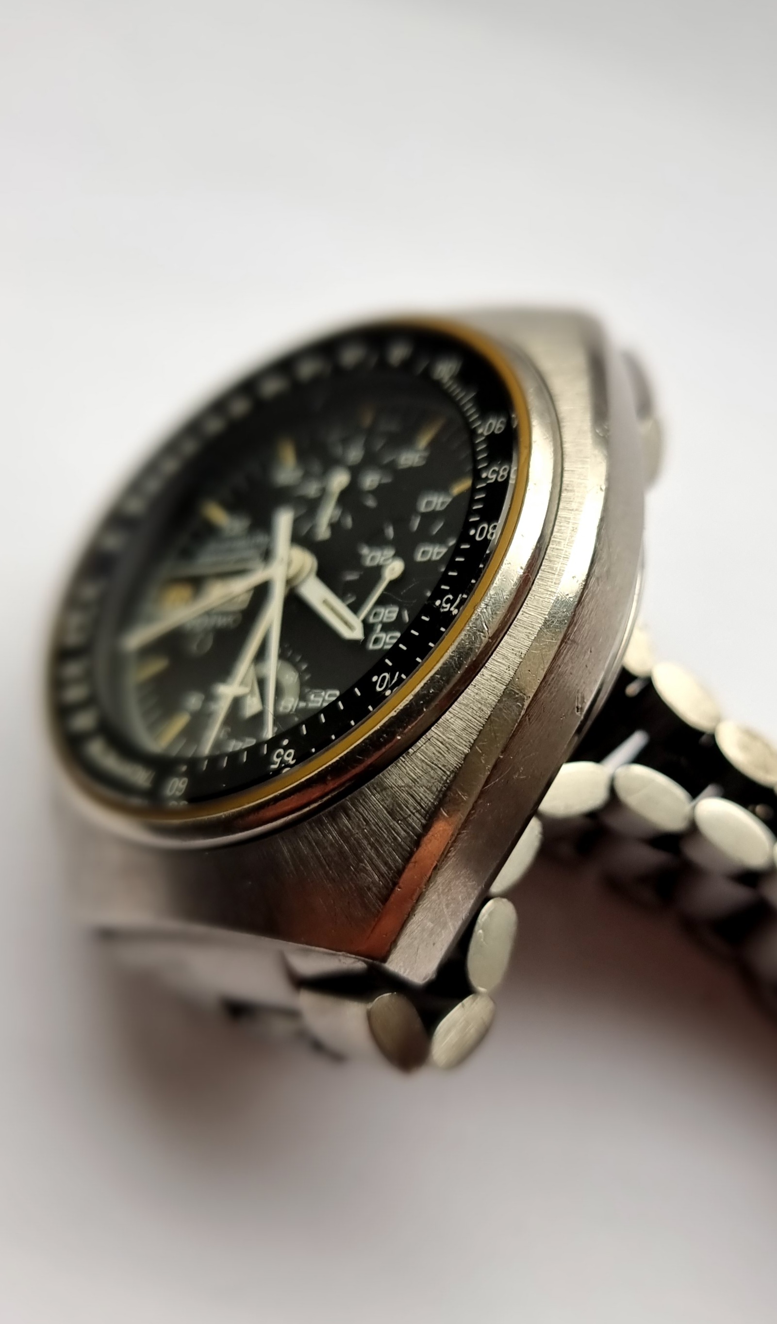 The watch is in good vintage condition and the brush top finish is still visible. There are marks from wear that are commensurate with a watch of this age, but there are no major dents/dings.