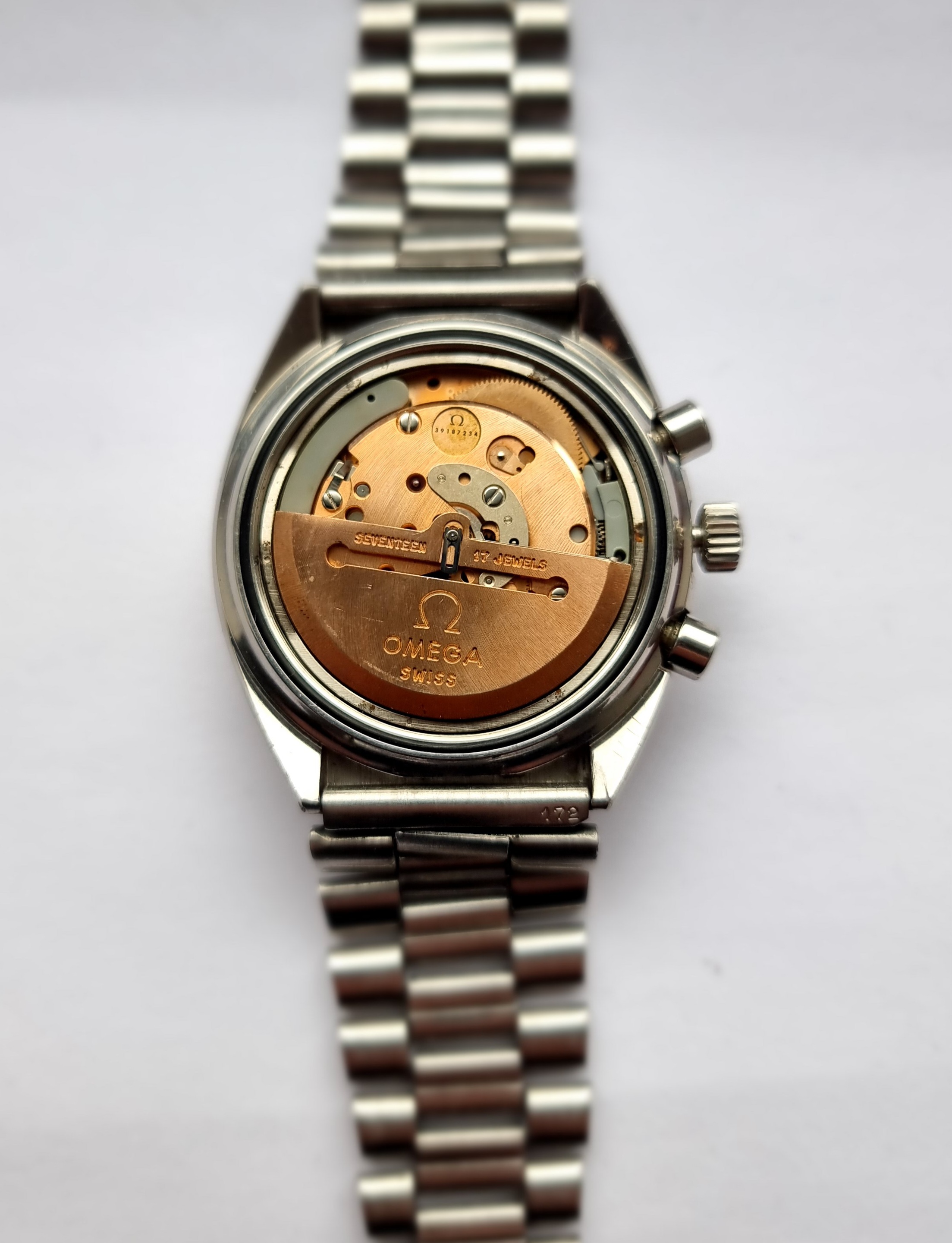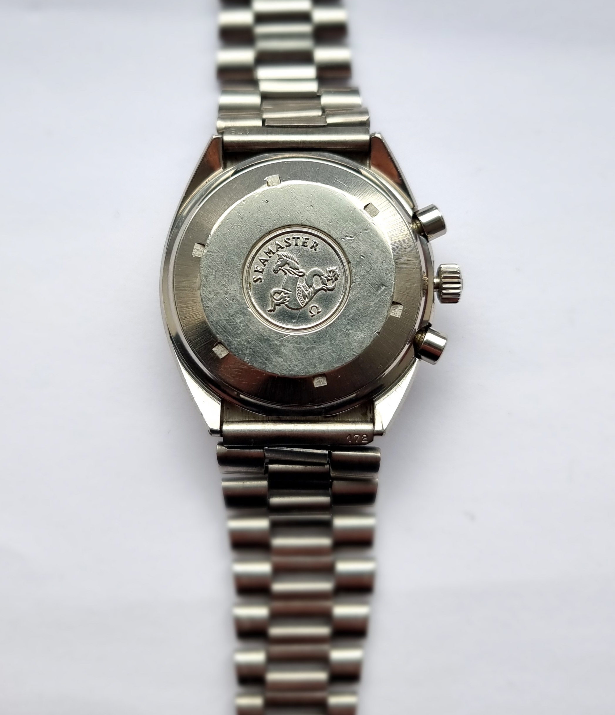The crown and pushers appear original, as does the 1162/172 bracelet and ends. There is some stretch to the bracelet, but it wears fine once on. The clasp is original with trapezoid logo.
