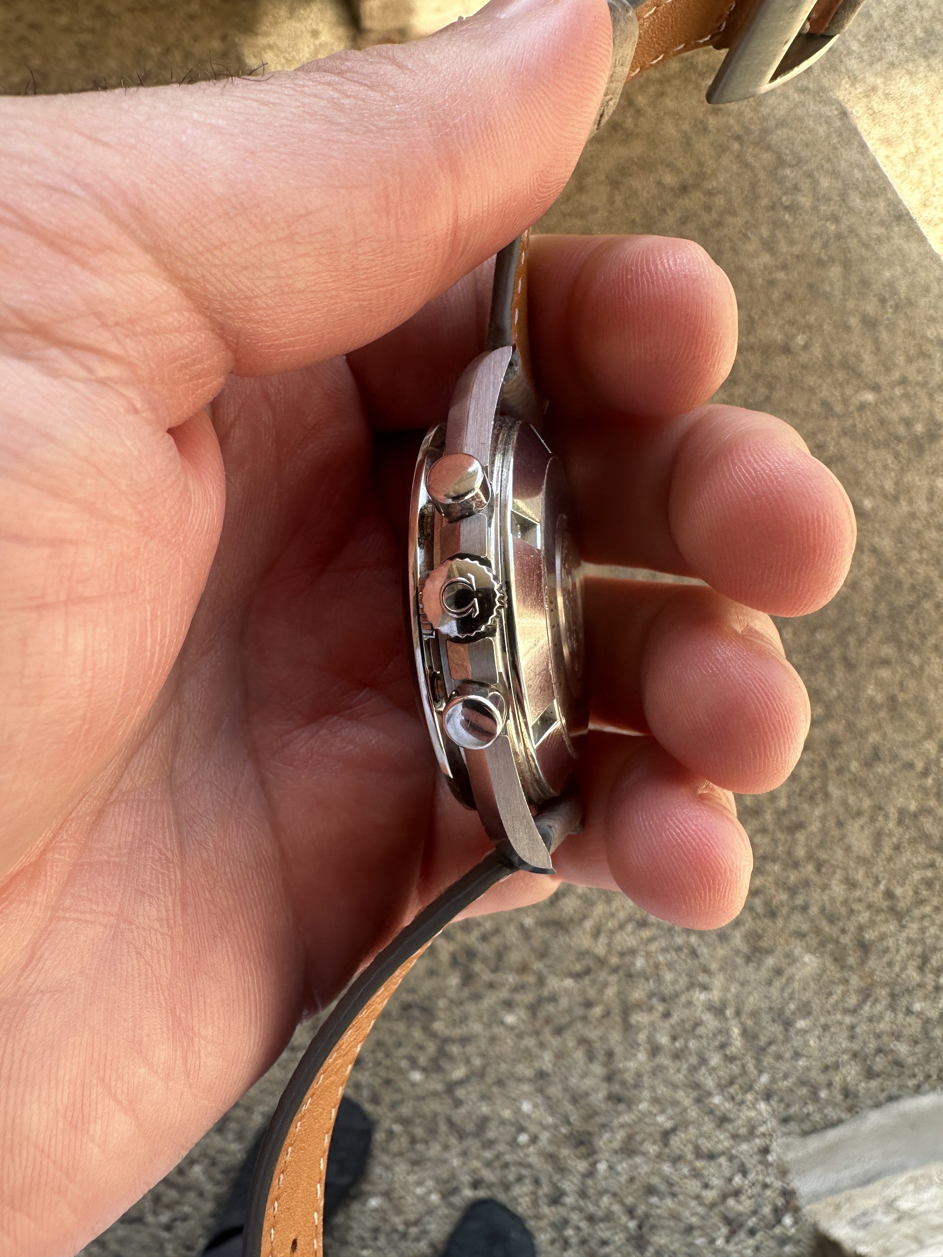 Case - Service case that has been worn, is in nice shape, but does have light scratches and marks as pictured. The bezel is an Omega service part as well.