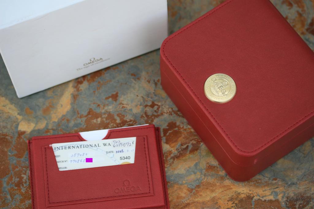 Comes as complete set with Omega boxes, manuals, warranty card, matching hang tag. If you are familiar with this style boxes, these are usually peeled and in bad shape (along with the card holder). This set is in excellent condition surprisingly.