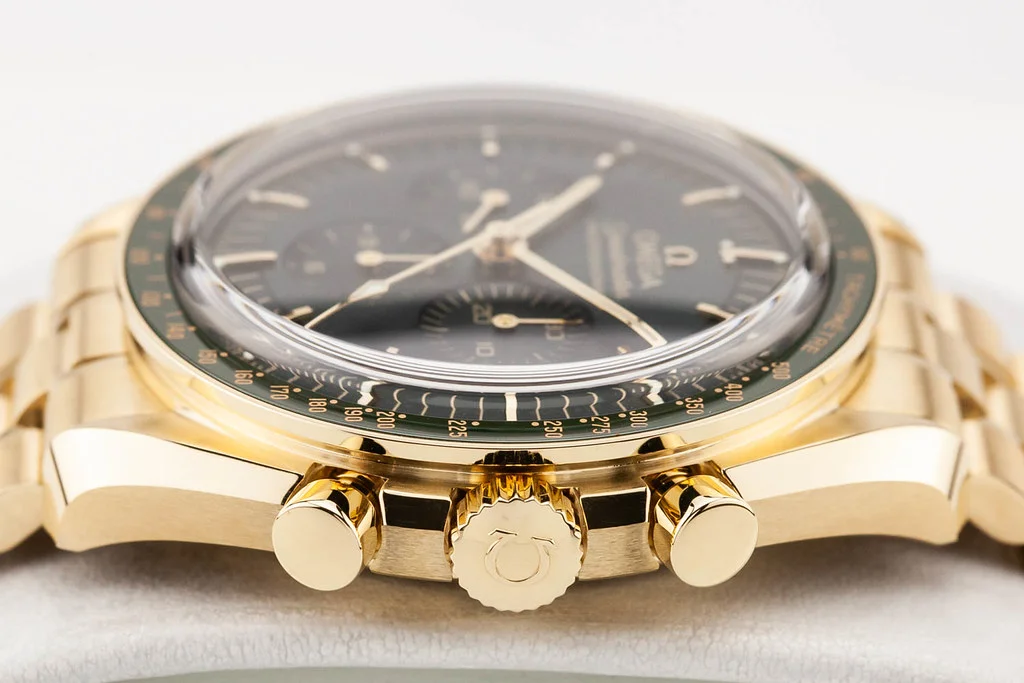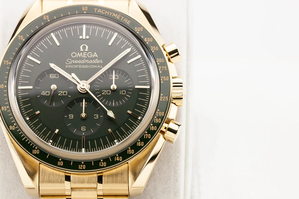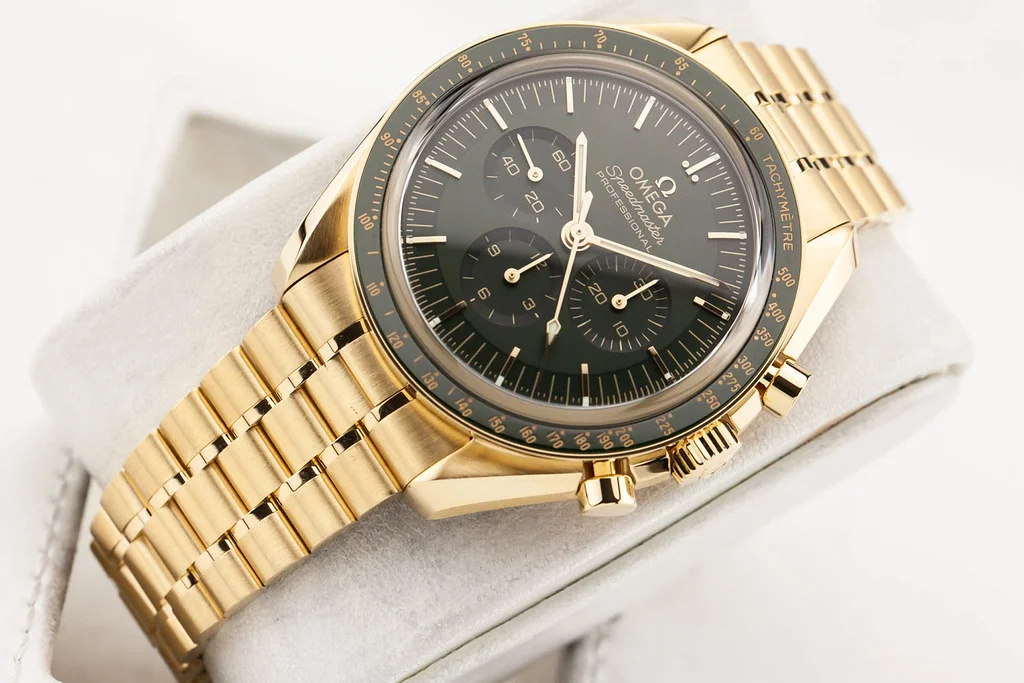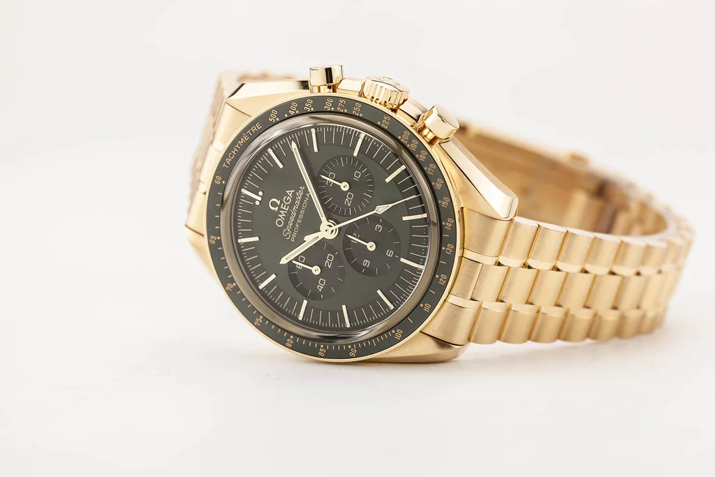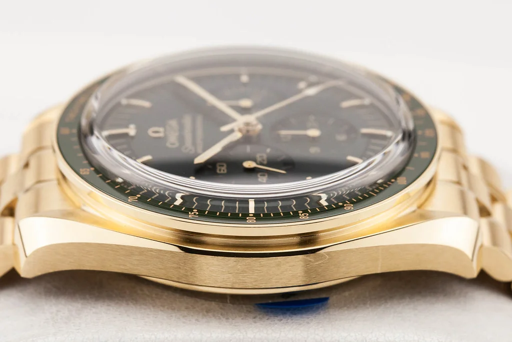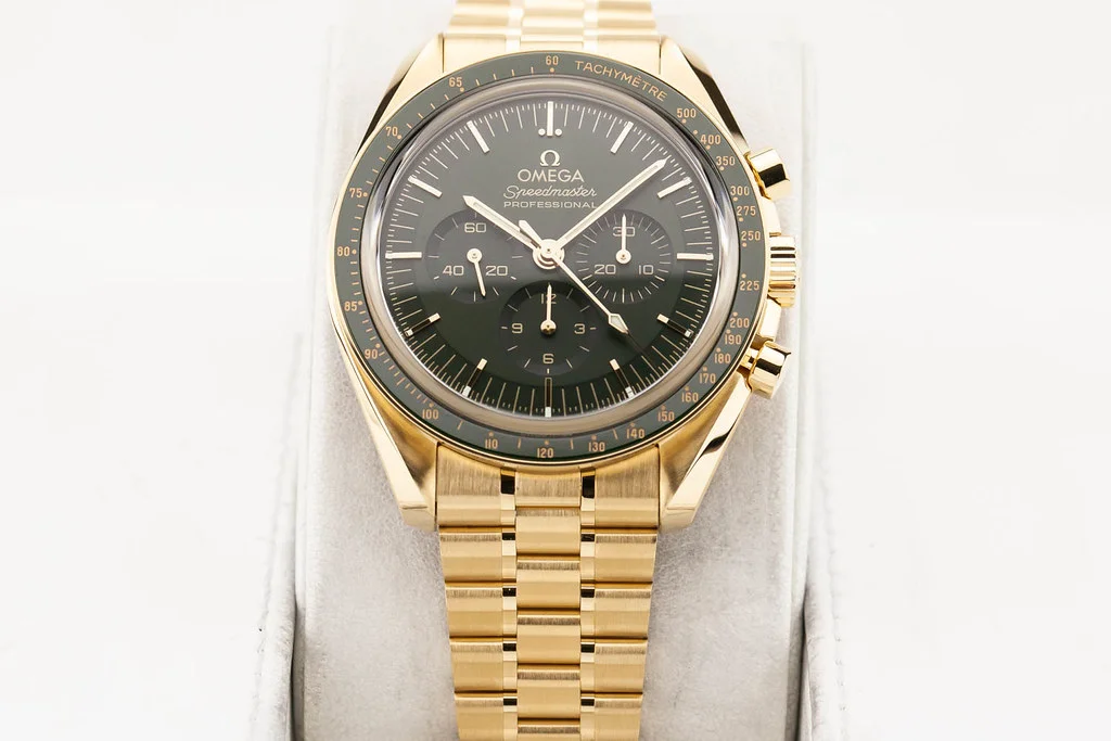 ·Up for sale is an unworn condition Omega Speedmaster Moonwatch Professional Moonshine Gold, reference # 310.60.42.50.10.001. Slight handling mark on case side, but is otherwise unworn and unsized. It comes complete with all boxes, papers, booklets, hang tag and Omega Warranty Card dated March 2025.
