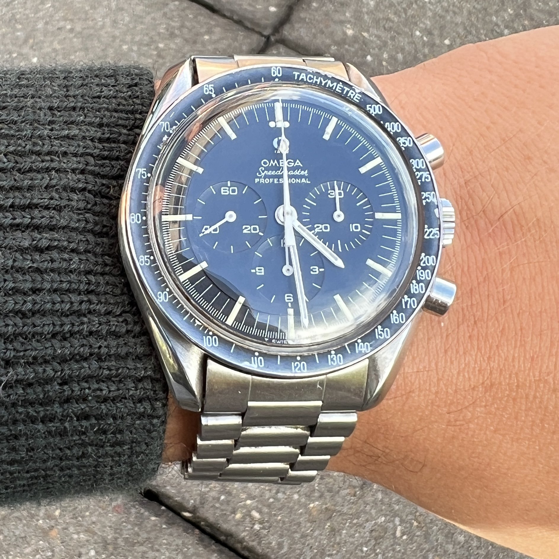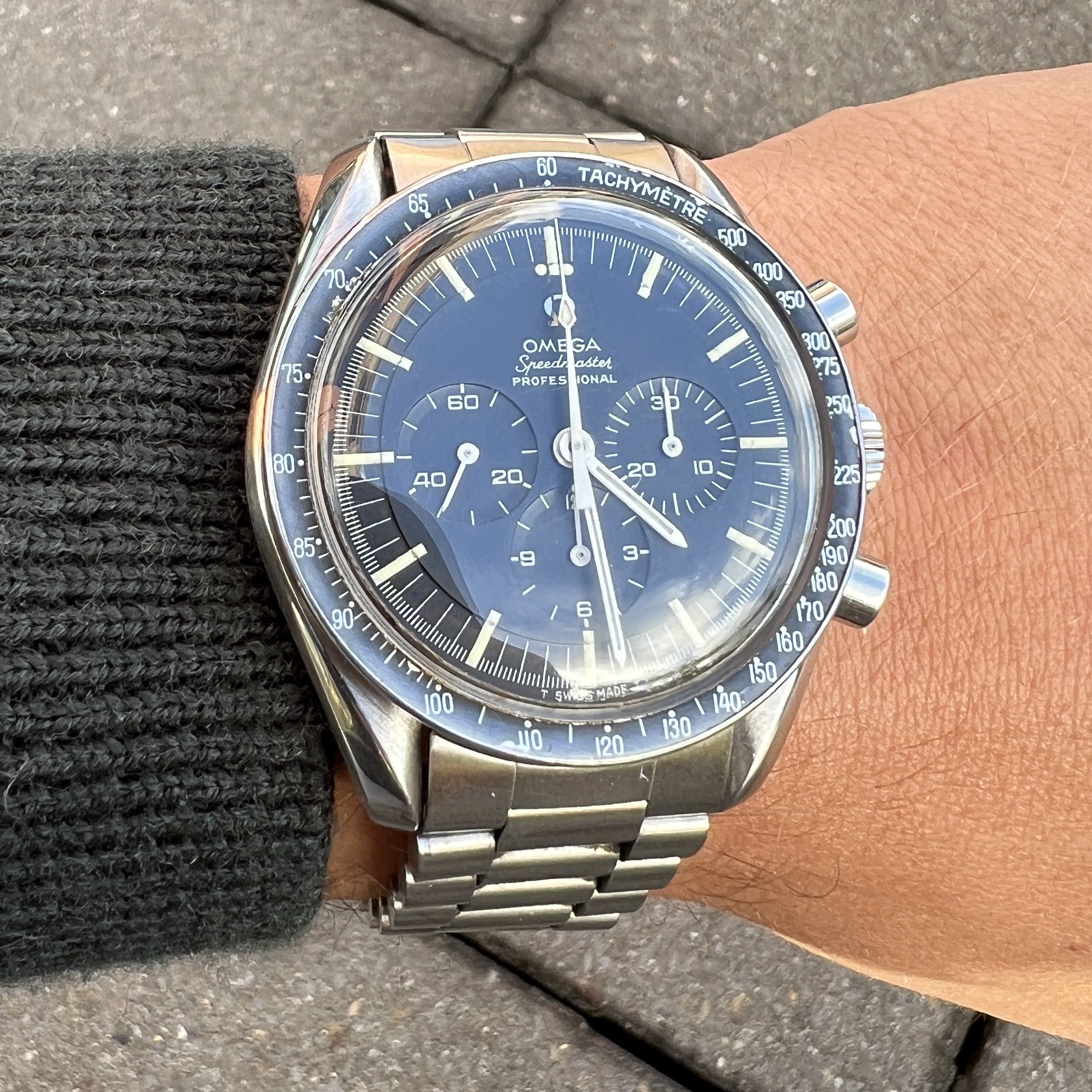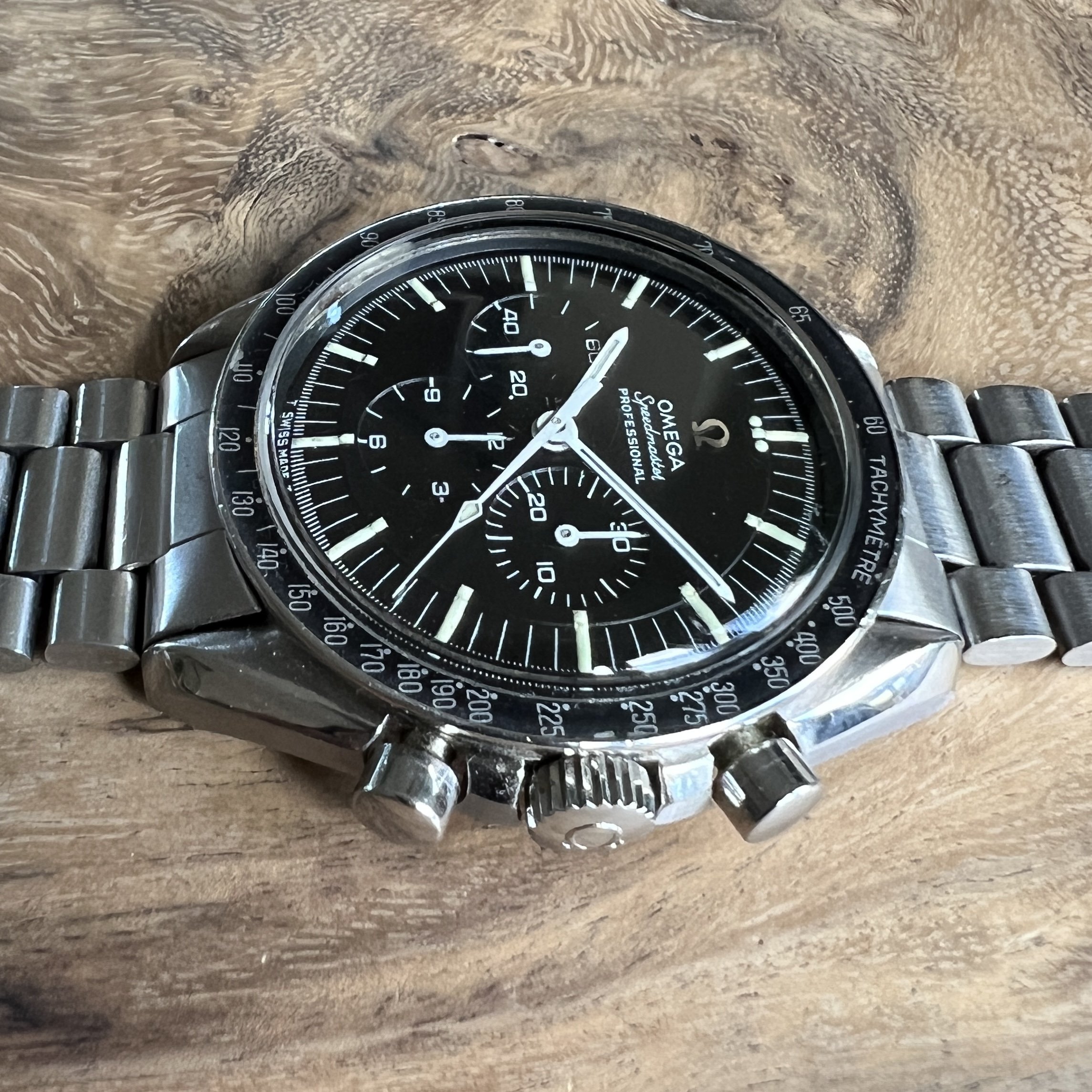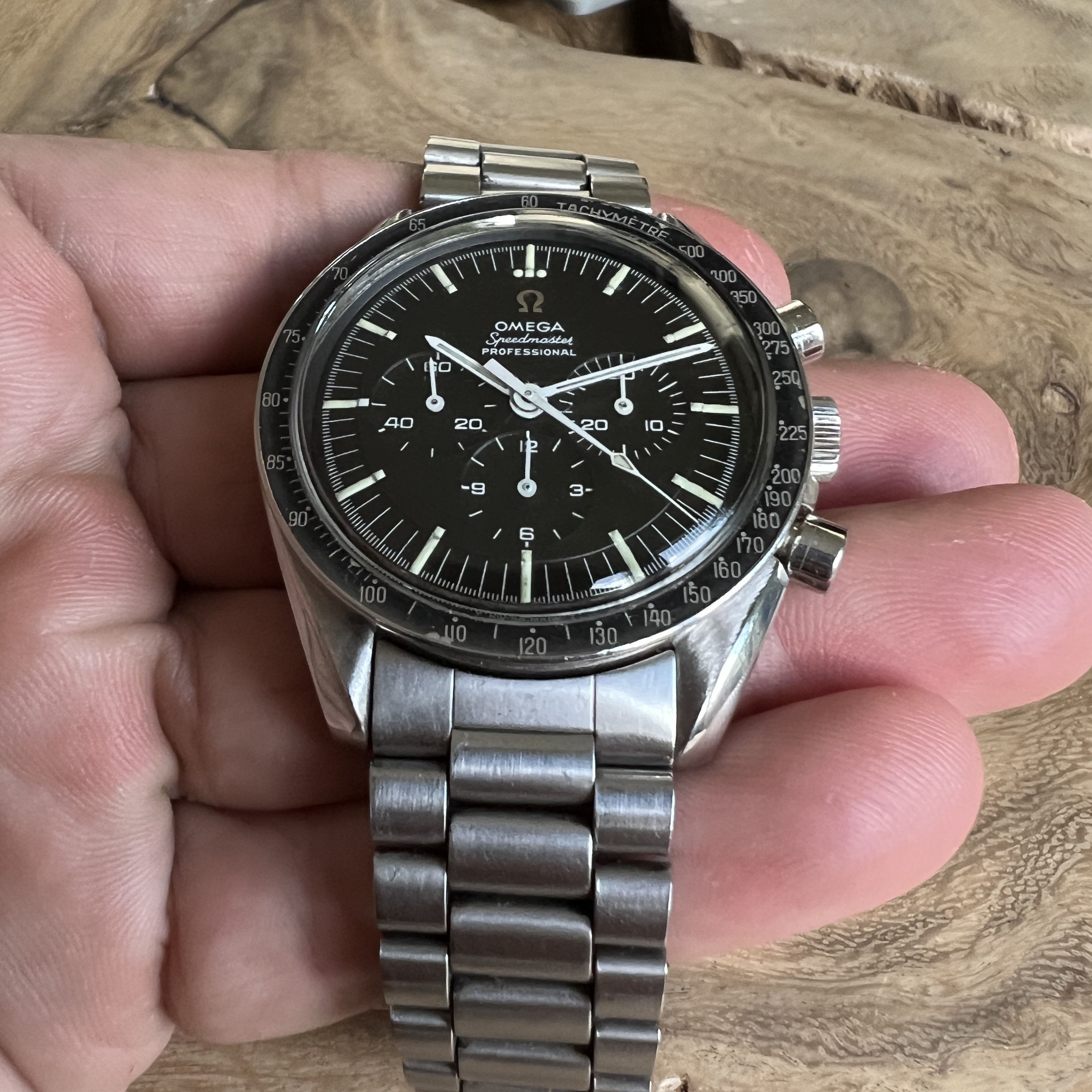 I did manage to contaminate a friend of mine into owning multiple Speedmasters and originally sourced this one for him. He did not bond with this piece as much as with the birth year Speedmaster I got him too, so I've bought it back. After long consideration, I'm now listing it for sale as I have another, cleaner, example of the same reference.