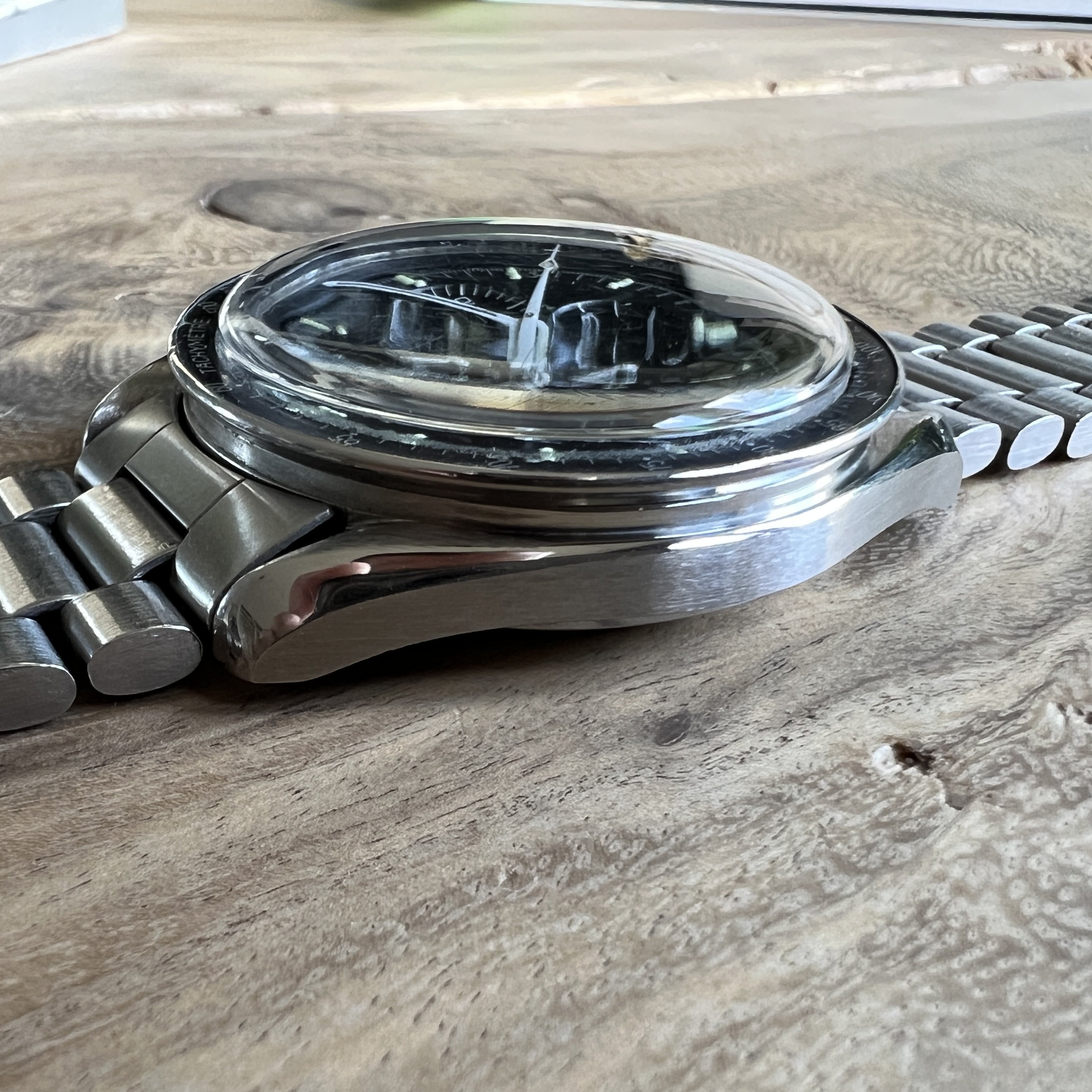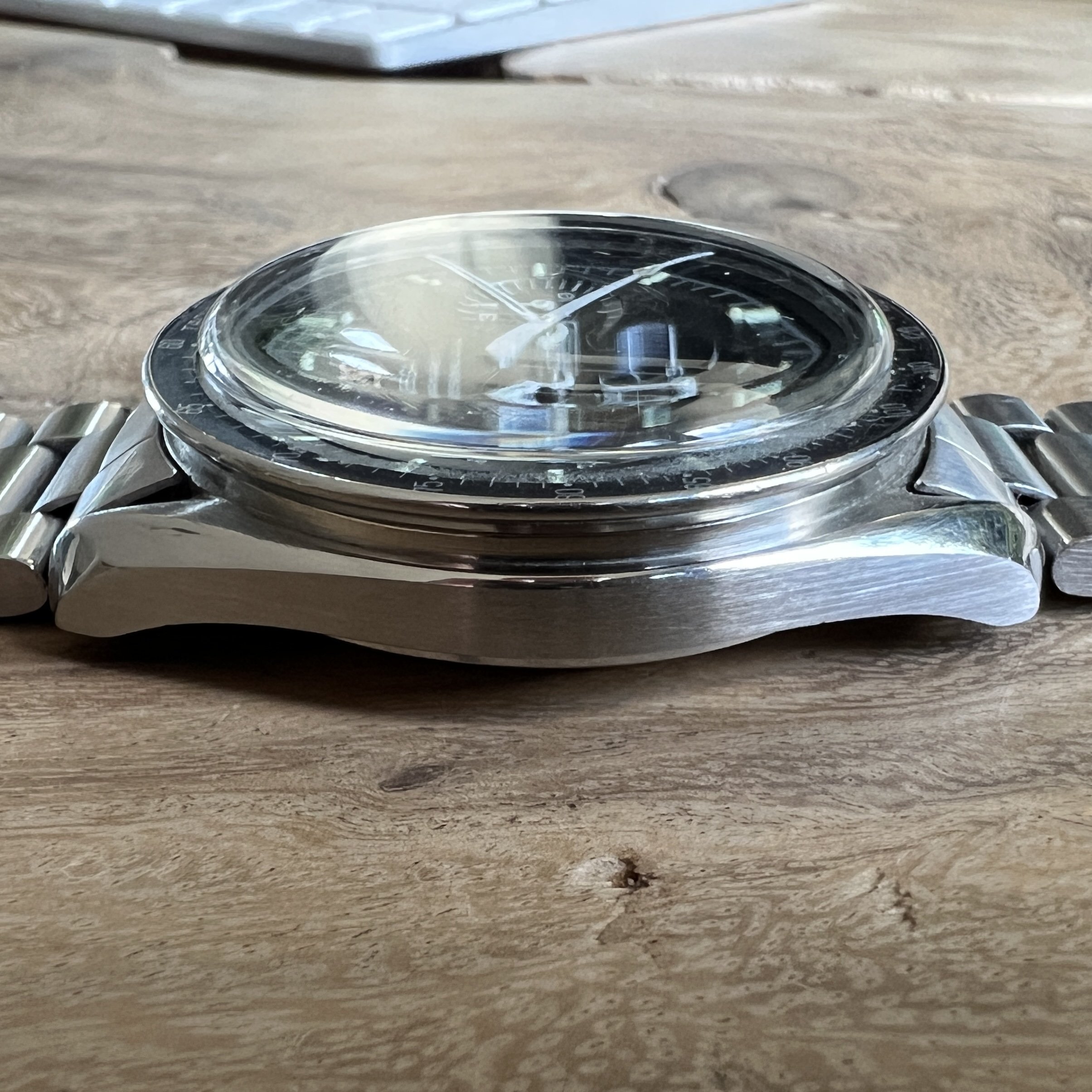 Bezel: Original DON bezel in with some light chips and fading, complementing the dial nicely. The edge of the bezel is smooth, except for two minor dents around the Tachymètre script.