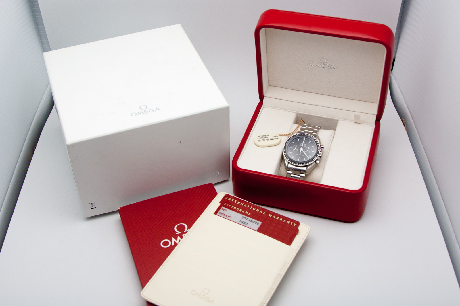 ·Omega Speedmaster Moonwatch Professional 42m, 3573.50.00, “Sapphire Sandwich.” Mint condition showing very minor surface wear with no significant scratches or marks anywhere, and running perfect. Includes everything in photos; boxes, hang tag, Pictogram Card and International Warranty cards (warranty card stamped by Omega AD and dated Sept 2011). Powered by Omega 1863 manual wind, rhodium plated with 48 hour power reserve. Photos are of actual watch for sale, serial numbers removed from photos, but in tact/matching on actual watch and cards. Always accepting trades and buyer on modern Omegas. Item as described or refund minus shipping.