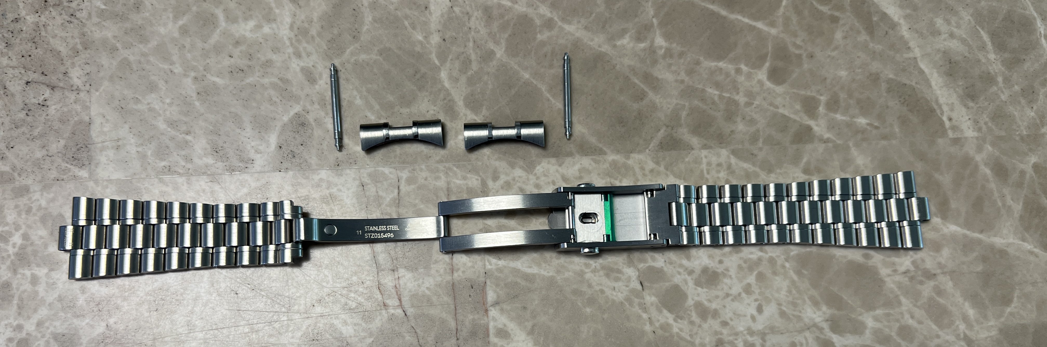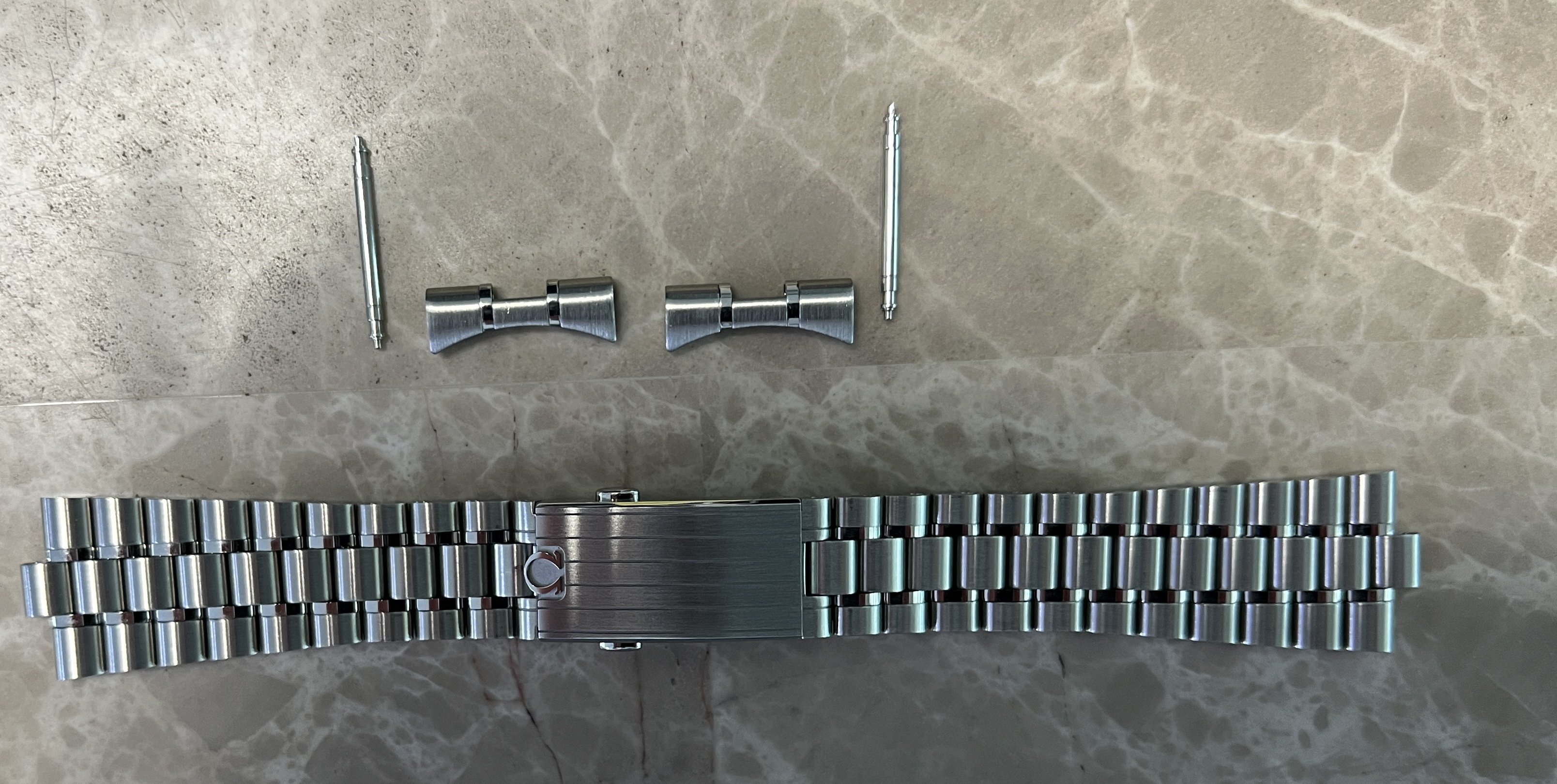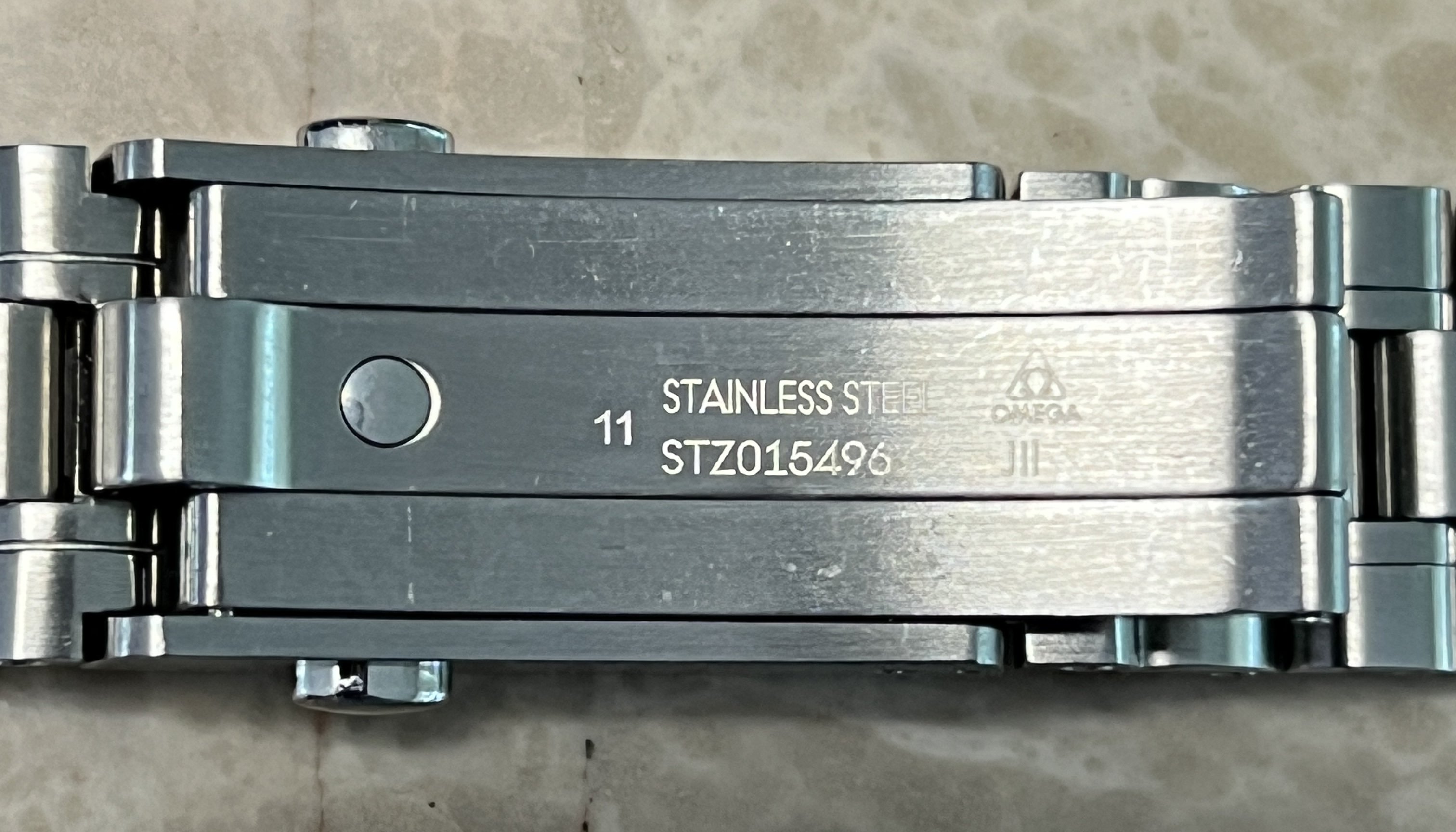 ·For sale ($600 OBRO) have a genuine 20 MM Omega Speedmaster 3861 bracelet. This bracelet comes from factory on the Speedmaster 3861 sapphire sandwich and has the polished inner links but can also be used on the Hesalite model as well. The bracelet reference is STZ014753 and the clasp (pin length adjustment) reference is STZ015496.