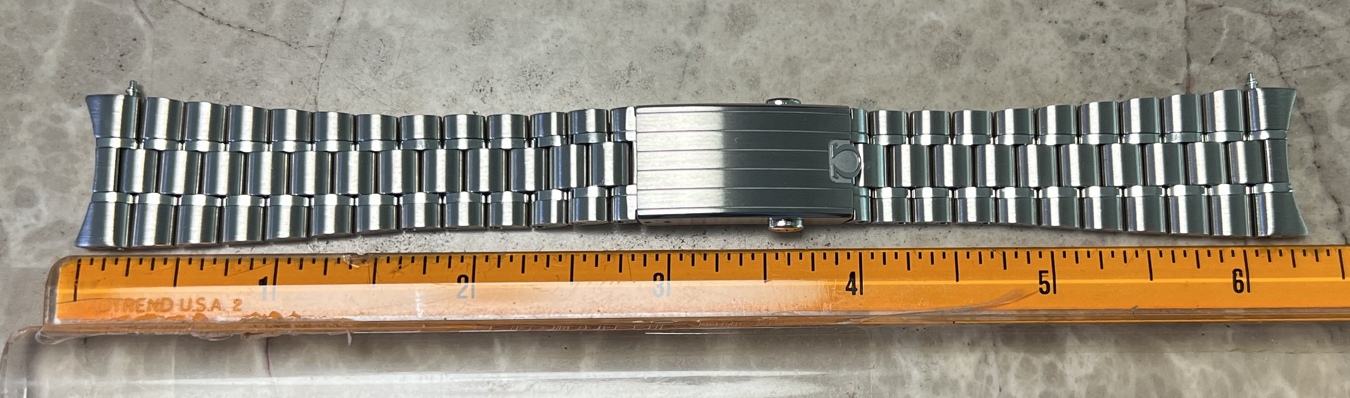 The bracelet is in excellent conditions as shown and has a total of 8 removable links; its length with the extension at the clasp in is 6 5/16 inches (as shown on the picture below) and would fit at least a 7 inch wrist when installed on the watch head. It comes as shown with the stainless steel endlinks and the springbars. The bracelet is a popular upgrade for the older Speedmaster professional watches as it contours pretty well on wrists due to its female end link design (different springbars may be needed to fit on older Speedmasters.)