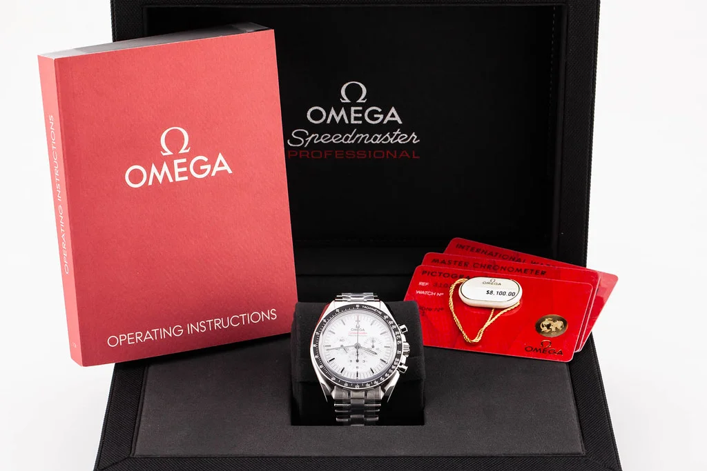 ·Up for sale is a brand new Omega Speedmaster Moonwatch Professional White Dial Sapphire on Bracelet, reference # 310.30.42.50.04.001 It comes complete with all boxes, papers, booklets, hang tag and Omega Warranty Card dated January 2025.