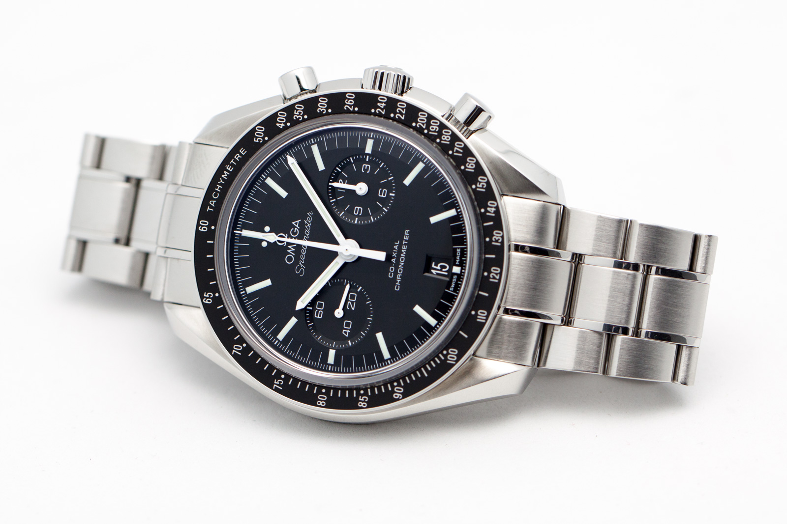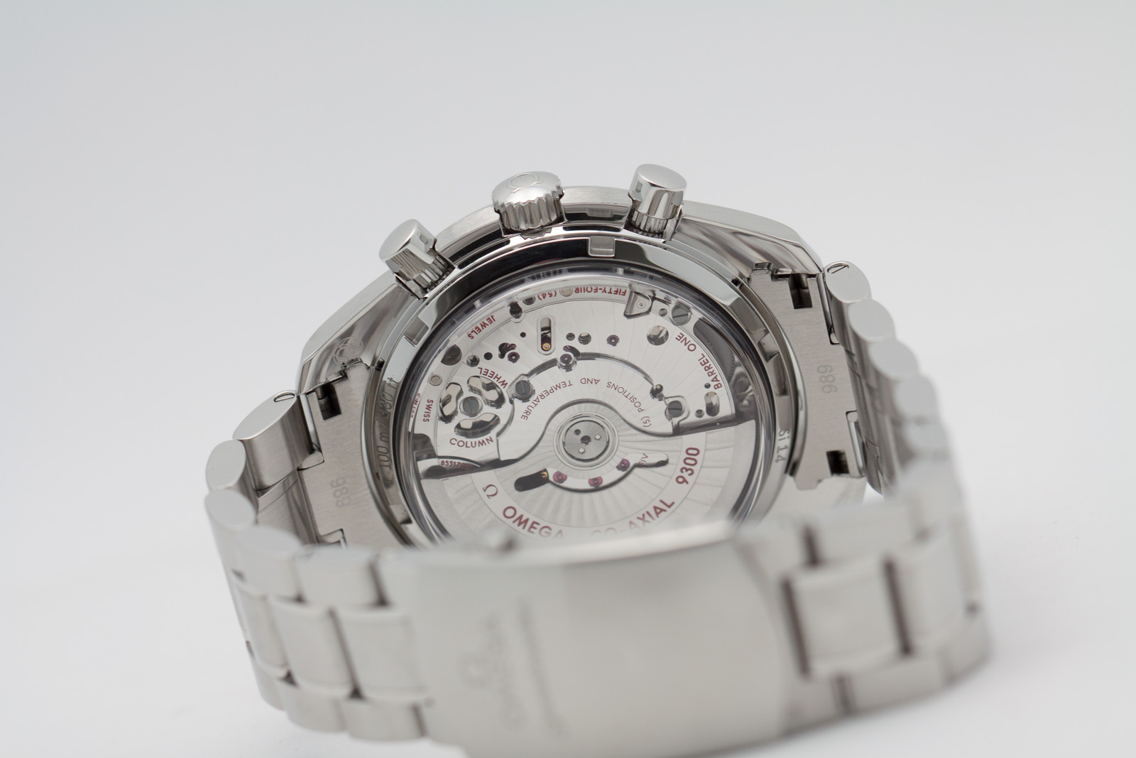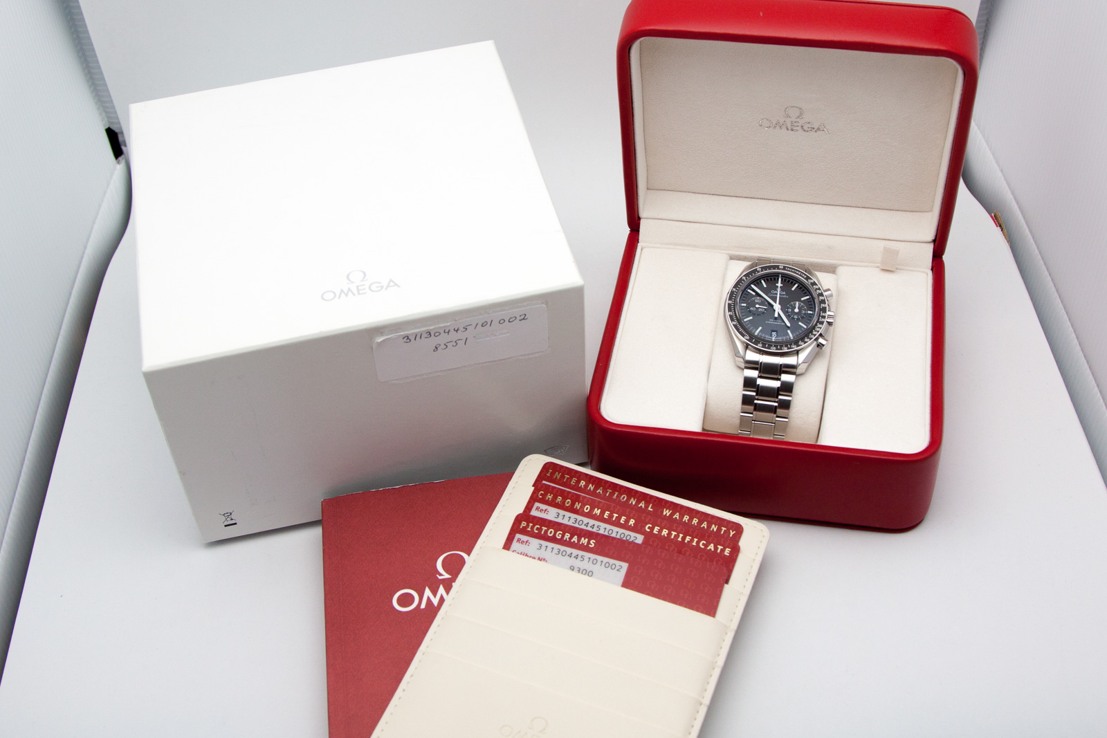 ·Omega Speedmaster Moonwatch Co-Axial Chronograph, 44.25m, 311.30.44.51.01.002. 96% MINT throughout with no dings or nicks, crystal is perfect, runs perfect. Excellent amplitude and running spot on at +/- 0 seconds per day. Powered by Omega 9300 automatic movement with column wheel and co-axial escapement, 60 hour power reserve. Includes everything pictured; boxes, Pictogram Card, COSC Card and International Warranty card (warranty card stamped by US AD and dated Mar 2014). Photos are of actual watch for sale, serial numbers removed from photos, but in tact/matching on actual watch and cards. Always accepting trades and buyer on modern Omegas, Zenith, IWC, Breitling, PAM and Tag. Item as described or refund minus shipping.