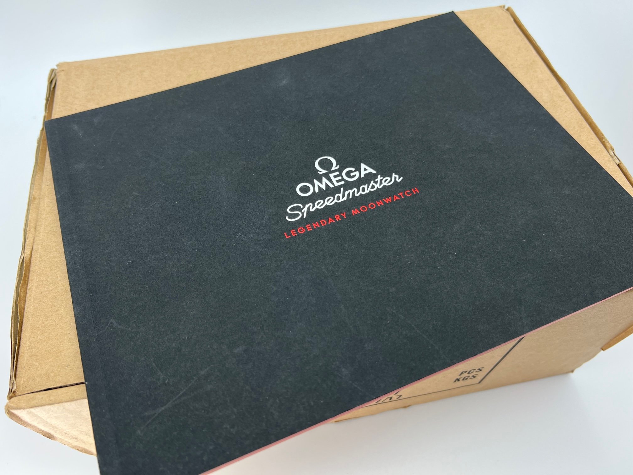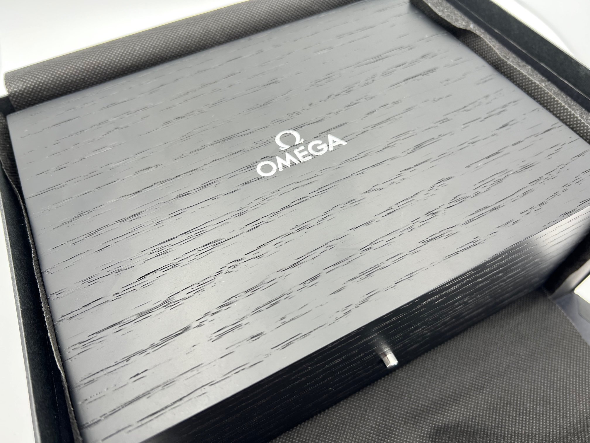 - Outer black Omega box with protective sleeve
