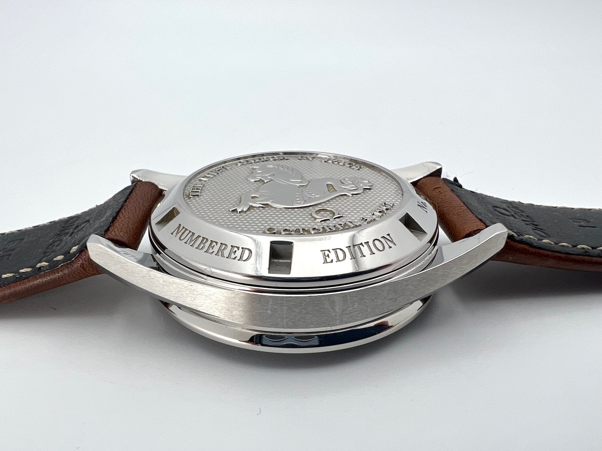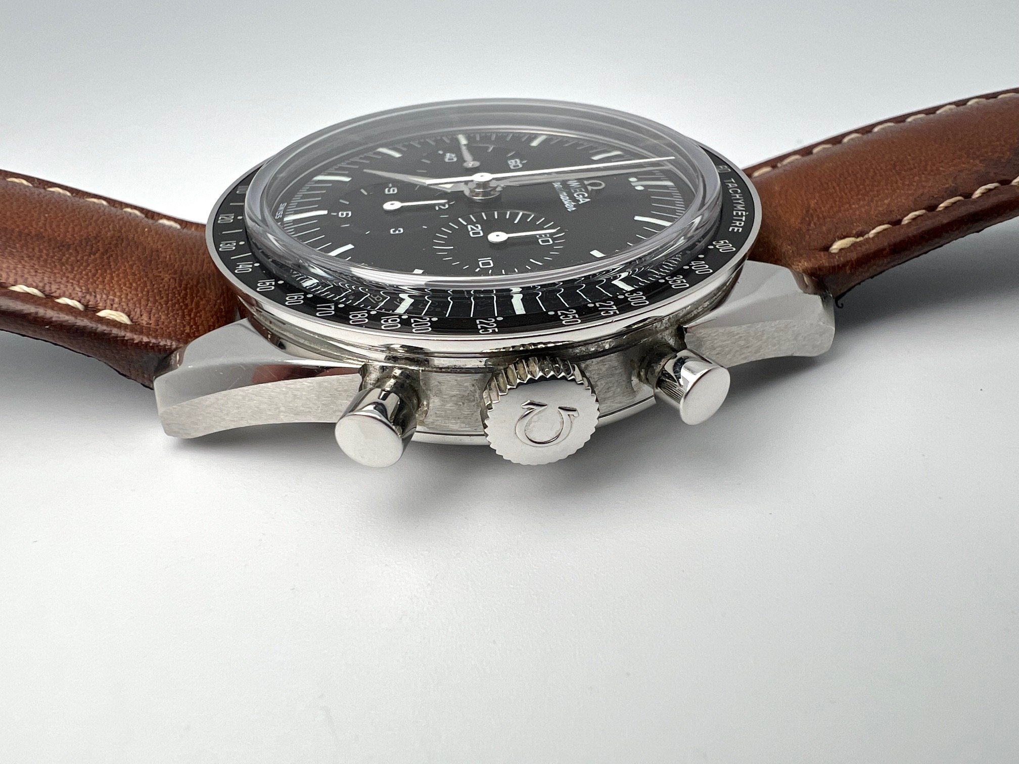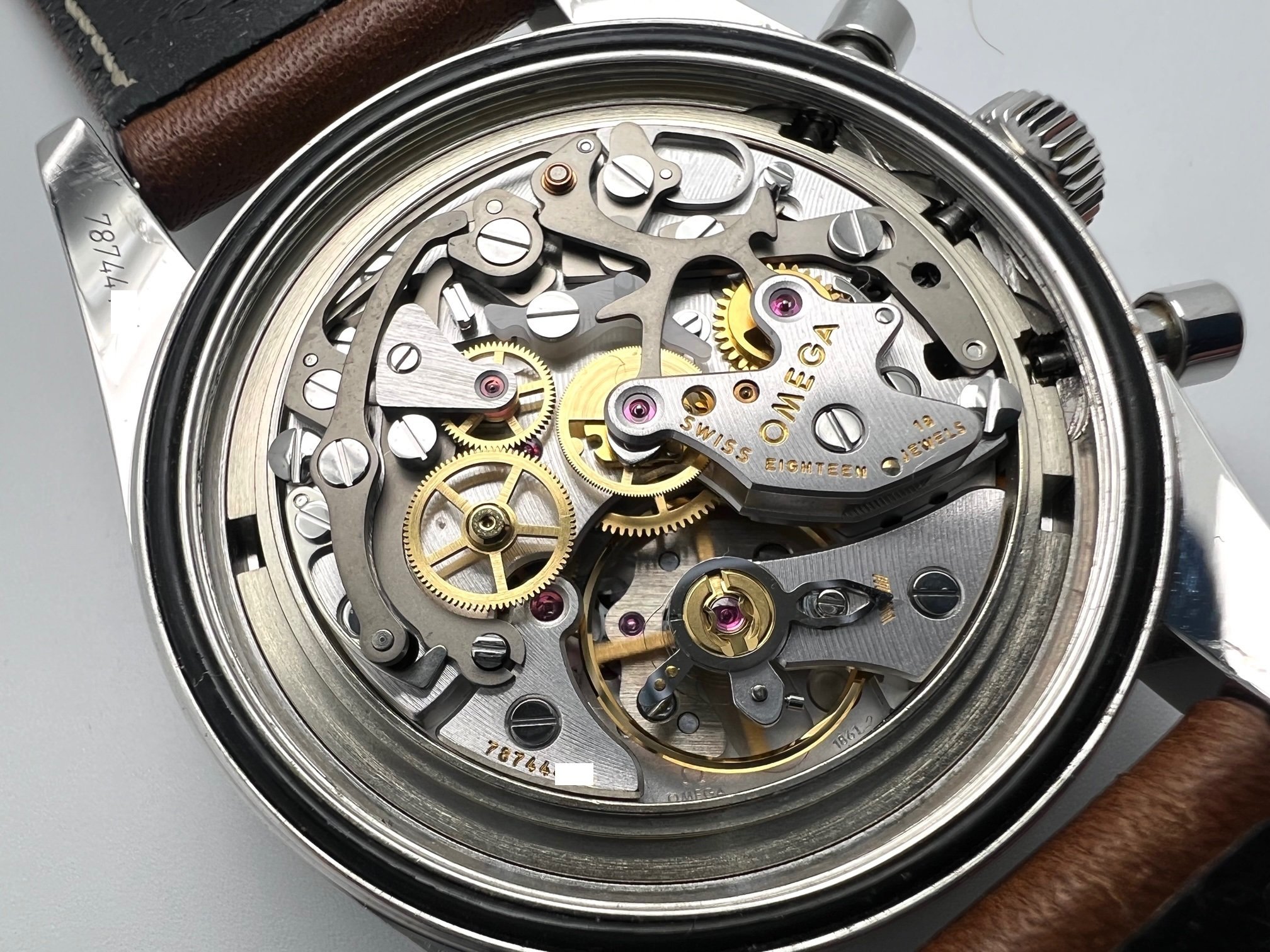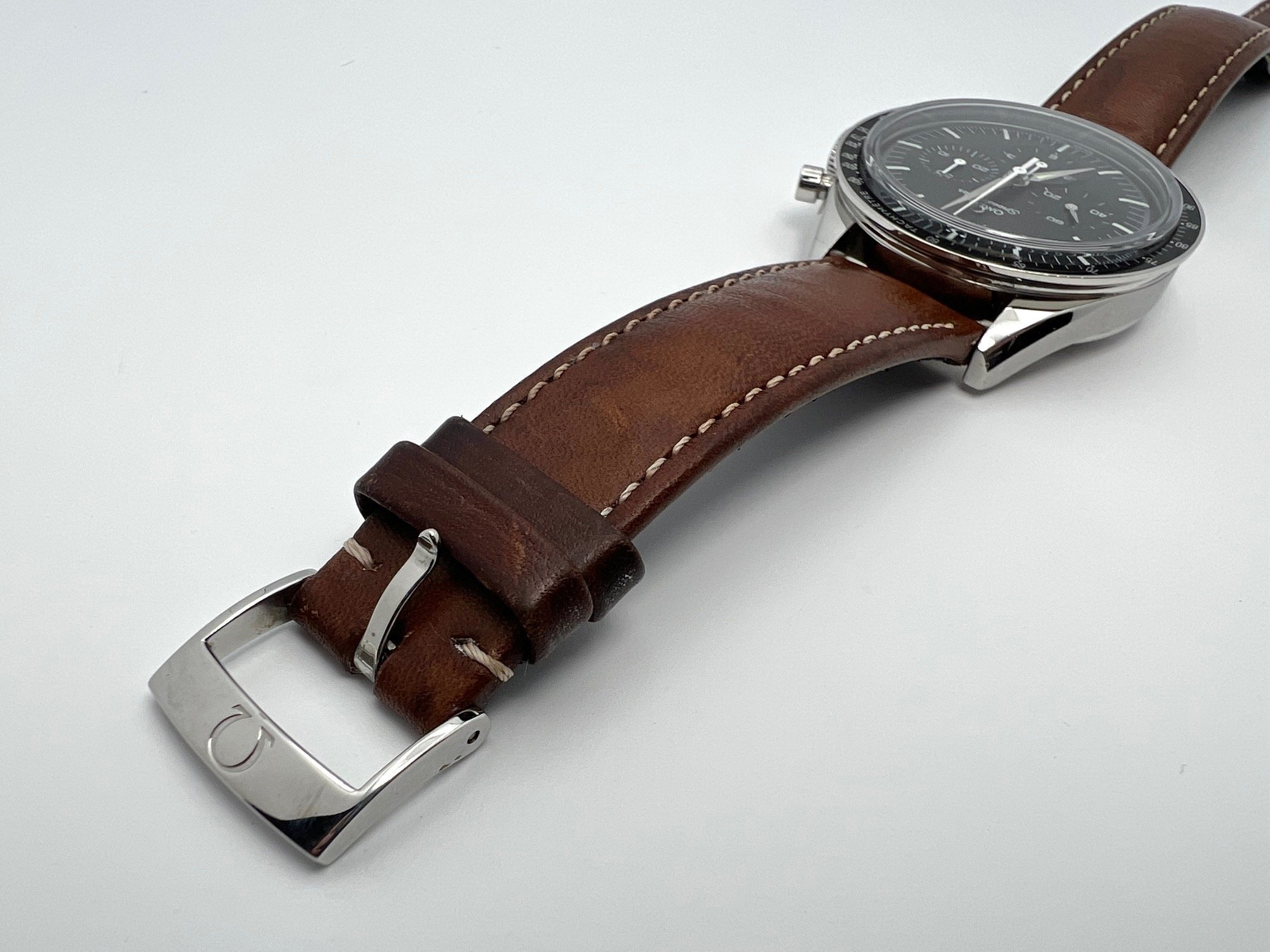 The watch comes on the original brown calf strap. The watch is in overall very good condition with some surface scratches and scuffs from normal wear. The strap shows some wear, but has plenty of life left. The watch is functioning as it should - chronograph starts, stops, and resets as it should and it is currently keeping good time.