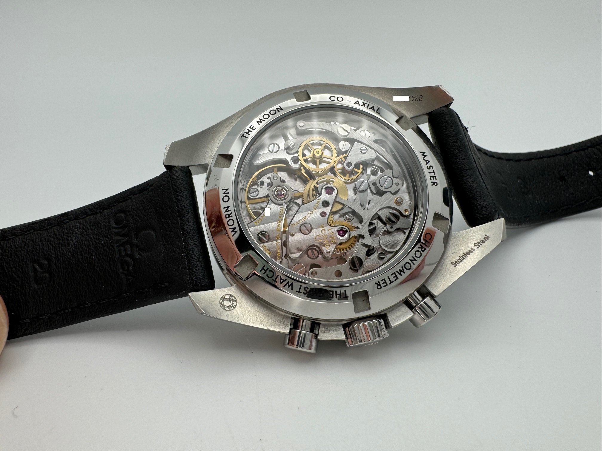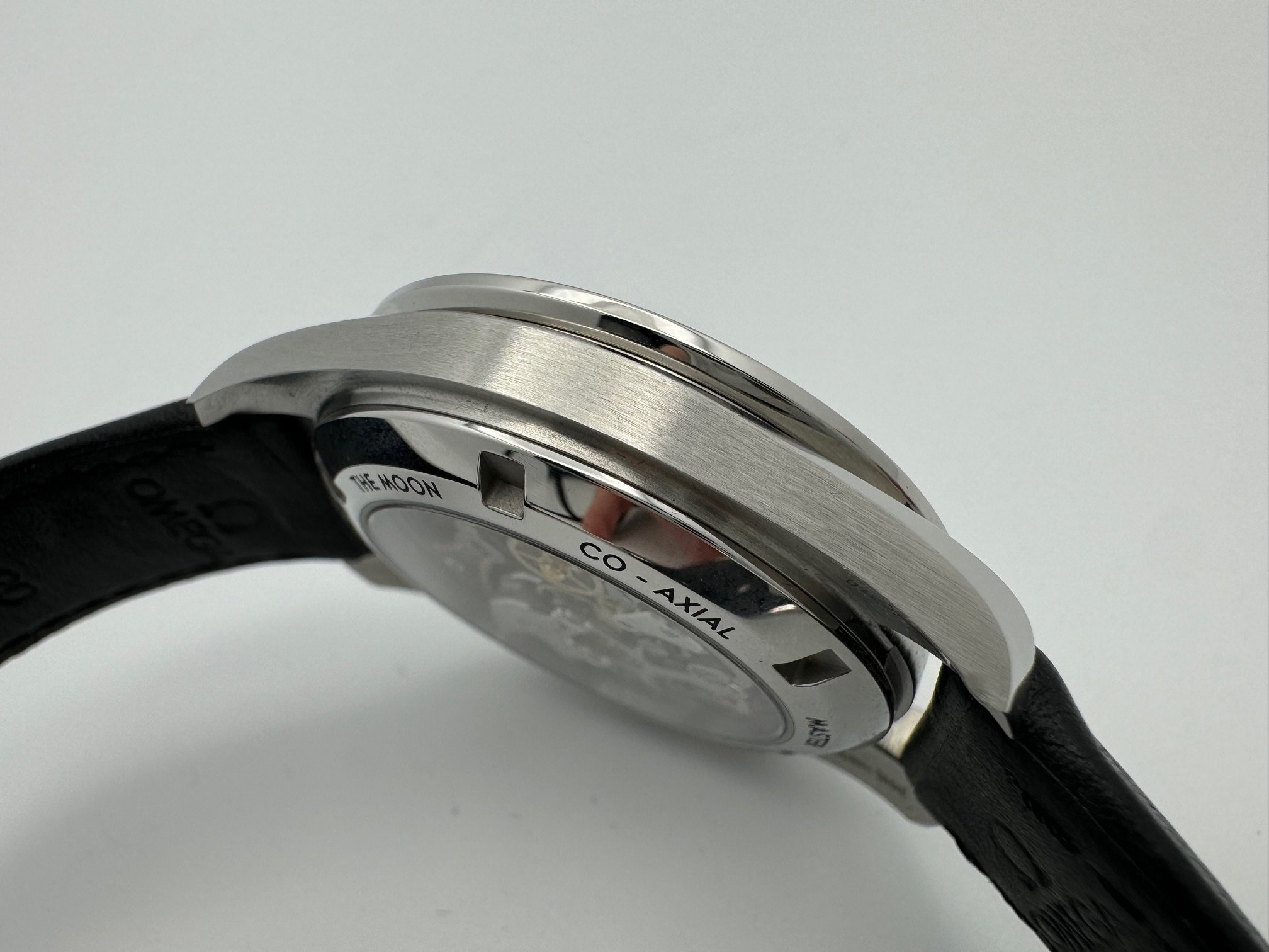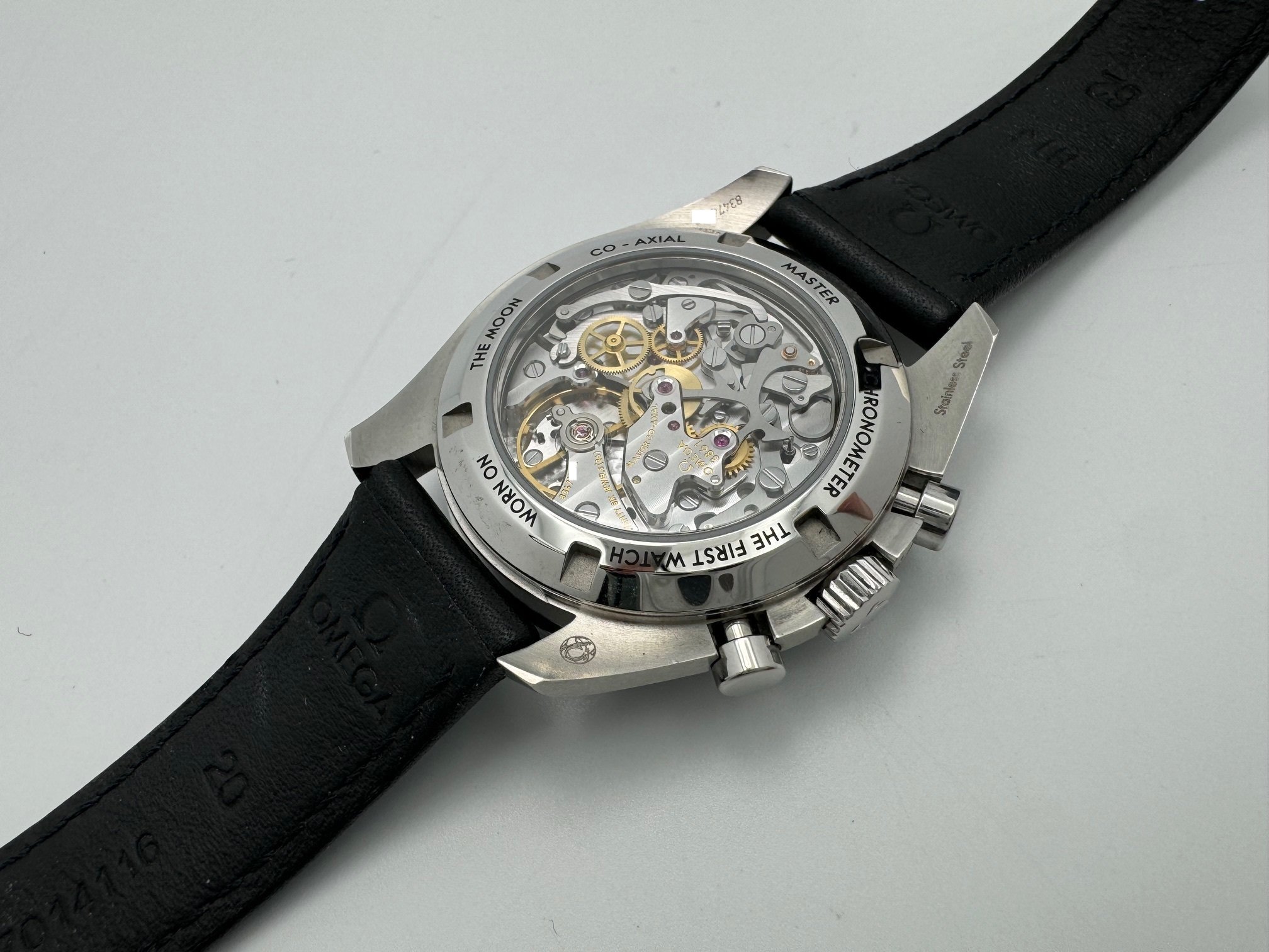 This is the current 42mm stainless steel model featuring sapphire glass on the front as well as the caseback to reveal the stunning OMEGA Co-Axial Master Chronometer Caliber 3861 movement. Inspired by the 4th generation Speedmaster style worn on the moon, it also includes an asymmetrical case, black step dial with applied OMEGA logo and the famous dot over 90 on the anodised aluminium bezel ring.