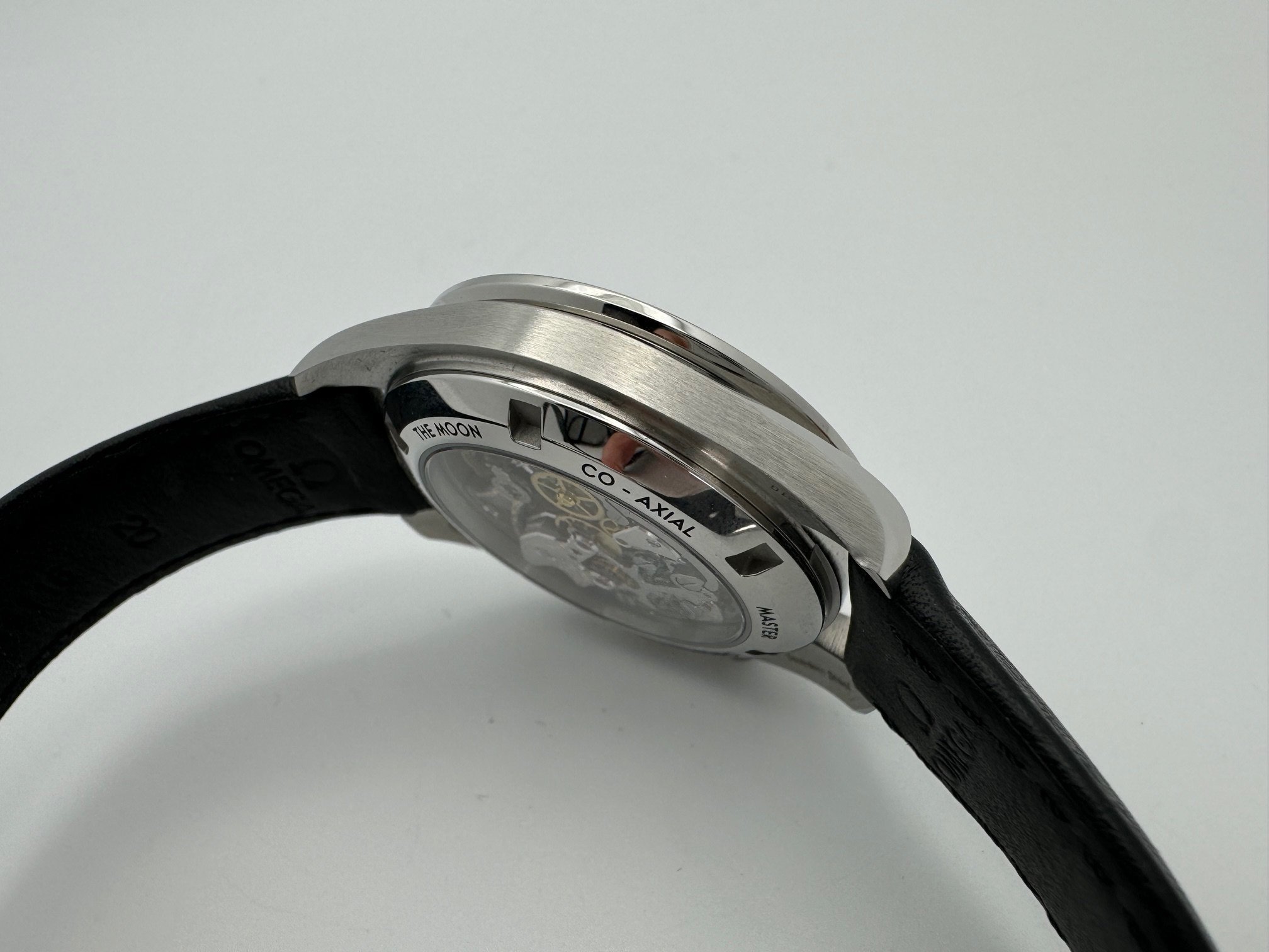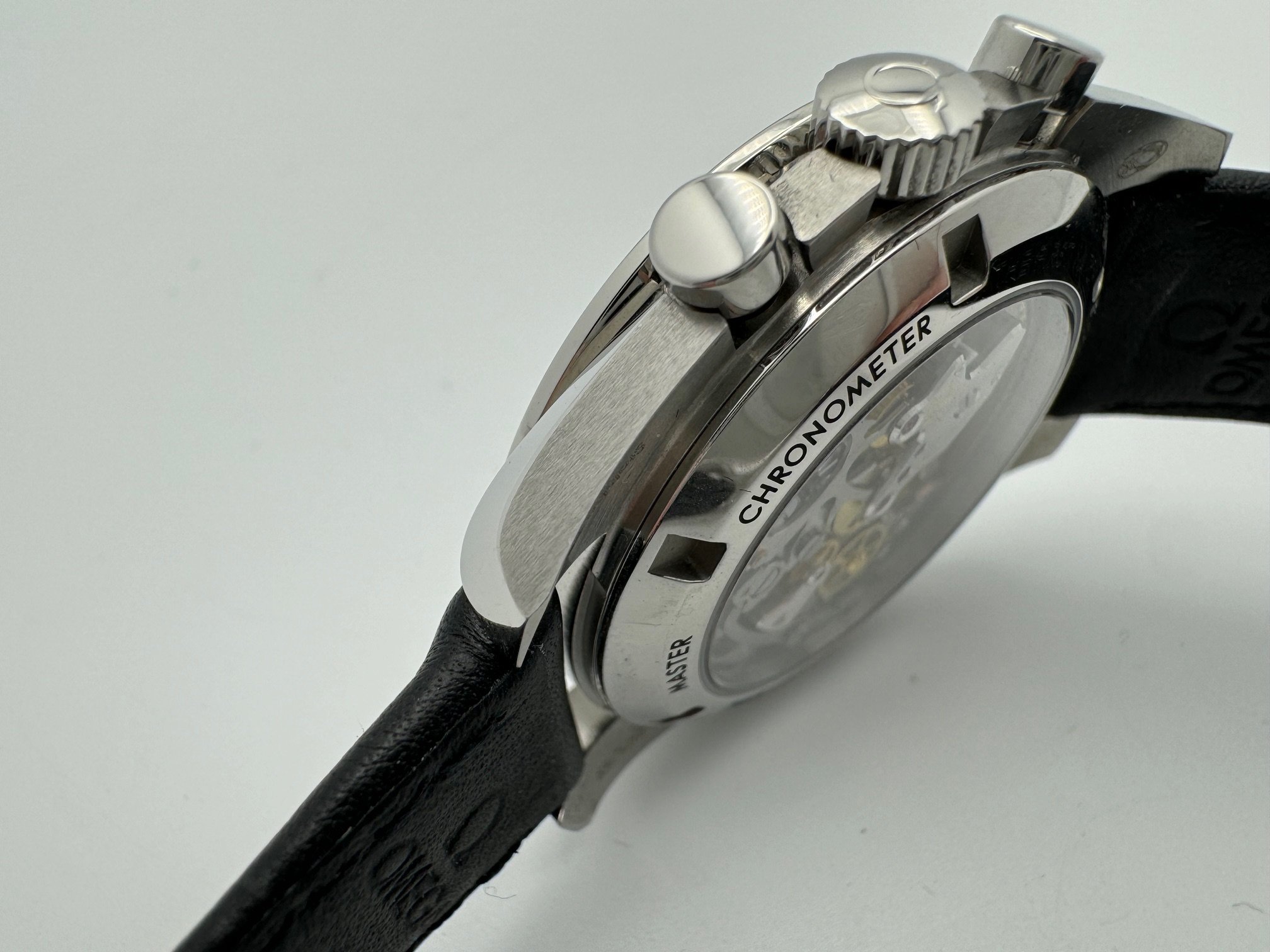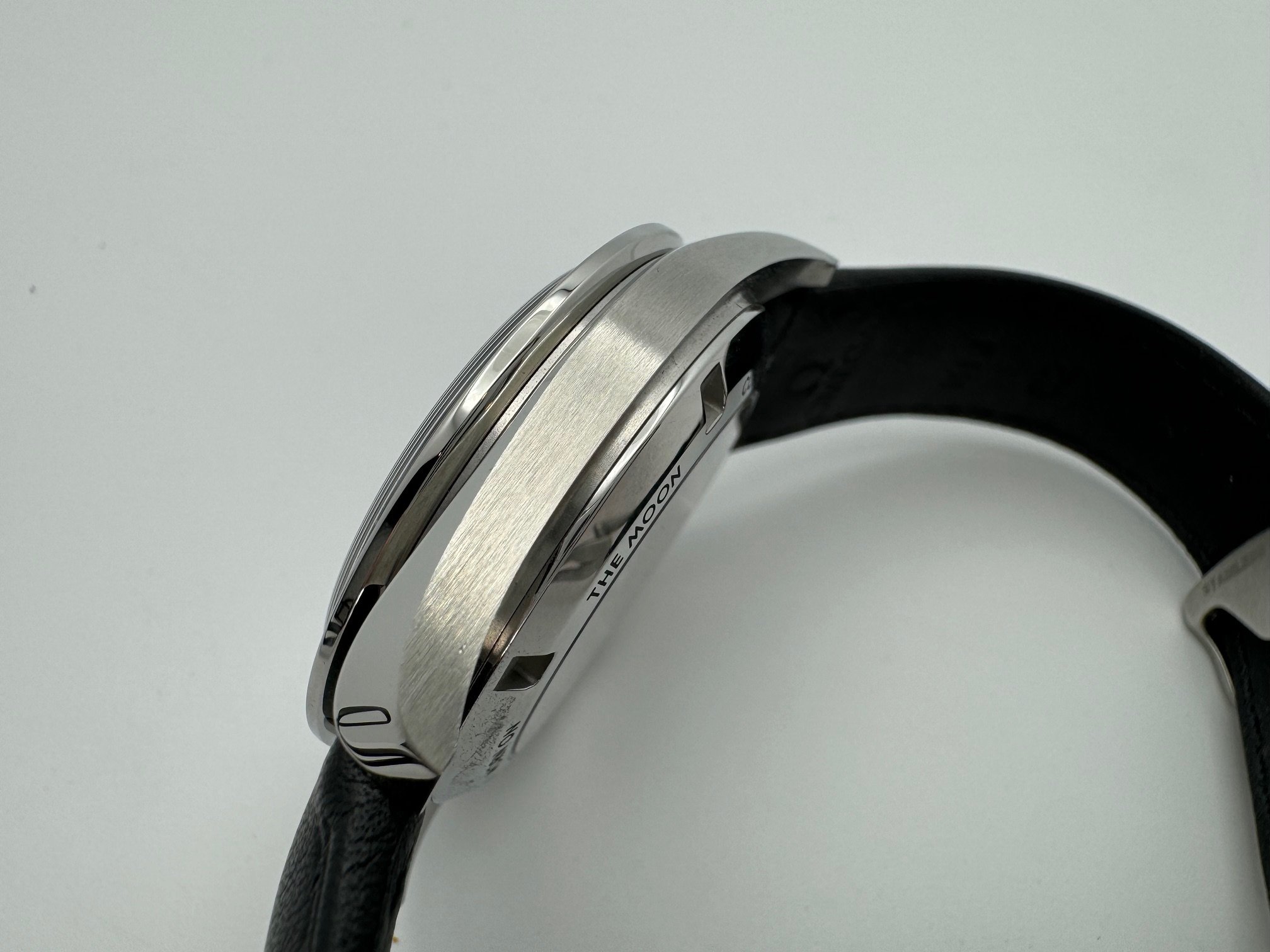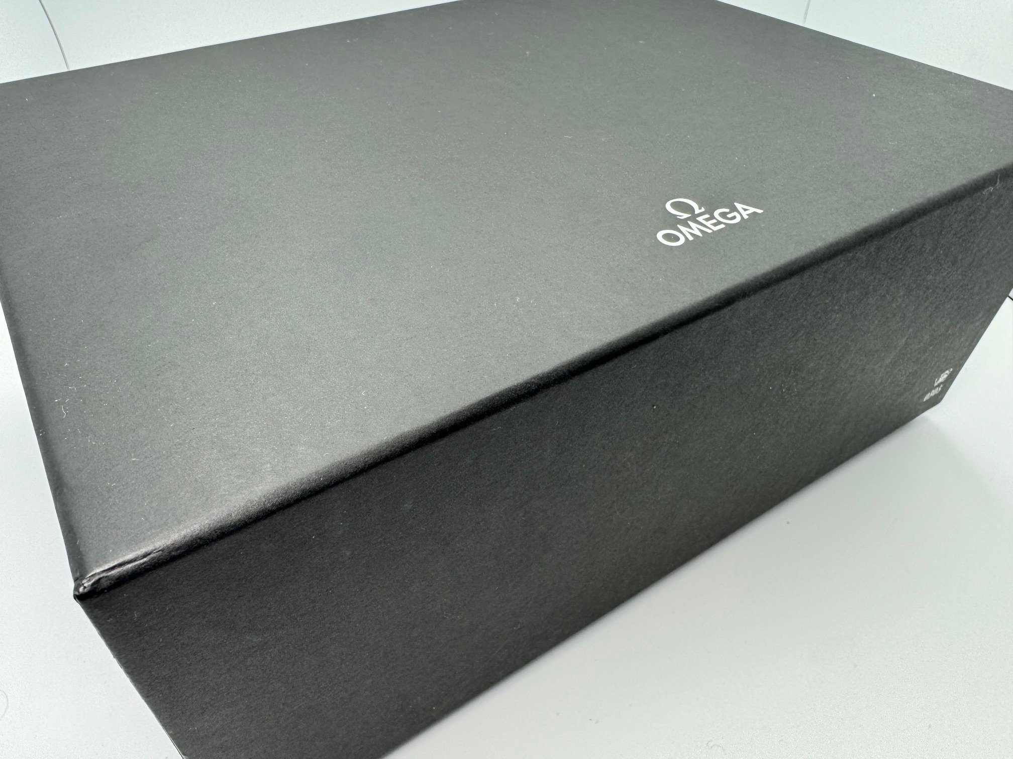 This is the current 42mm stainless steel model featuring sapphire glass on the front as well as the caseback to reveal the stunning OMEGA Co-Axial Master Chronometer Caliber 3861 movement. Inspired by the 4th generation Speedmaster style worn on the moon, it also includes an asymmetrical case, black step dial with applied OMEGA logo and the famous dot over 90 on the anodised aluminium bezel ring.