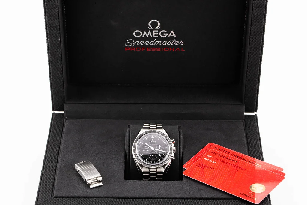 ·Up for sale is an excellent condition Omega Speedmaster Moonwatch Professional Sapphire on Bracelet with Adjustable Clasp, reference # 310.30.42.50.01.002 It comes with everything shown - boxes, papers, OEM clasp and Omega Warranty Card dated January 2021.