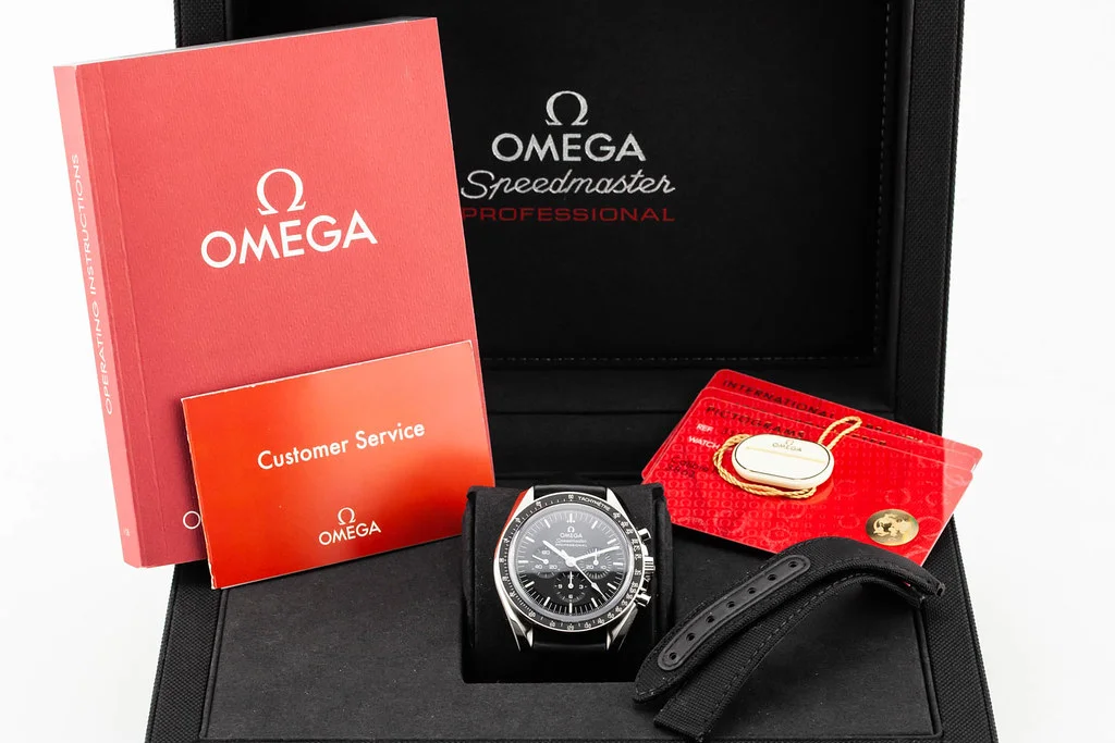 ·Up for sale is an excellent condition Omega Speedmaster Moonwatch Professional Sapphire on Strap, reference # 310.32.42.50.01.002 It comes complete with all boxes, papers, booklets, hang tag, extra OEM nylon strap, and Omega Warranty Card dated January 2023.