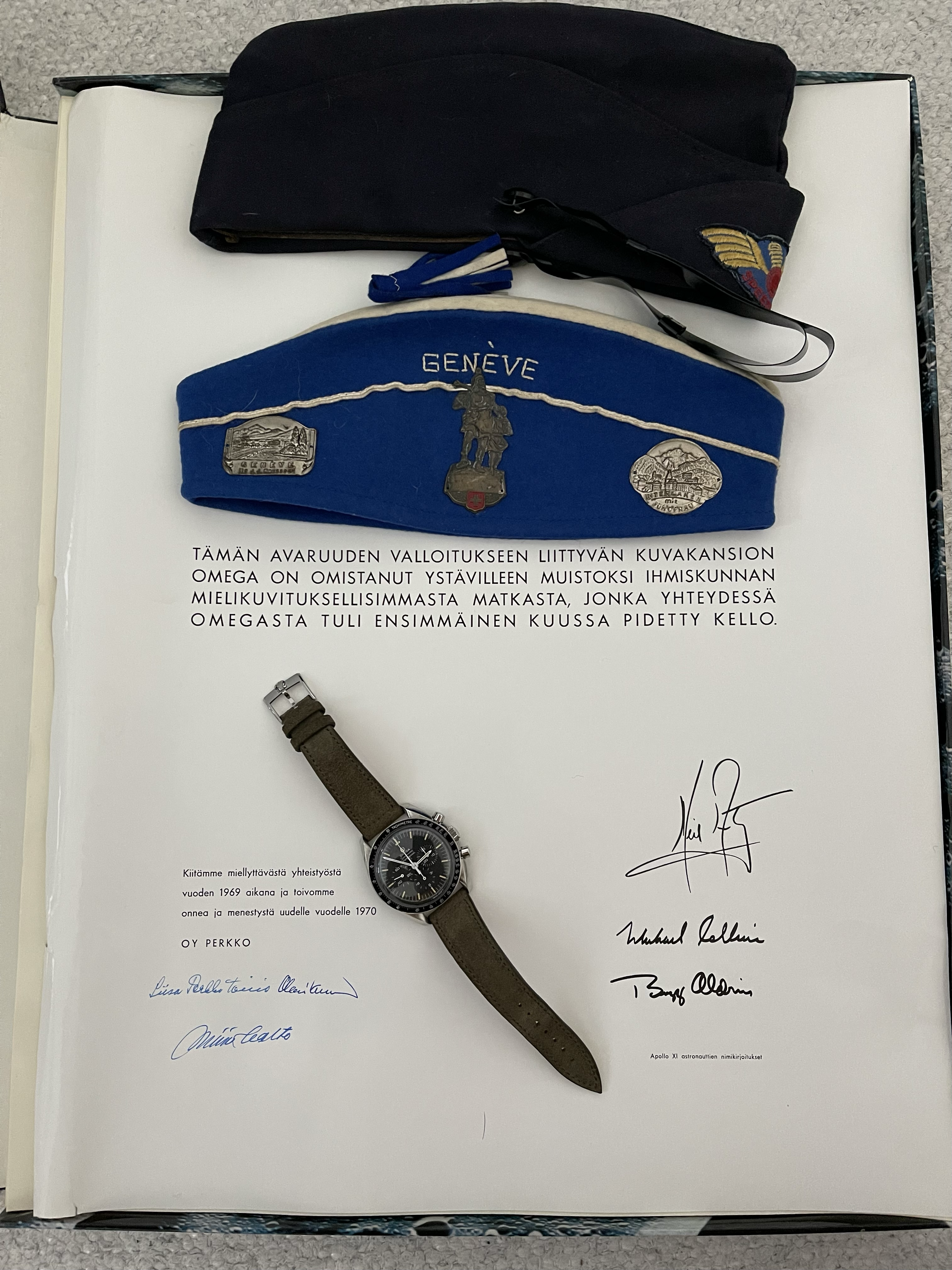 Today I received complete set of 20 pictures of space program pictures from 1969. What I have understood these boxes have been send to Omega stores in that time, not sure though. The set came with two different hats/caps. I did some research but couldn't find any information. They seem to be old and maybe related to that time. Have anyone ever seen these before and could tell me little bit of these?
