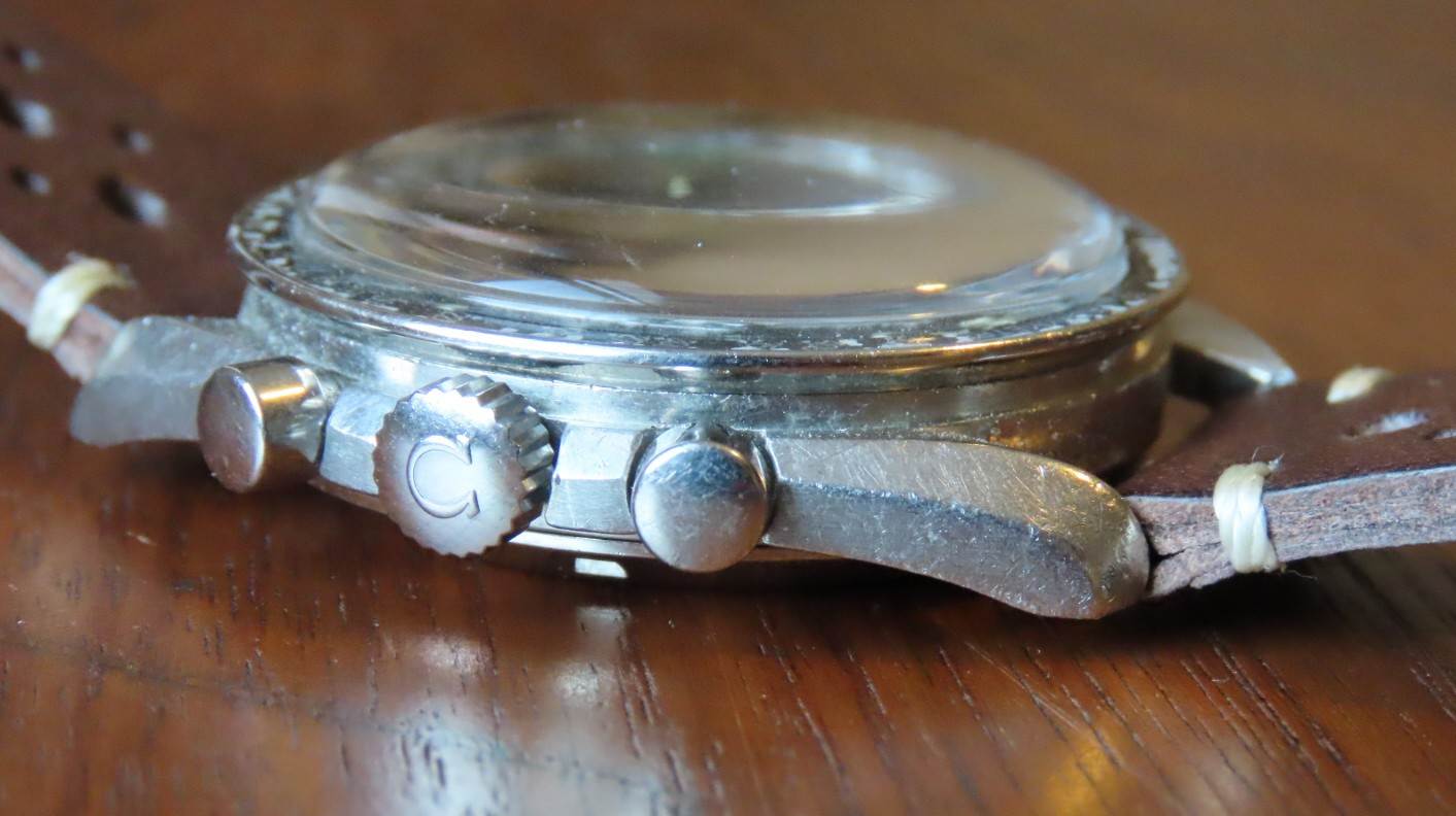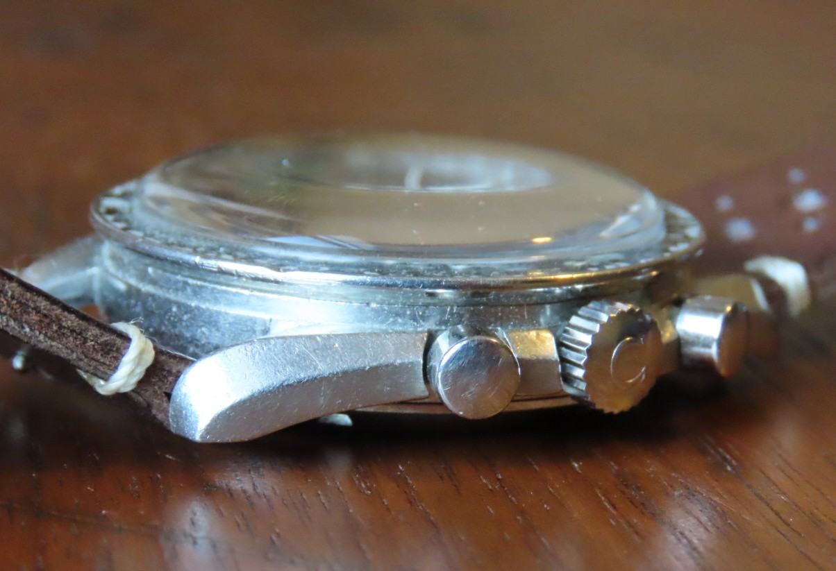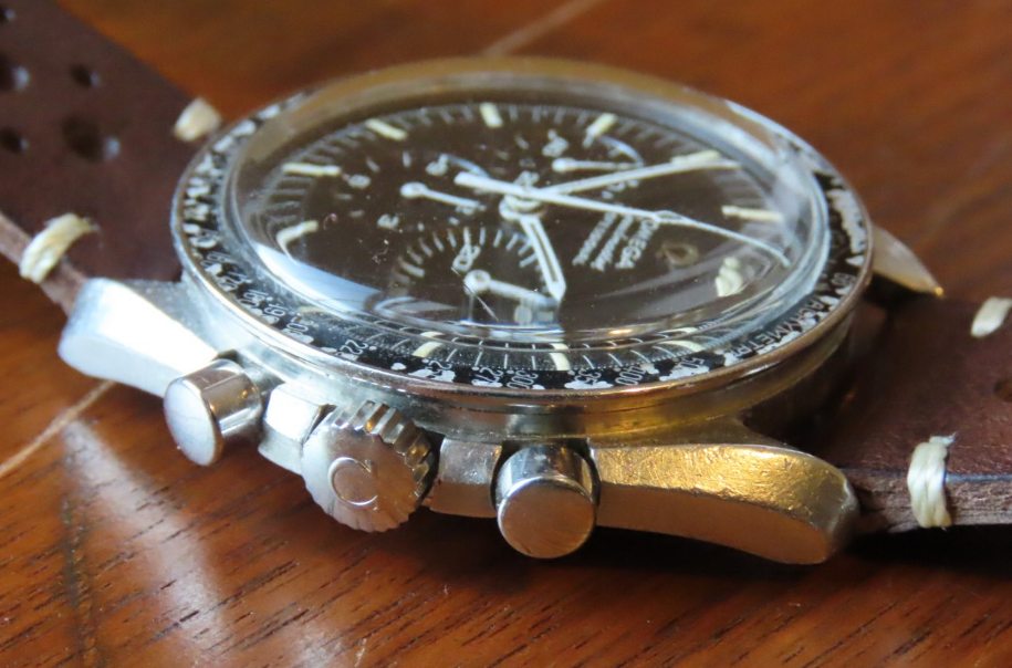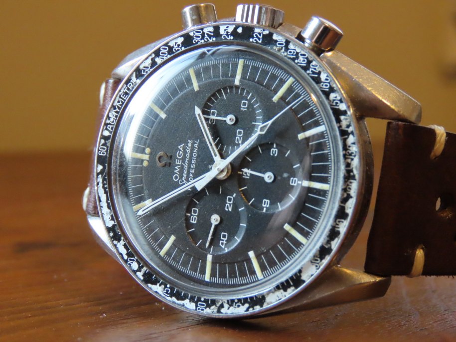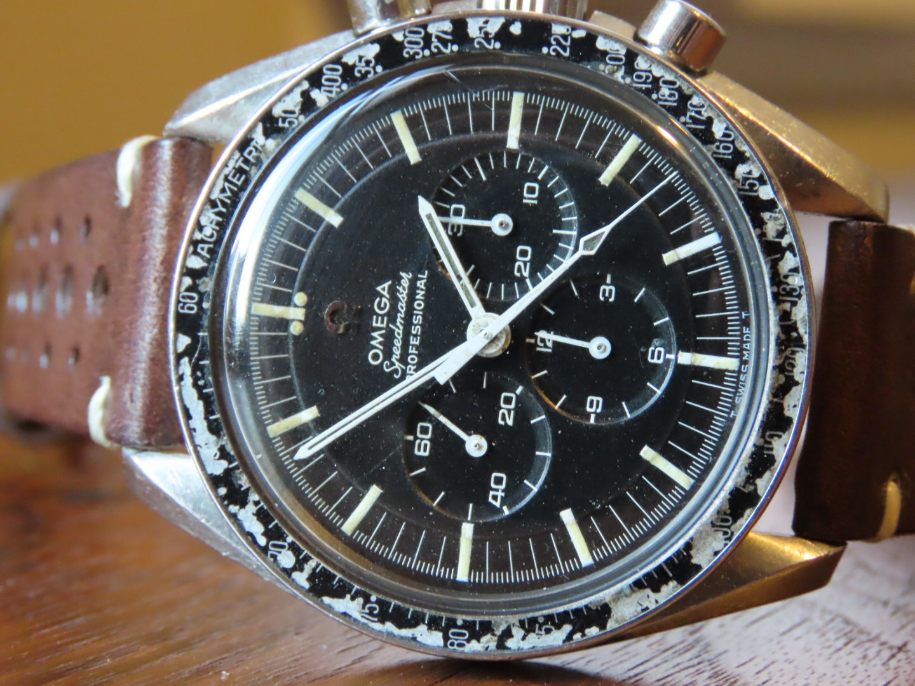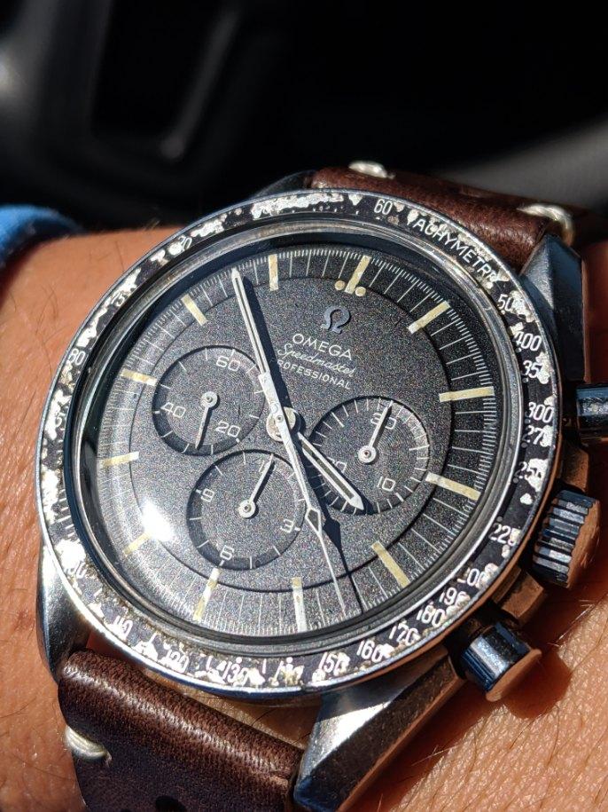 ·Offered for sale is a reference 145.022 Speedmaster 68. The watch is an honest example of a well enjoyed timepiece. The stainless steel HF case has consistent wear throughout, most of the finishing has moderate wear but the edges are present, and it does not appear to have been polished as the lugs look full. Hippocampus is present on the correct -68 caseback although there are many fine scratches and marks. Step dial with applied metal logo is in good condition, the original lume has a nice age to it. The lume is missing from some of the markers. Watch has an older signed Omega crystal that is free from chips or cracks, there is one small mark in the crystal above the 6 o'clock subdial and there are some small marks that can be removed with polywatch or by buffing. Bezel is a correct B1 Dot over 90, dot diagonal 70 style with significant wear, but matches the case nicely and can be easily swapped for a nicer example by the buyer. The crown is an original Omega crown replaced during service, but the watch comes with it's original flat foot crown as well. Pushers are the original or were replaced during a service long ago, but function as they should. This watch has been serviced by my watchmaker approximately 10 months ago. The watch is keeping time accurately and functions as it should, chronograph resets to zero. Movement is bright and shiny and problem free. Watch will come with extract of the archives once I receive it, according to the extract, the watch was made in April of 1969 and was delivered to USA. No bracelet was mentioned in the extract.