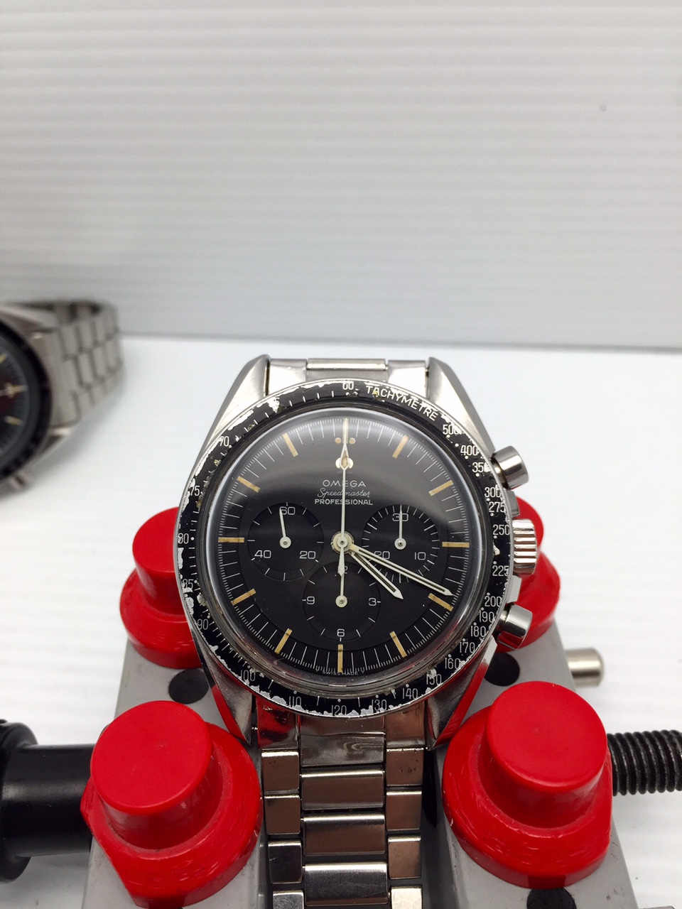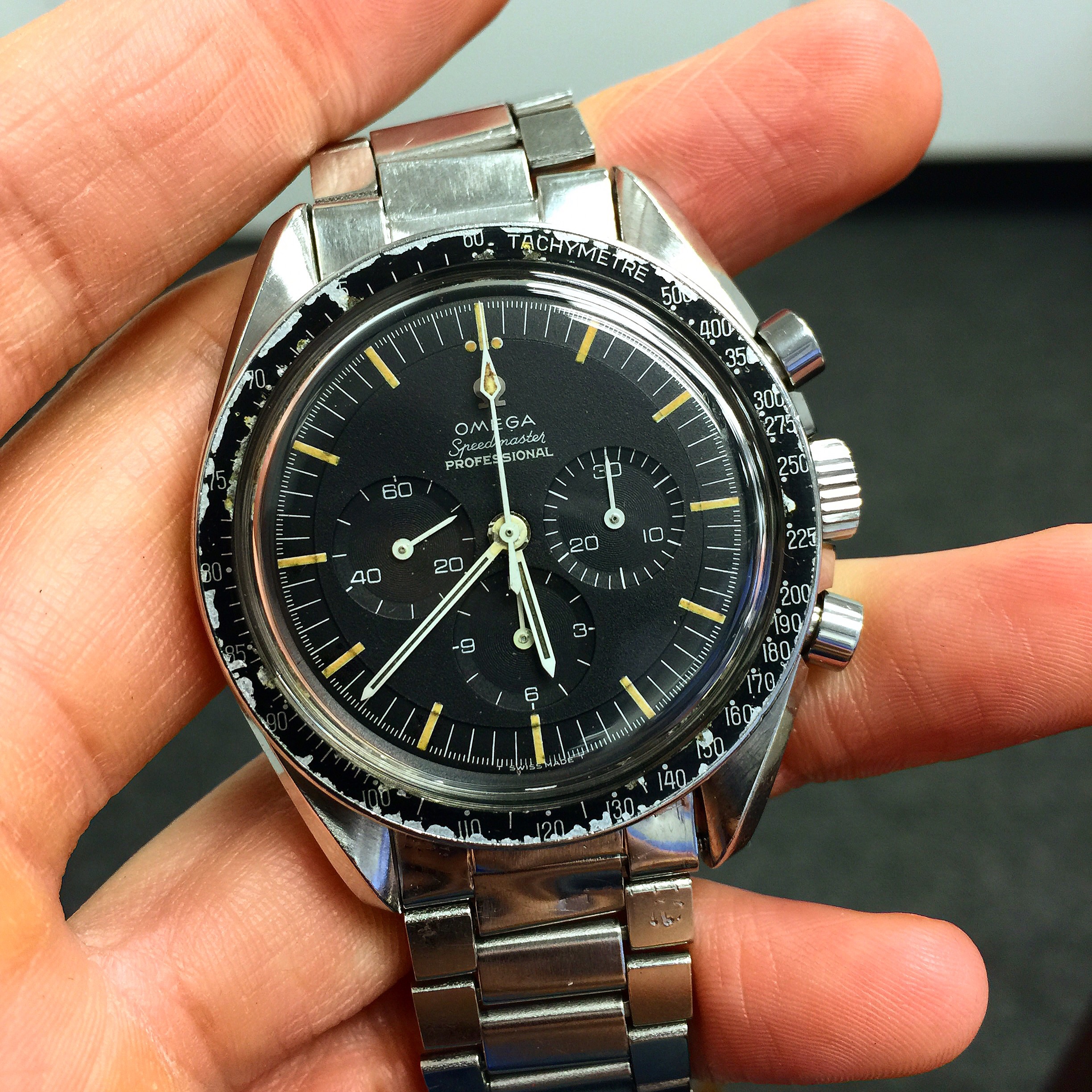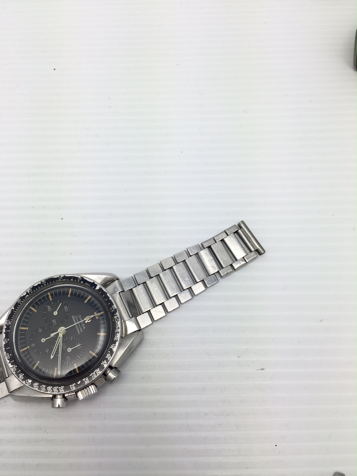 I have an Omega Speedmaster Professional 105.012-65 for sale. Please take a look at the photos for condition and read entire listing. Aged Dot over 90 bezel and correct smaller crown.
