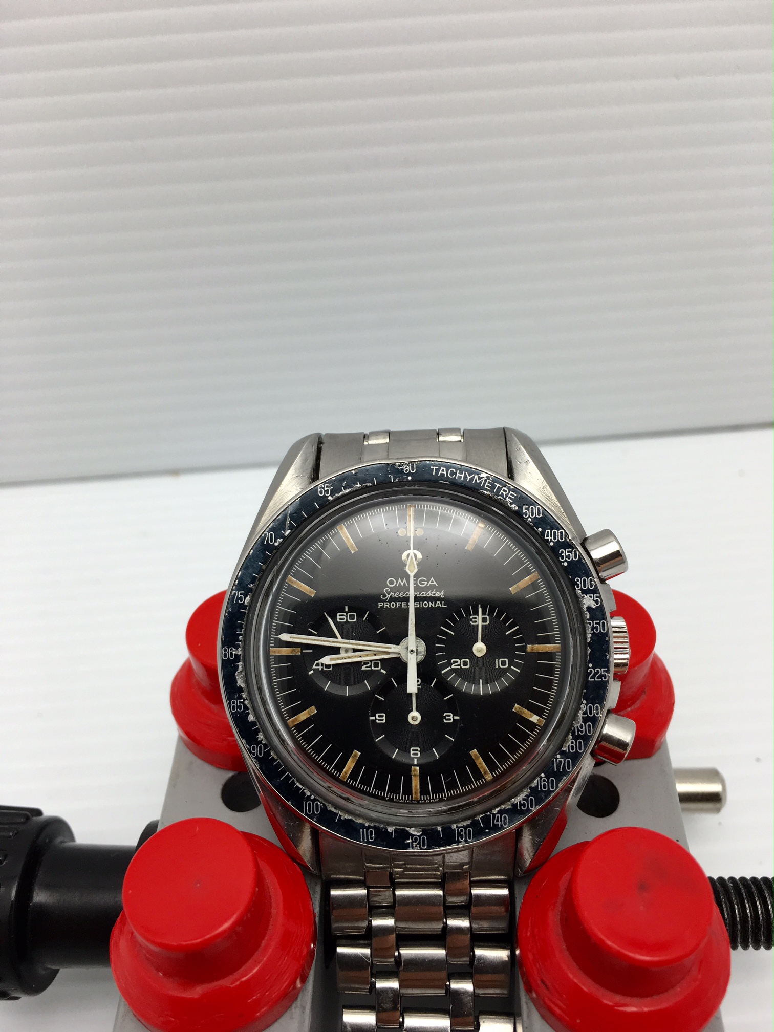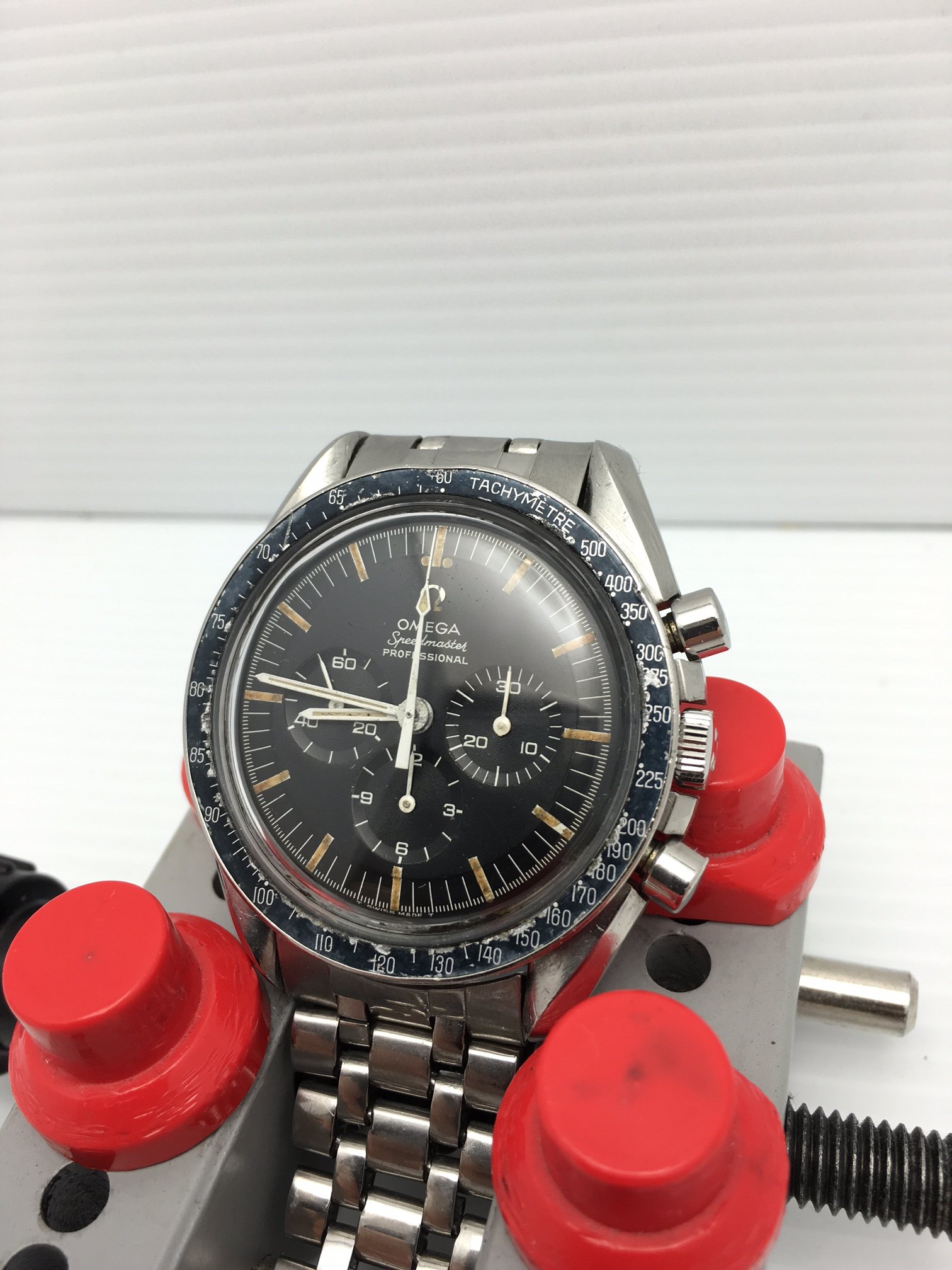I have an Omega Speedmaster Professional 145.012 - 67 with the HF Case for sale. Please take a look at the photos for condition and read entire listing. Aged Dot over 90 bezel.