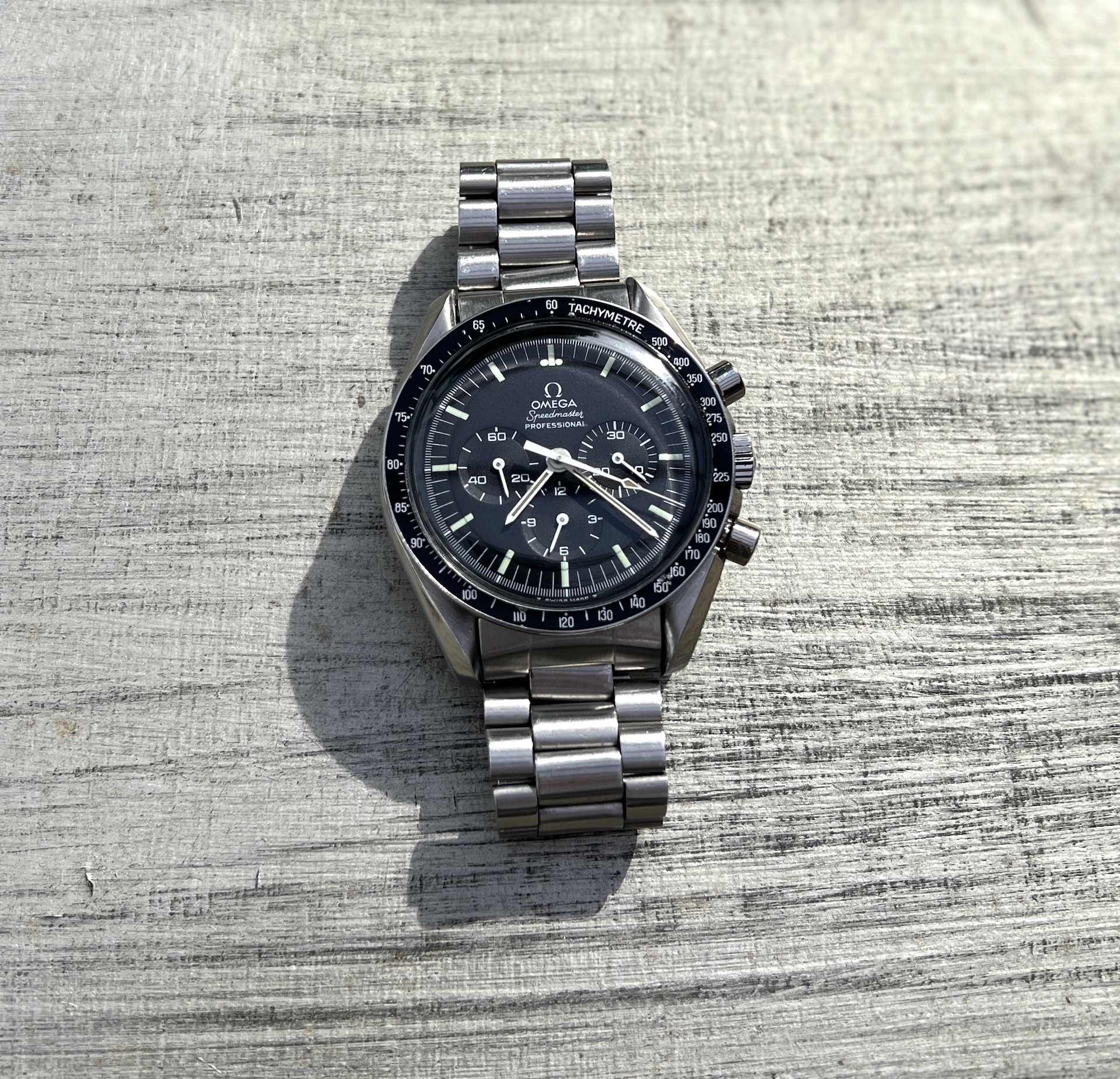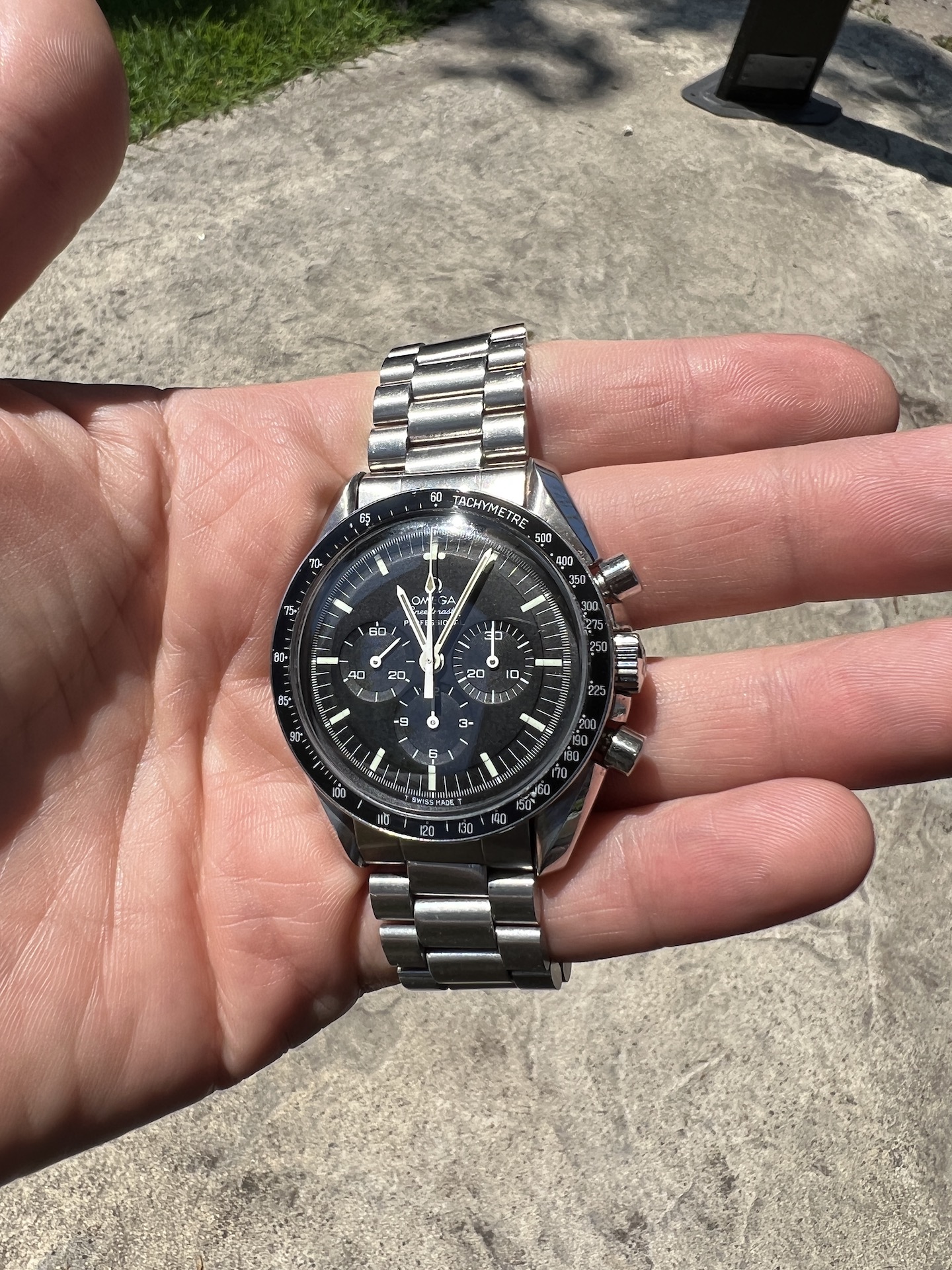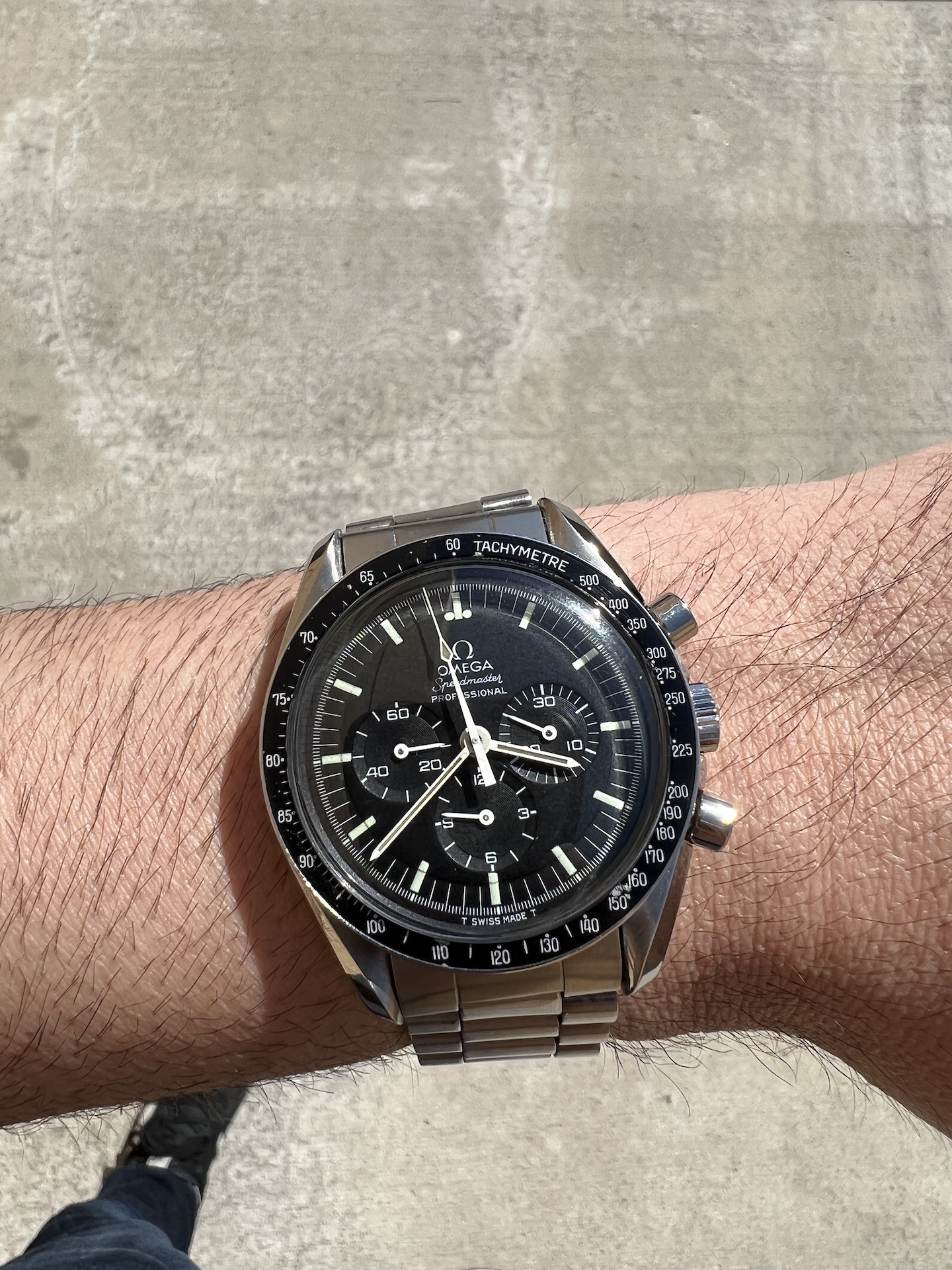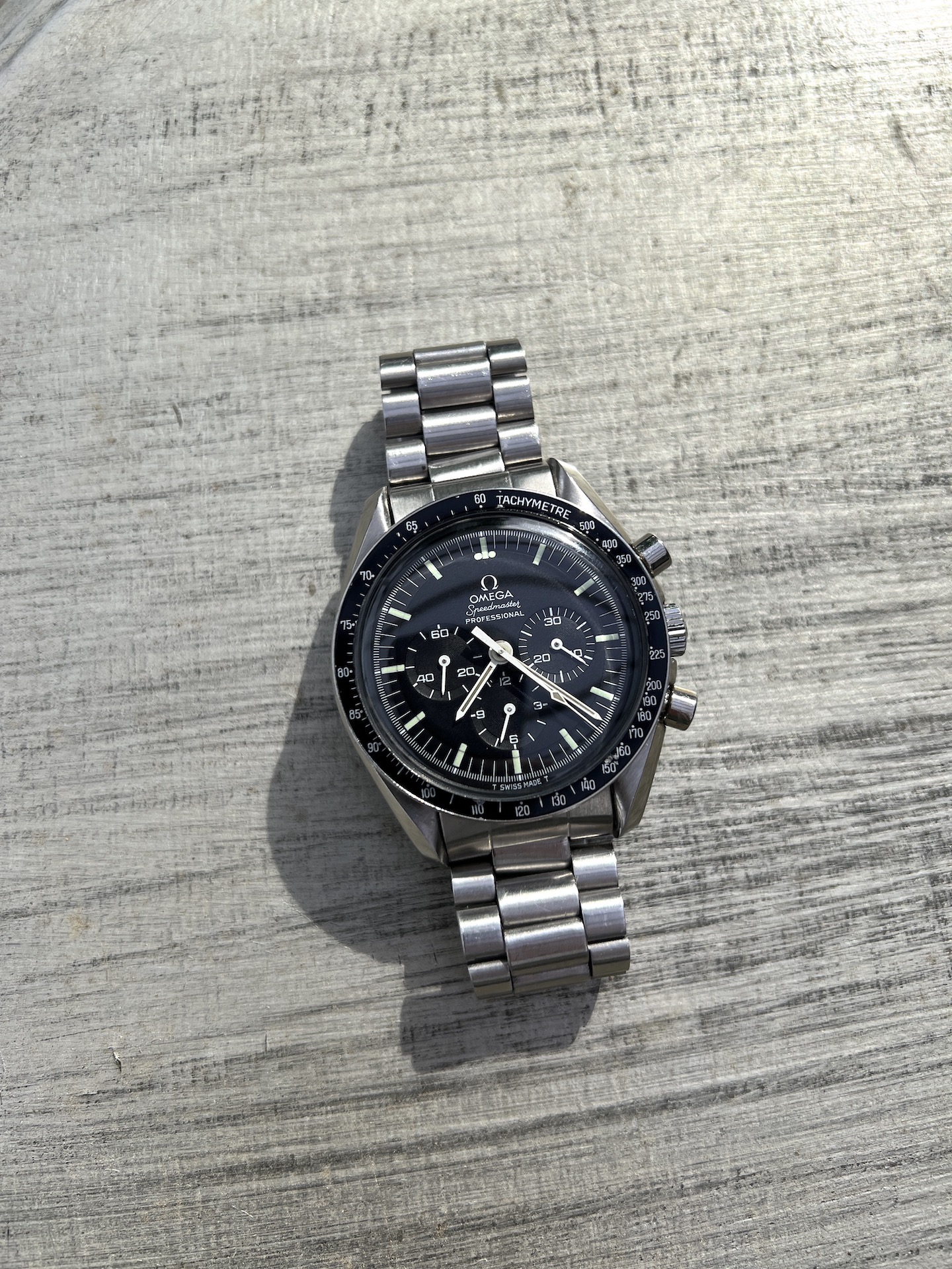 ·For sale, I have an Omega Speedmaster Professional 145.022-1971. It has the Caliber 861 which is a manual winding movement. The case measures 42mm without the crown. The watch was just serviced and all functions are working as they should. The watch will come with the 1171 bracelet and 677 end links. The box in the pictures is also included.