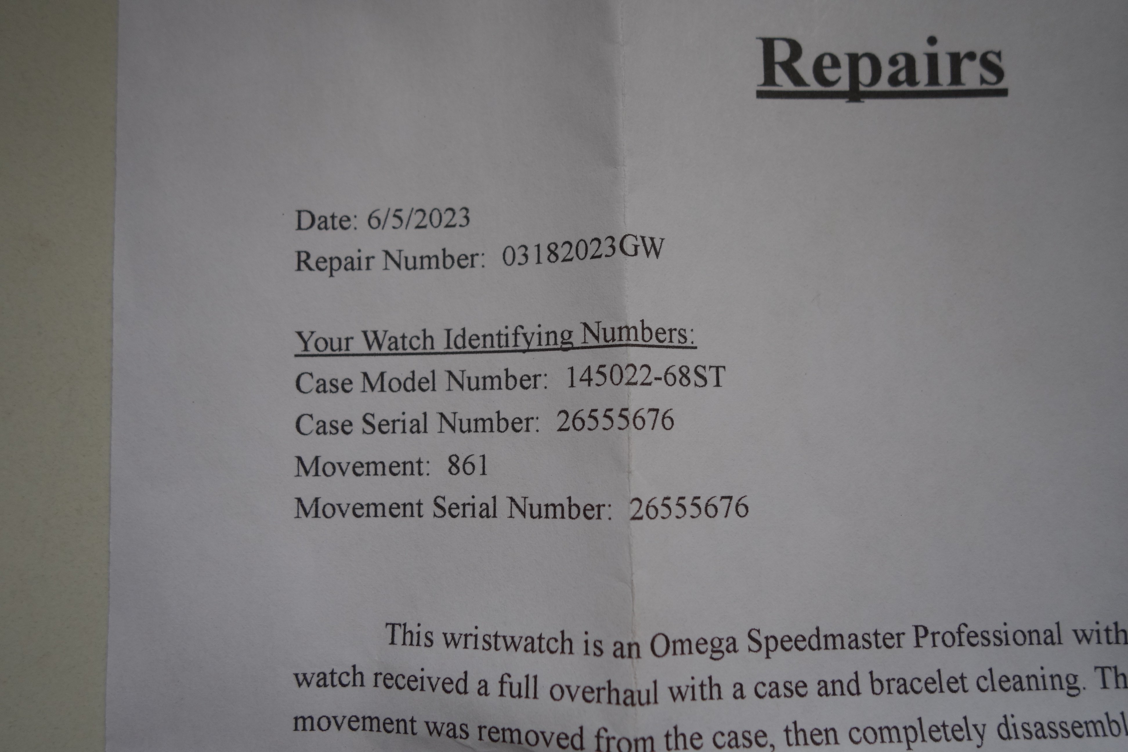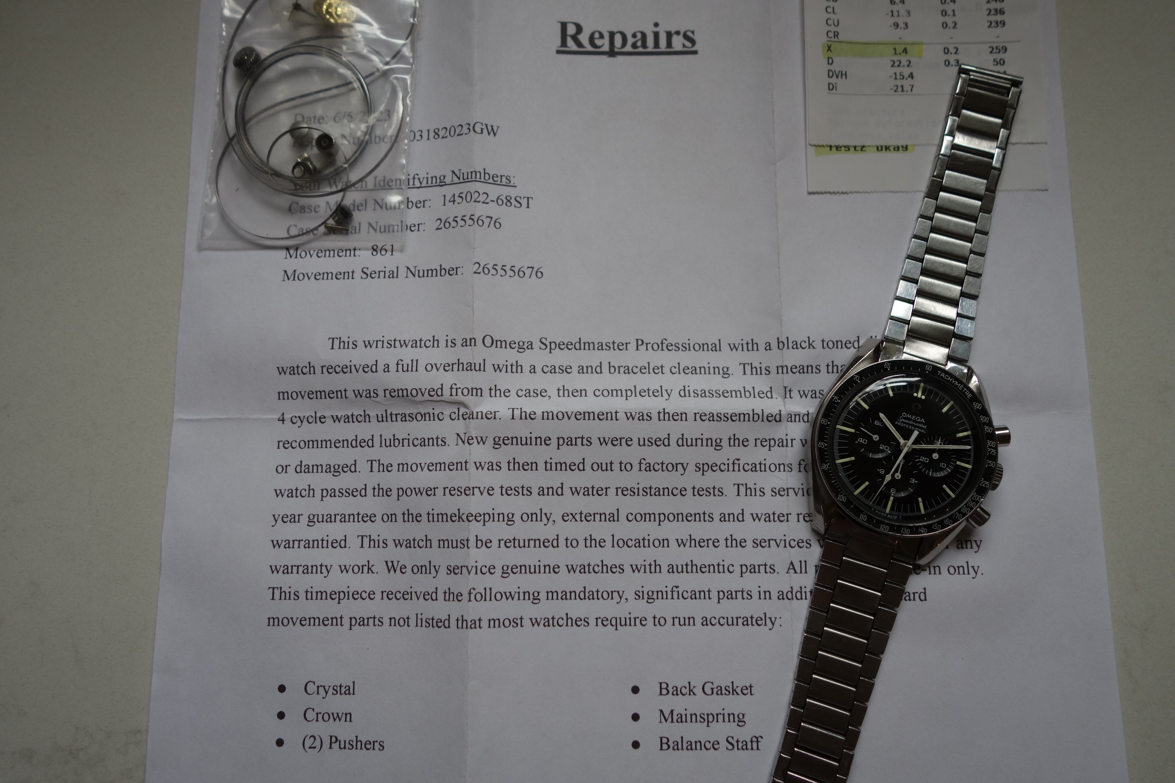 Calibre 861 serviced in June 2023, keeps great time and chronograph starts, stops and resets properly. I have noticed the hand on the hour register creeping ever so slightly past 12 clockwise, but resets when chrono is run and reset. Serial number is within correct range for -68. The movement photo was taken prior to service, so the old gasket you see there has been replaced. I have not opened the watch since it was serviced in order to preserve the water resistance.