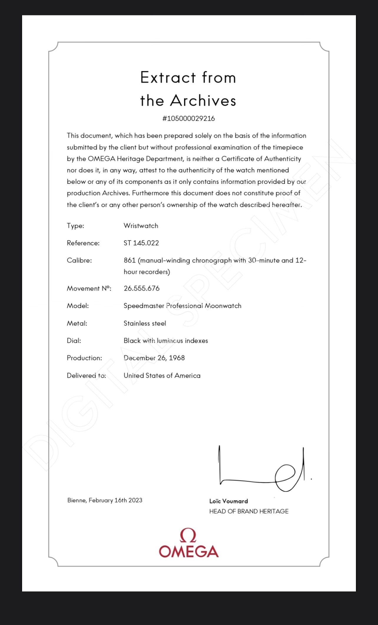 Service receipts and original parts replaced during service. No paper extract, but I do have the digital copy shown here with production on December 26th, 1968 and delivery to the USA.