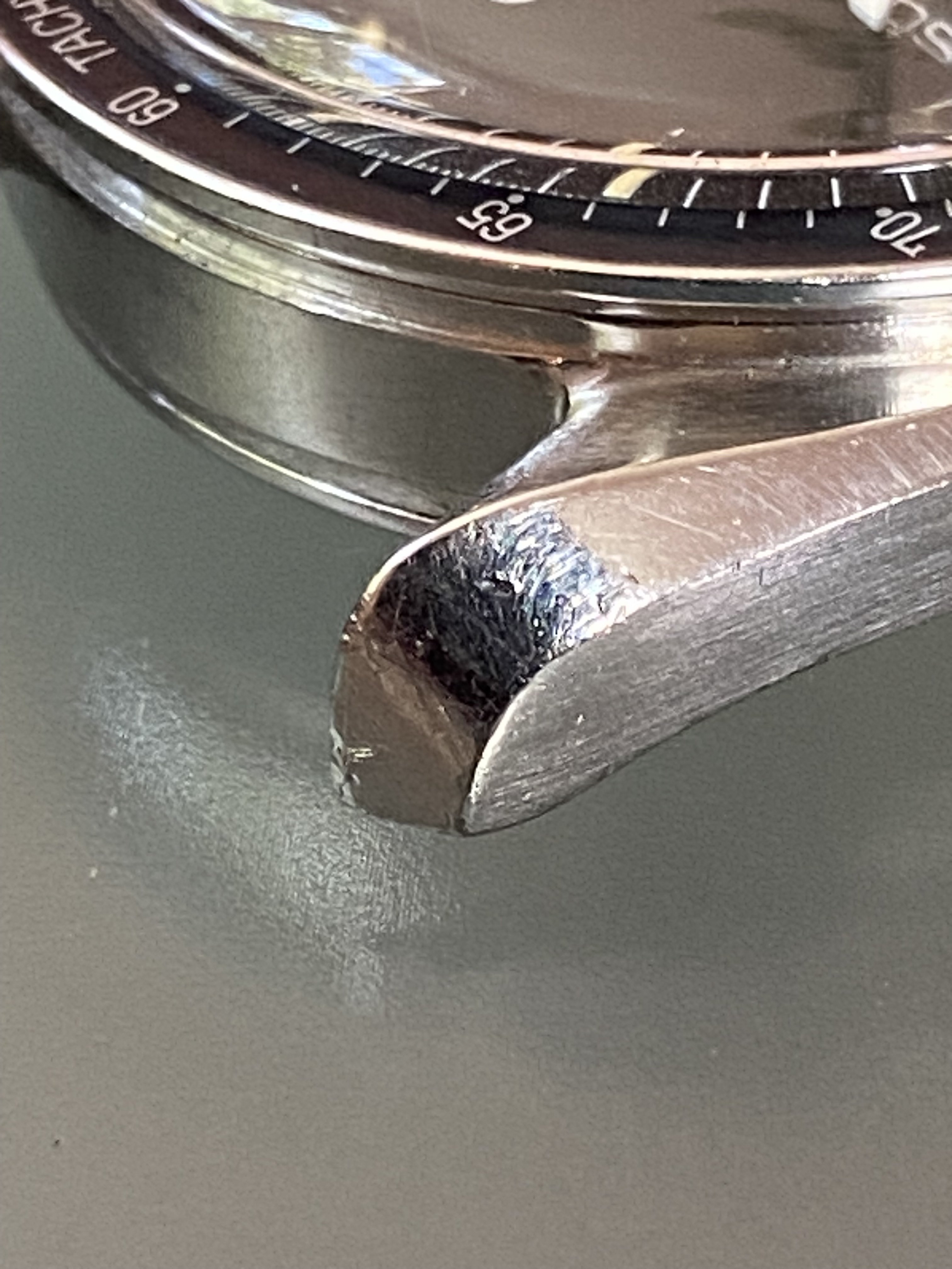 Dial is a very attractive step dial with all lume plots intact. The original hands match nicely, again all lume intact. Case appears unpolished but does show some wear, the original A2 crown is in place (I personally think the A2 is harder to find than the A1 flatfoot YMMV). Bezel is very attractive with an even light blue/grey fade to it, highlighted when it’s in the sun. Plexi was replaced at some point but that is the only obvious service part. Really a good looking dial/hands/bezel combo IMO.