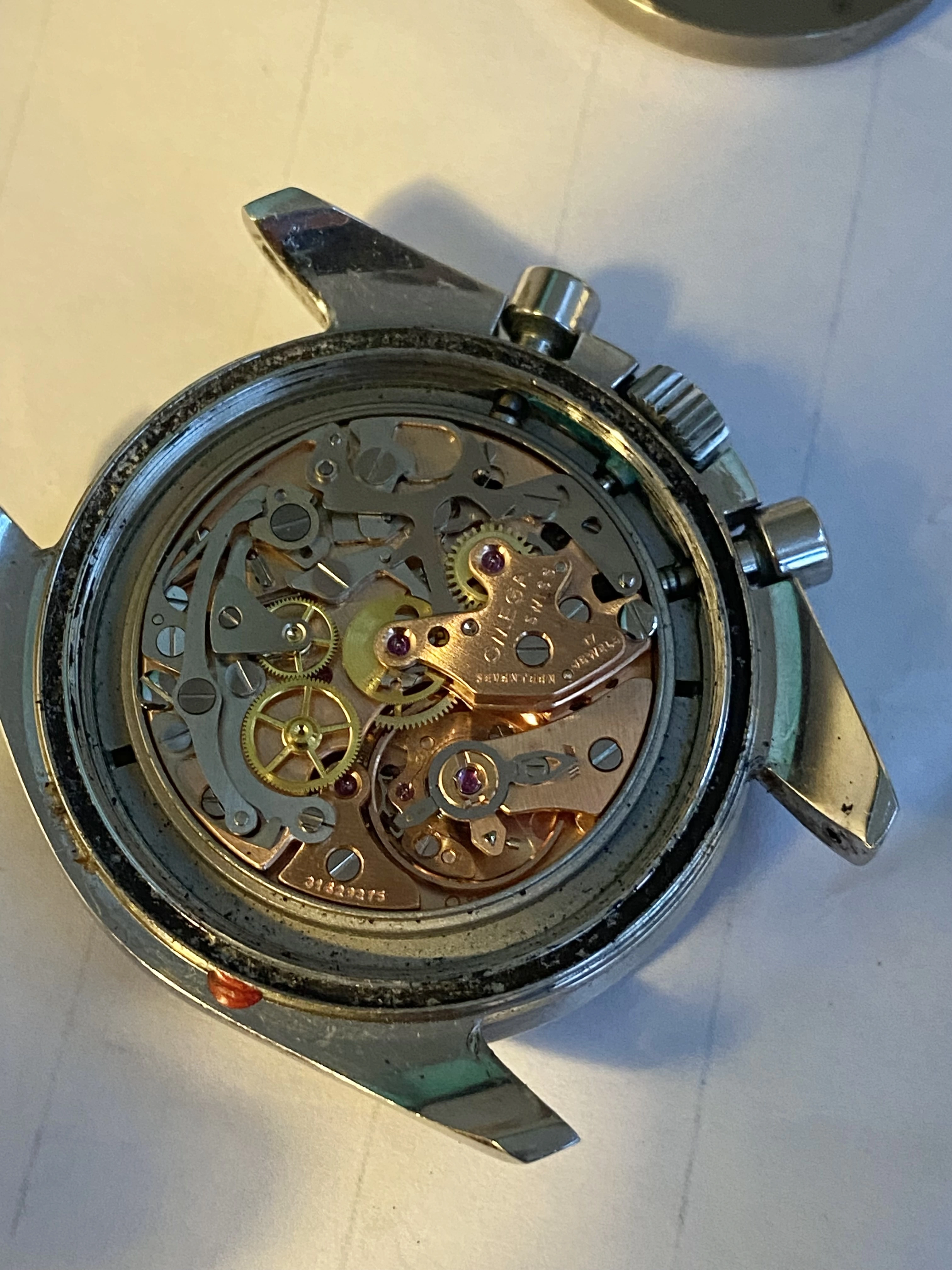 Original copper Omega 861 caliber chronograph movement in excelent condition. Screw heads are all in good condition, no scratches, corrosion, discolouration etc.
