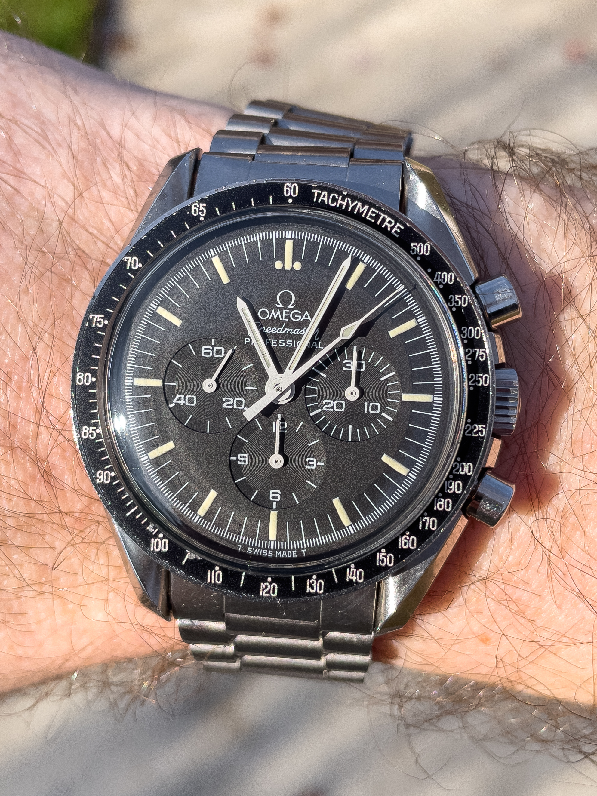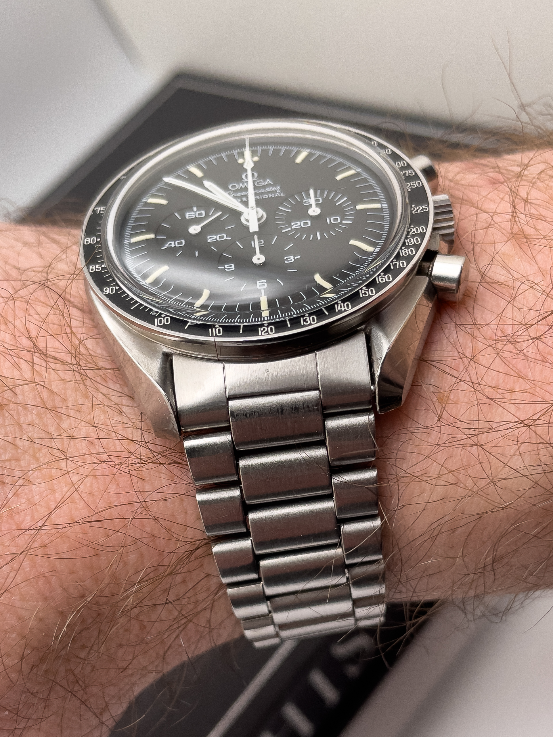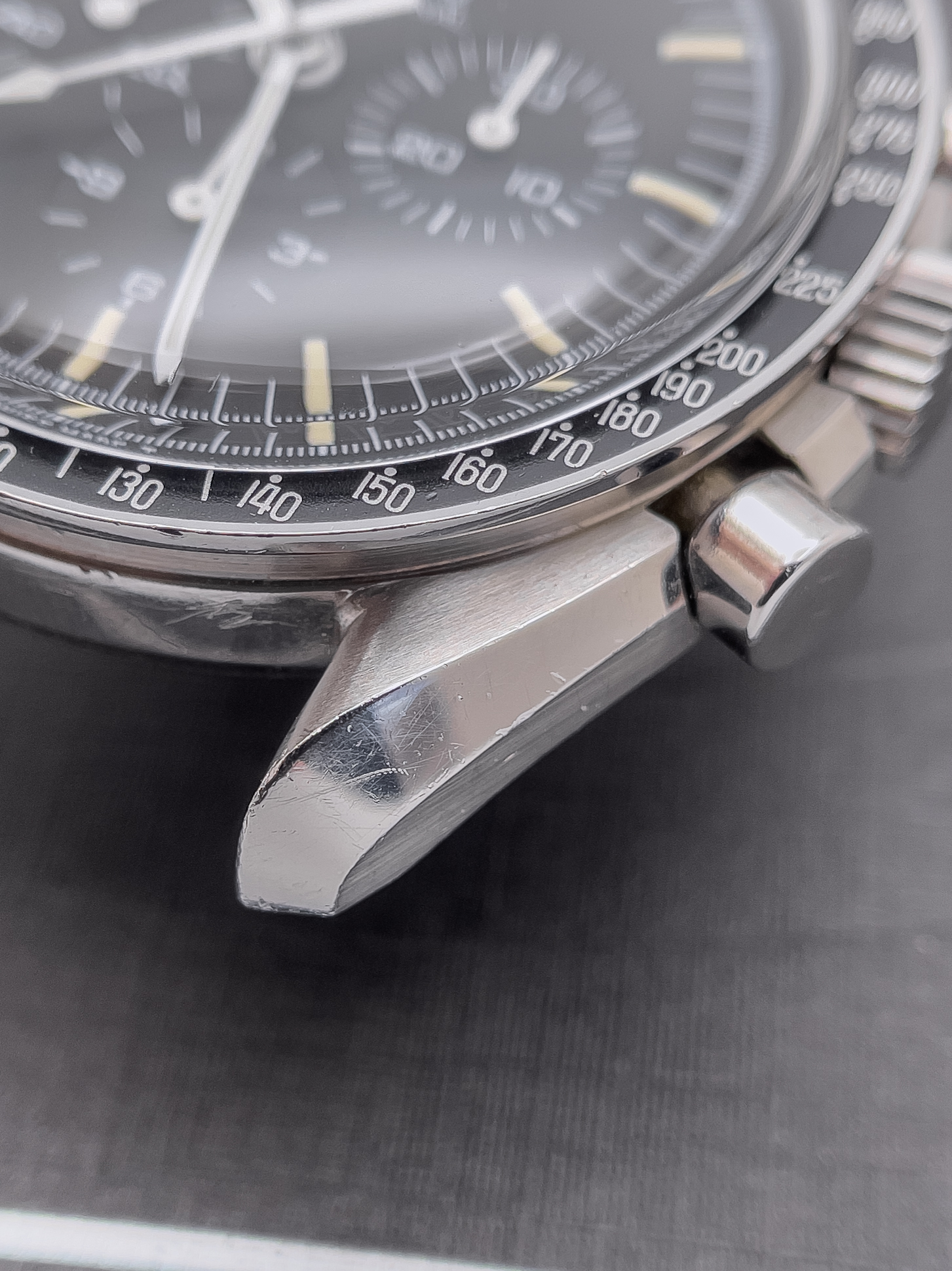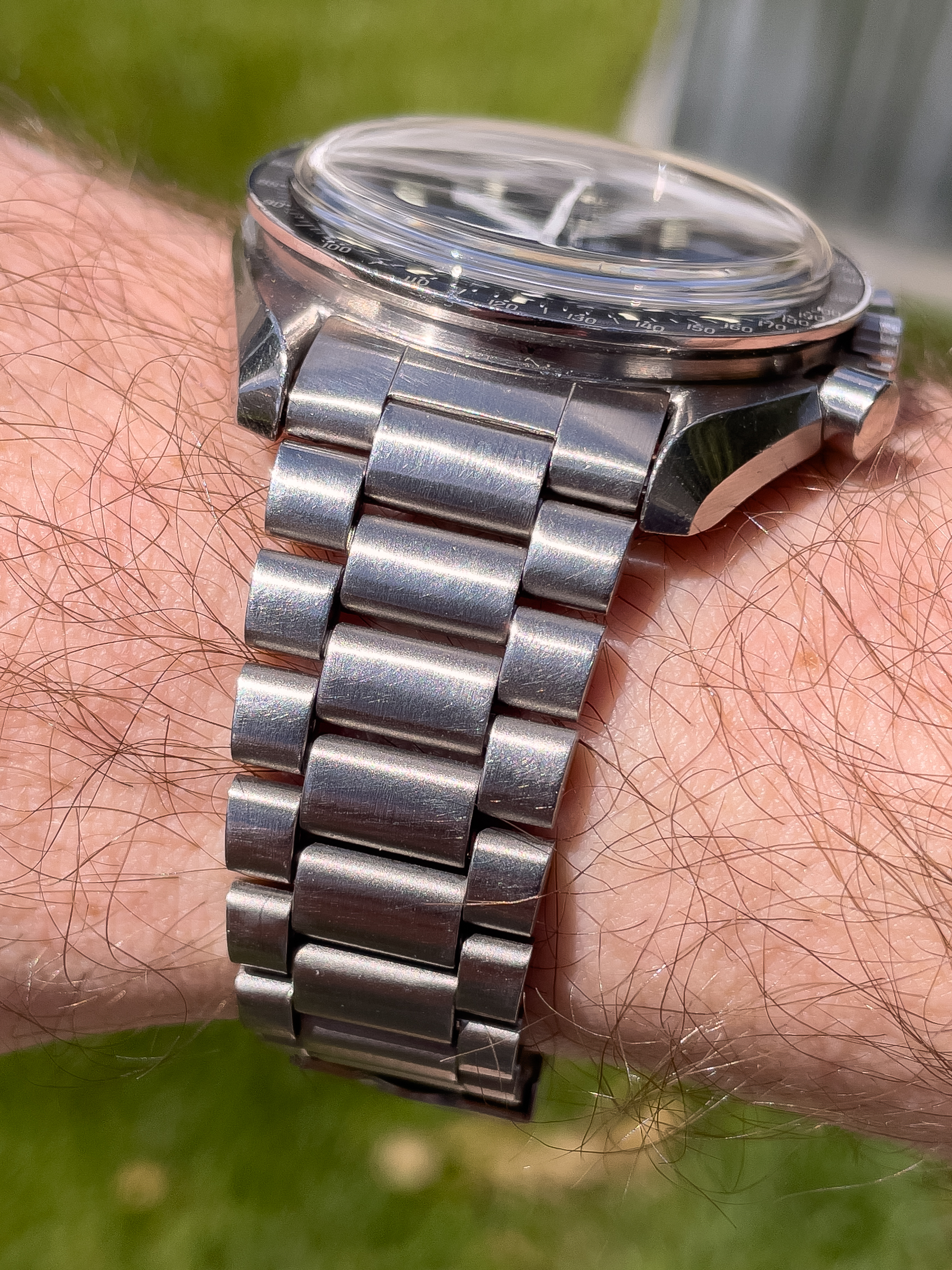 Over the last year I have picked up a couple other Speedies, which resulted in this one getting much less wrist time. I purchased this piece from fellow member Ndgal, which he had advertised as from 85. I don't have an extract for this, but using ilovemyspeedmaster.com I got an estimated March 1985 date. While I cannot say this is "unpolished" as I am not the original owner of this, the case does have sharp edges and shows wear commensurate with it's ~37 years of age. During service the case was not refinished. The original TACHYMETRE bezel is in overall great condition with small chips at 85, 93, 98, & 105, which is photographed below. The dial is in excellent condition with soft custardy tritium. The hands are original to the watch despite the tritium being softer in color than the dial. Please note there are two small cracks in the lume of the hour hand. During service, Kelly inspected these under microscope and confirmed the lume is secure. The pushers were rebuilt during service. The crystal is in good shape and could do with a light polish and has the present Ω in the center. The caseback has a superficial tool slip mark from a previous owner. Note the short tail Q and the ADB (A. Donze-Baum SA) Fir Tree. The 1171 with 633 end links is original to the watch and full size (with three additional links not photographed). During service I had the pins/tubes replaced and requested a new set of Omega spring bars. My wrist is between ~7" - ~7.25" and the bracelet is comfortably sized to the middle of 8 micro adjustments. As this is a full size bracelet, there is plenty of room for adjustment in either direction.