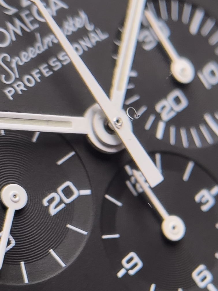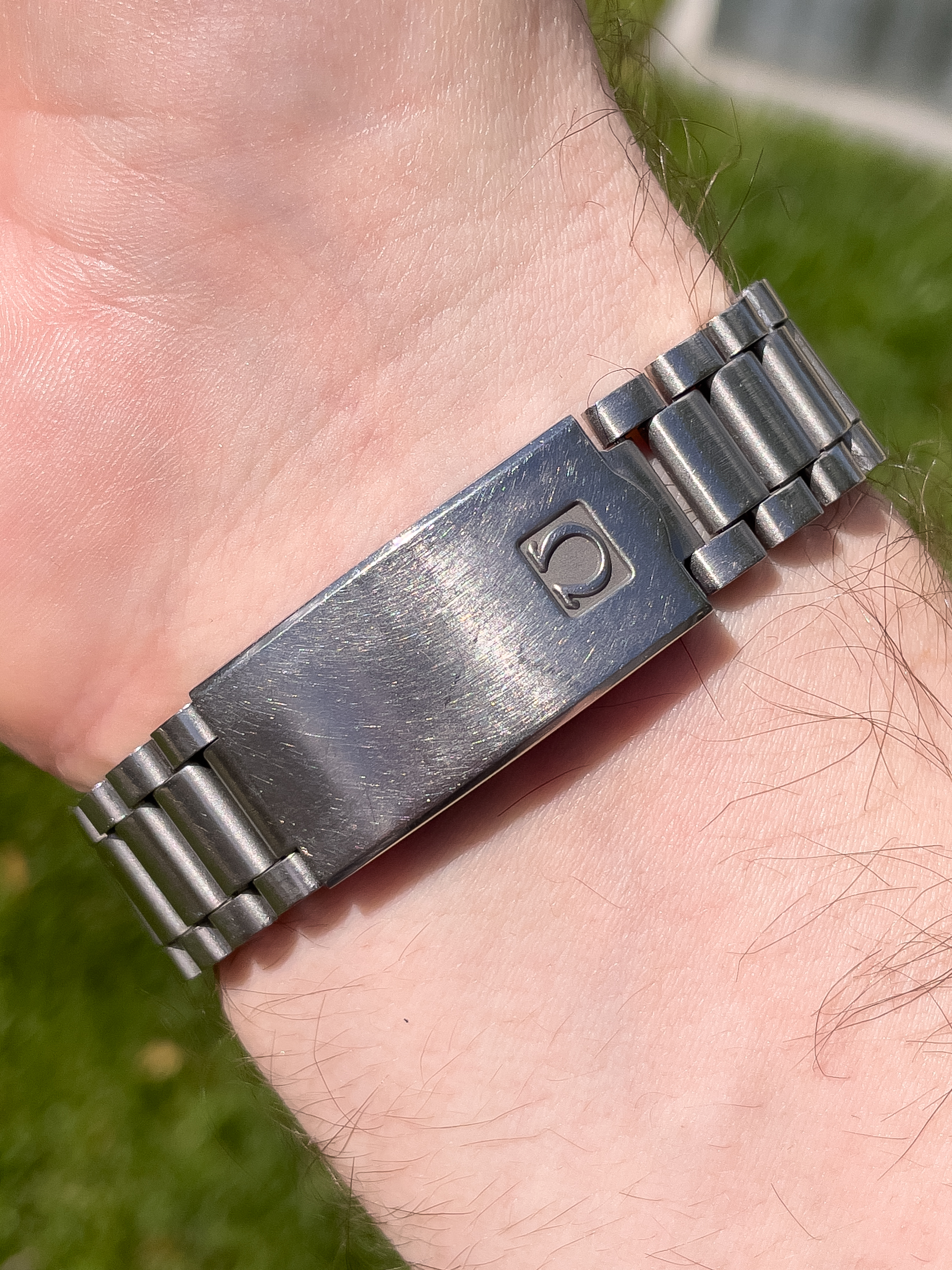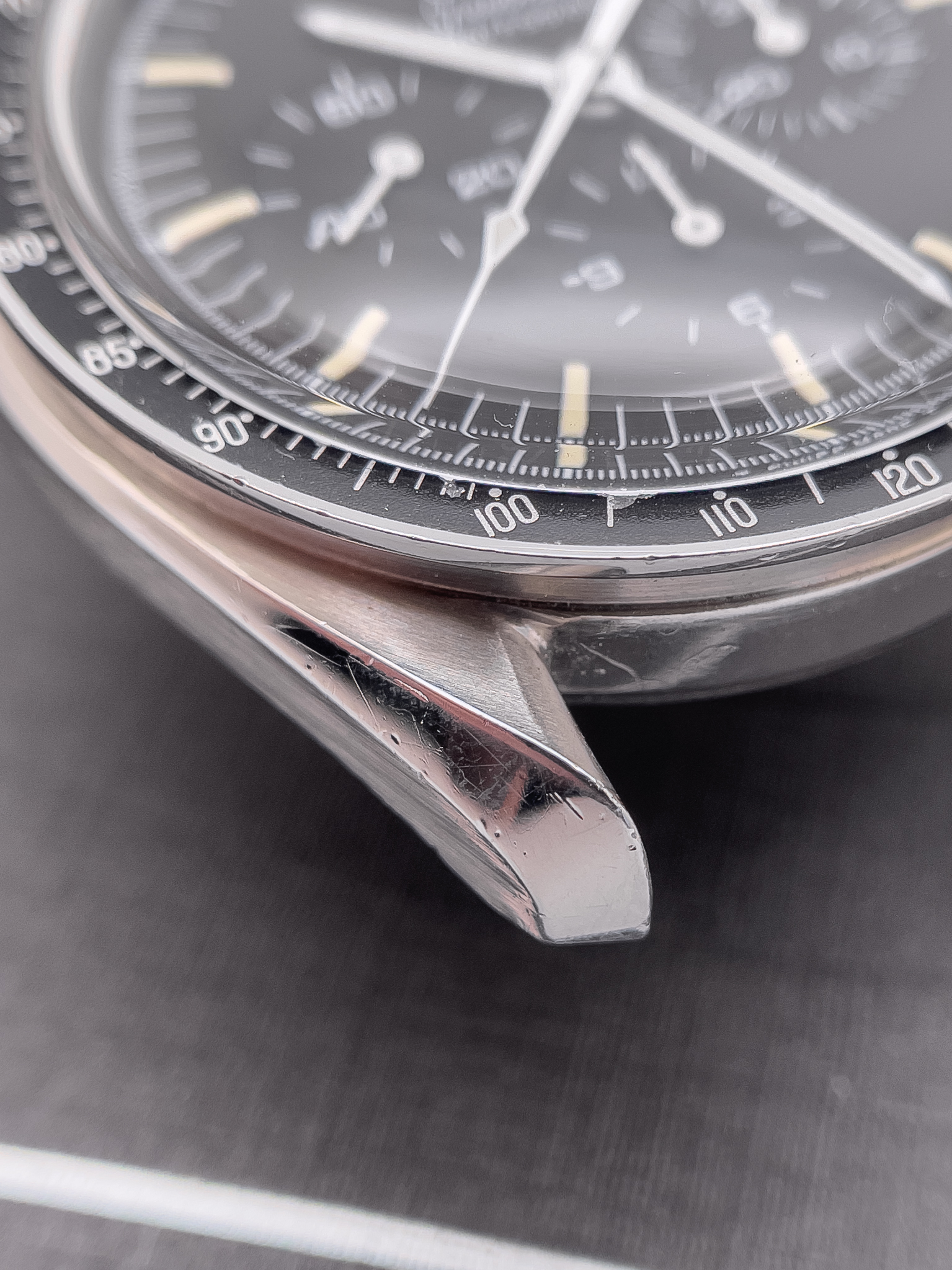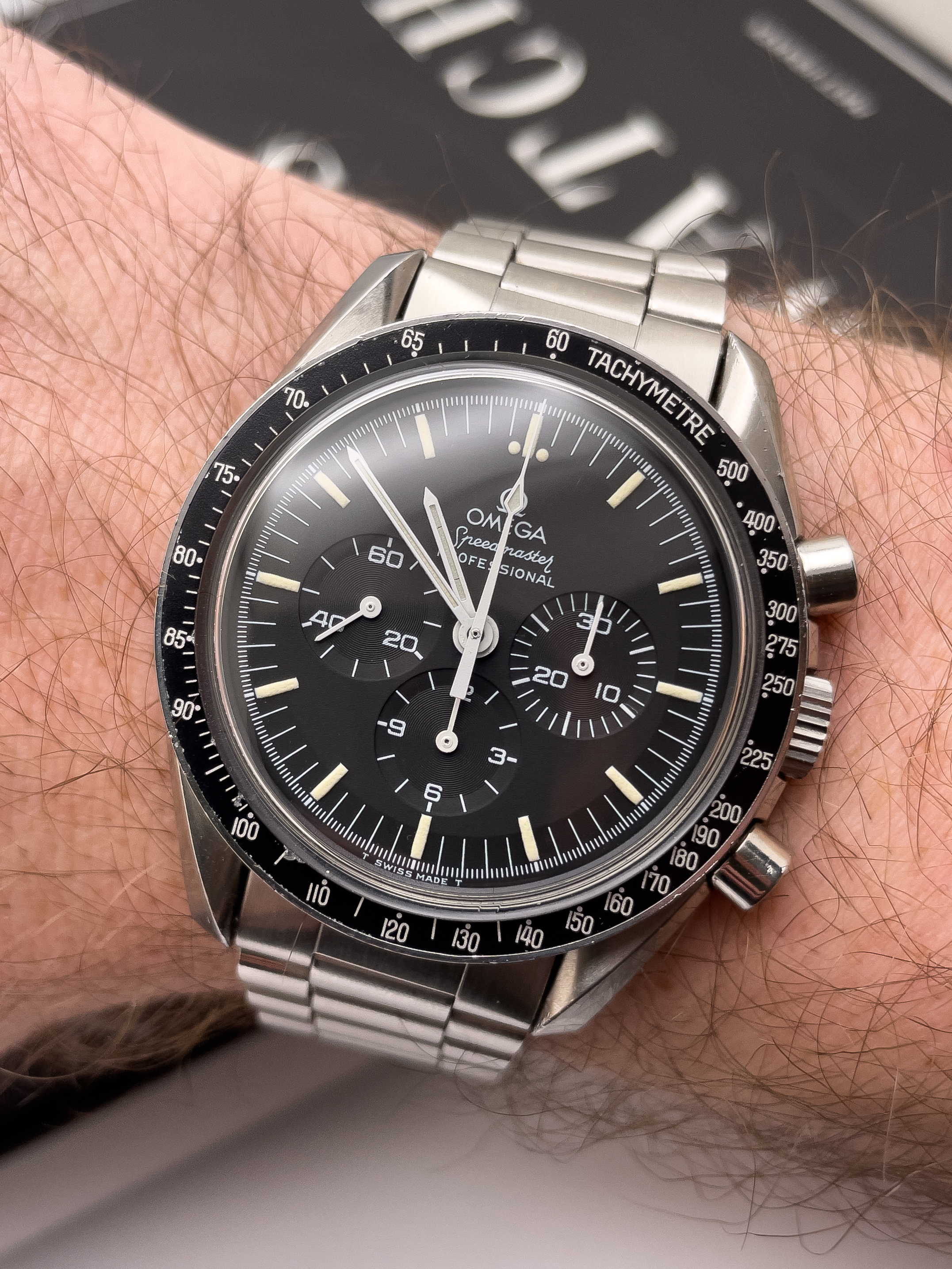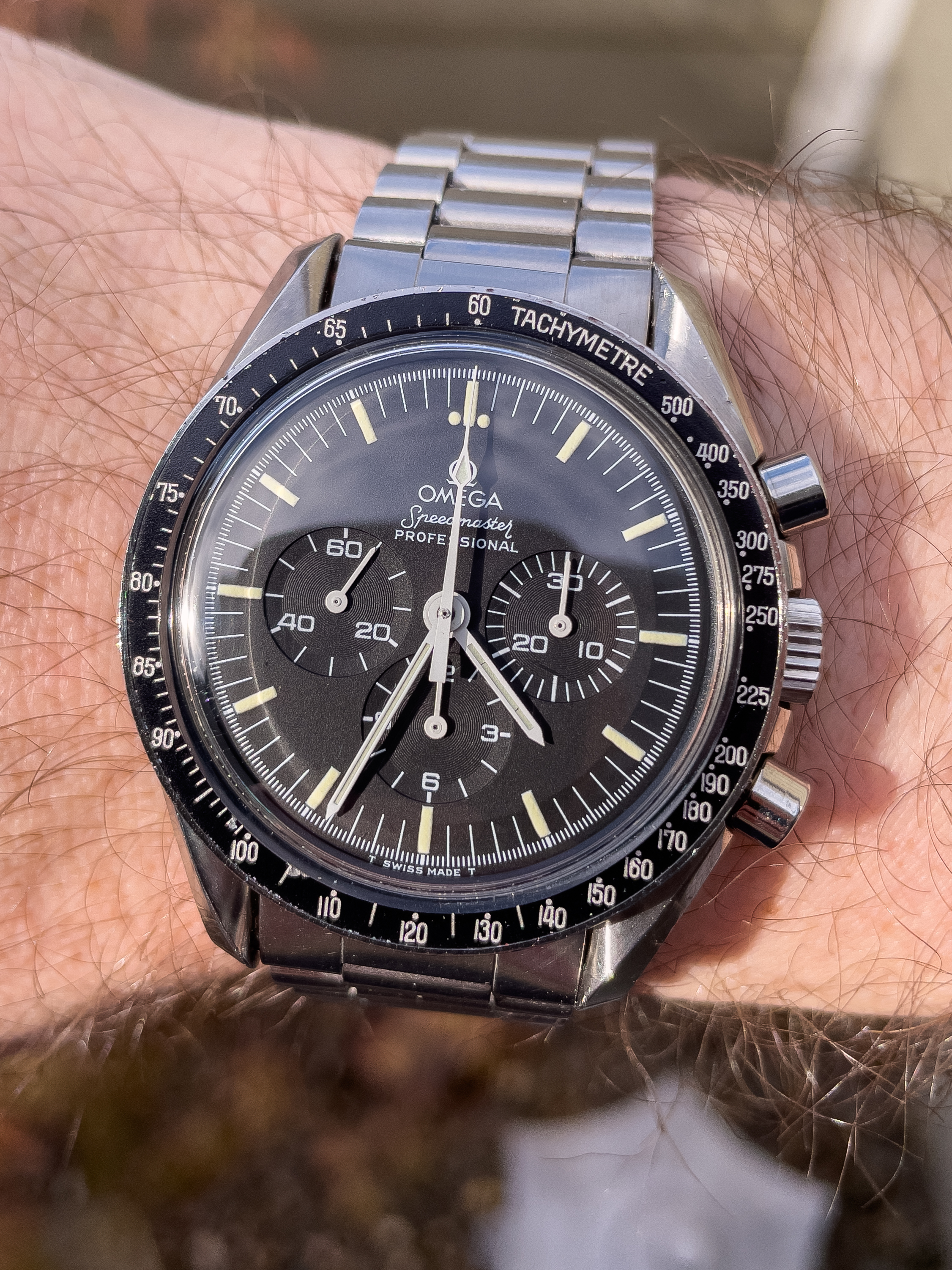 Over the last year I have picked up a couple other Speedies, which resulted in this one getting much less wrist time. I purchased this piece from fellow member Ndgal, which he had advertised as from 85. I don't have an extract for this, but using ilovemyspeedmaster.com I got an estimated March 1985 date. While I cannot say this is "unpolished" as I am not the original owner of this, the case does have sharp edges and shows wear commensurate with it's ~37 years of age. During service the case was not refinished. The original TACHYMETRE bezel is in overall great condition with small chips at 85, 93, 98, & 105, which is photographed below. The dial is in excellent condition with soft custardy tritium. The hands are original to the watch despite the tritium being softer in color than the dial. Please note there are two small cracks in the lume of the hour hand. During service, Kelly inspected these under microscope and confirmed the lume is secure. The pushers were rebuilt during service. The crystal is in good shape and could do with a light polish and has the present Ω in the center. The caseback has a superficial tool slip mark from a previous owner. Note the short tail Q and the ADB (A. Donze-Baum SA) Fir Tree. The 1171 with 633 end links is original to the watch and full size (with three additional links not photographed). During service I had the pins/tubes replaced and requested a new set of Omega spring bars. My wrist is between ~7" - ~7.25" and the bracelet is comfortably sized to the middle of 8 micro adjustments. As this is a full size bracelet, there is plenty of room for adjustment in either direction.