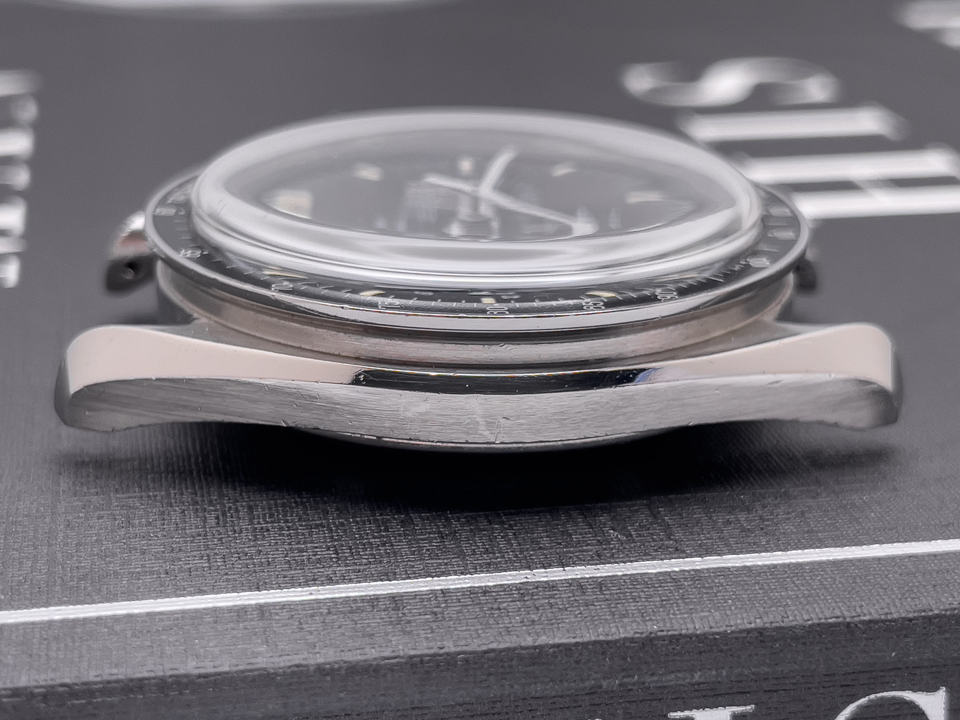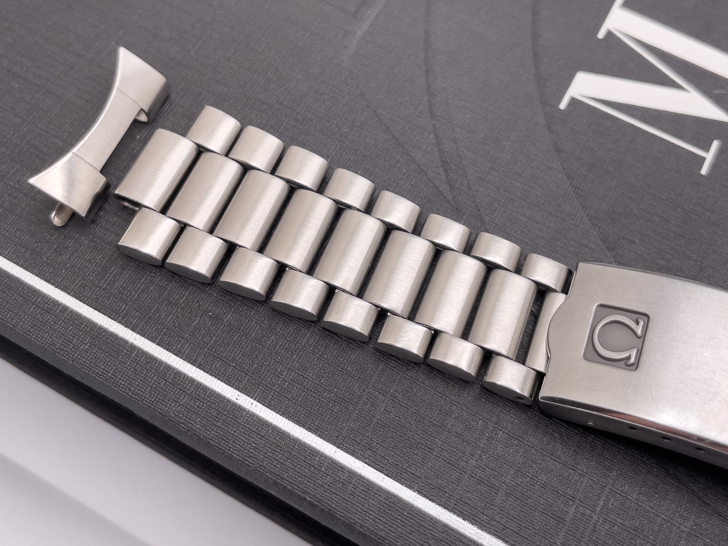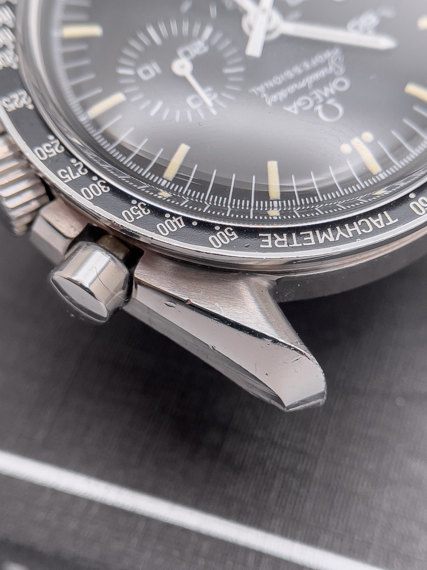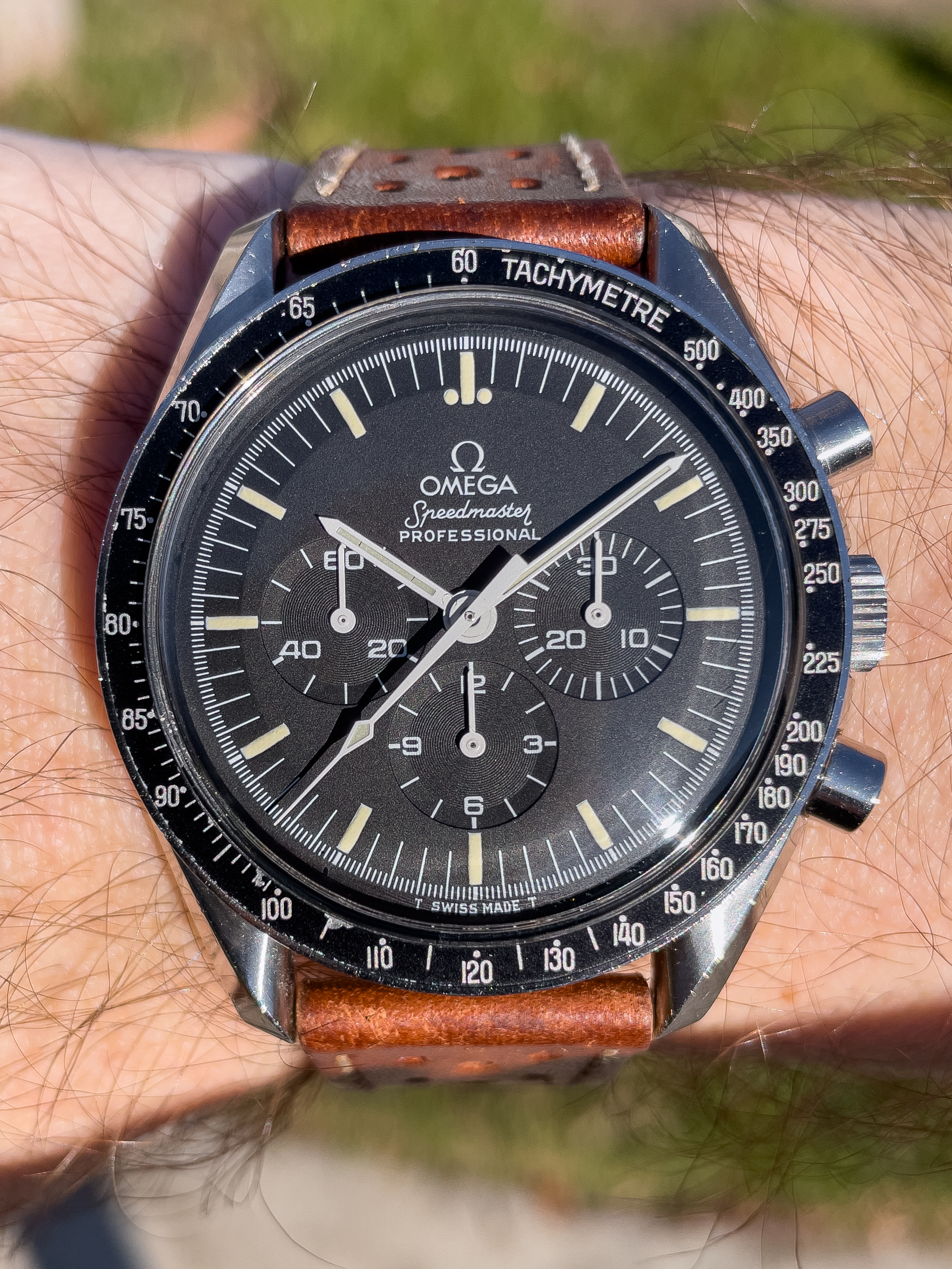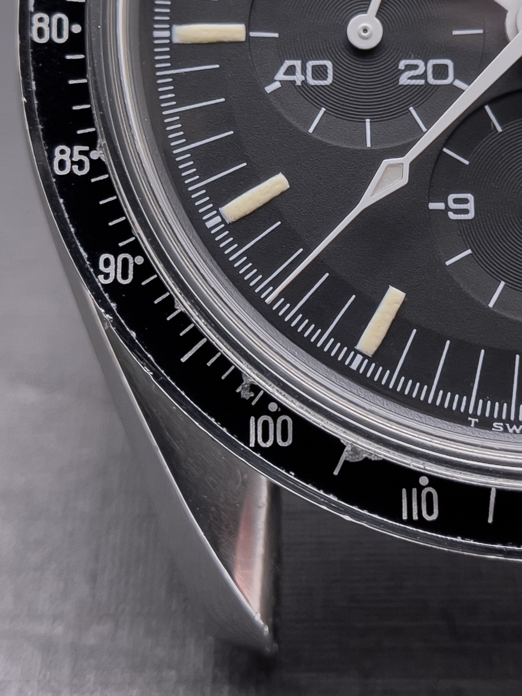 Over the last year I have picked up a couple other Speedies, which resulted in this one getting much less wrist time. I purchased this piece from fellow member Ndgal, which he had advertised as from 85. I don't have an extract for this, but using ilovemyspeedmaster.com I got an estimated March 1985 date. While I cannot say this is "unpolished" as I am not the original owner of this, the case does have sharp edges and shows wear commensurate with it's ~37 years of age. During service the case was not refinished. The original TACHYMETRE bezel is in overall great condition with small chips at 85, 93, 98, & 105, which is photographed below. The dial is in excellent condition with soft custardy tritium. The hands are original to the watch despite the tritium being softer in color than the dial. Please note there are two small cracks in the lume of the hour hand. During service, Kelly inspected these under microscope and confirmed the lume is secure. The pushers were rebuilt during service. The crystal is in good shape and could do with a light polish and has the present Ω in the center. The caseback has a superficial tool slip mark from a previous owner. Note the short tail Q and the ADB (A. Donze-Baum SA) Fir Tree. The 1171 with 633 end links is original to the watch and full size (with three additional links not photographed). During service I had the pins/tubes replaced and requested a new set of Omega spring bars. My wrist is between ~7" - ~7.25" and the bracelet is comfortably sized to the middle of 8 micro adjustments. As this is a full size bracelet, there is plenty of room for adjustment in either direction.
