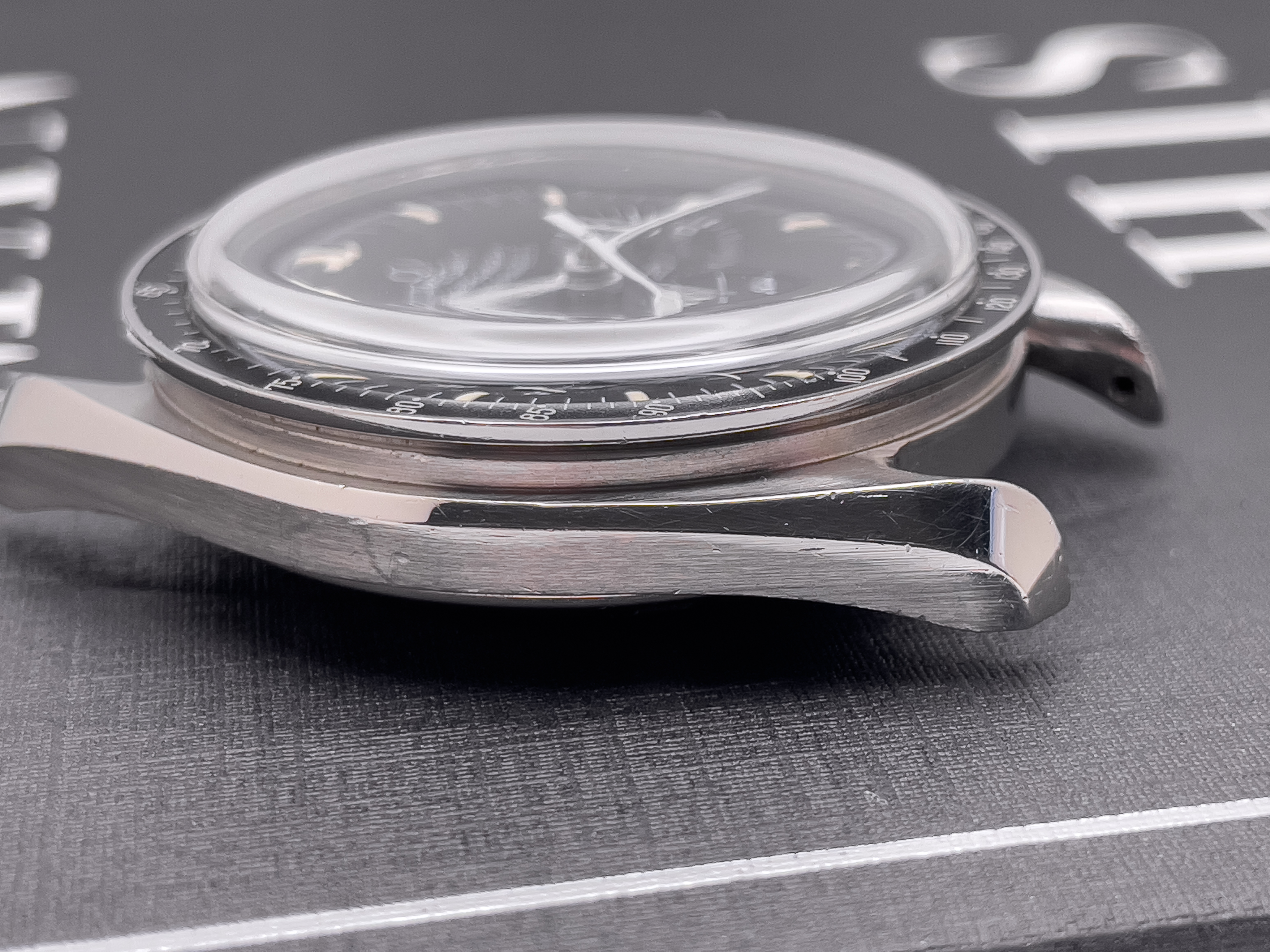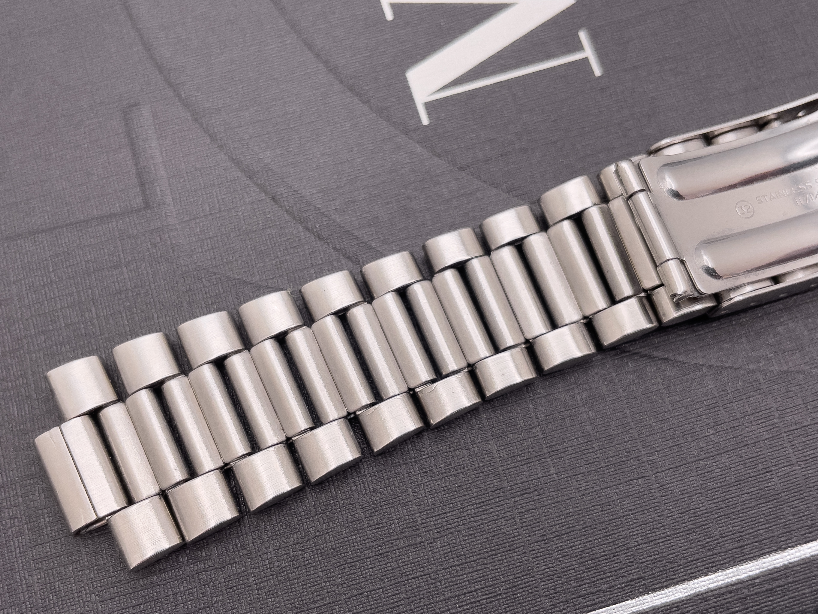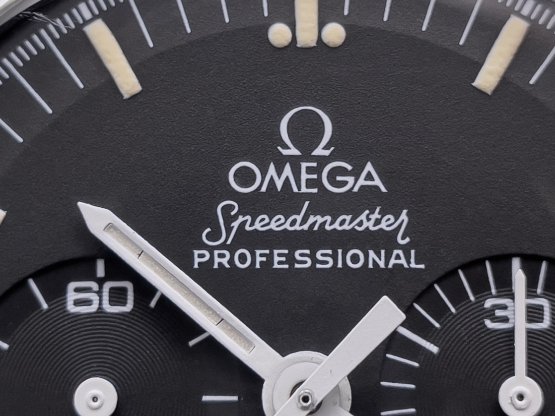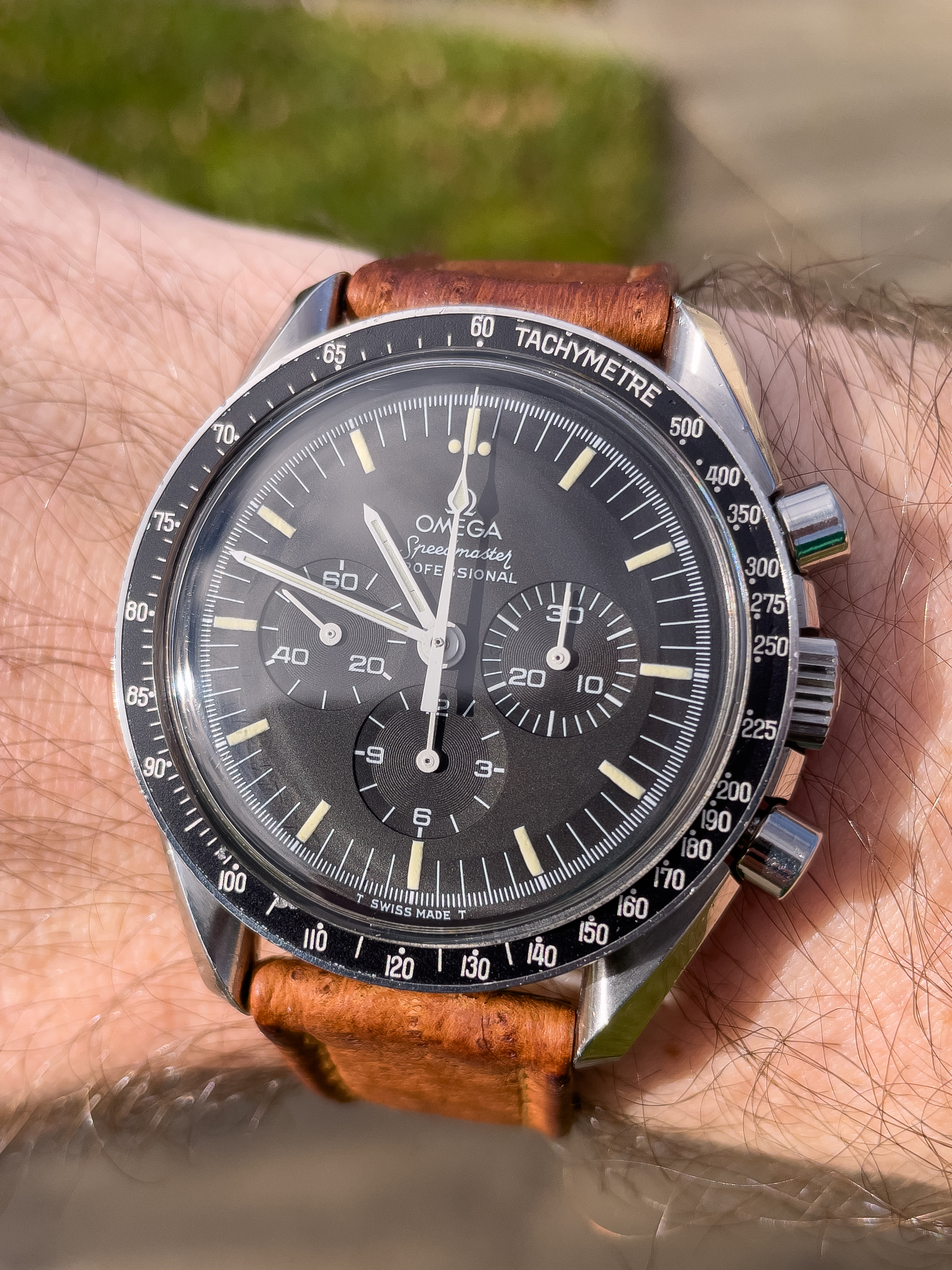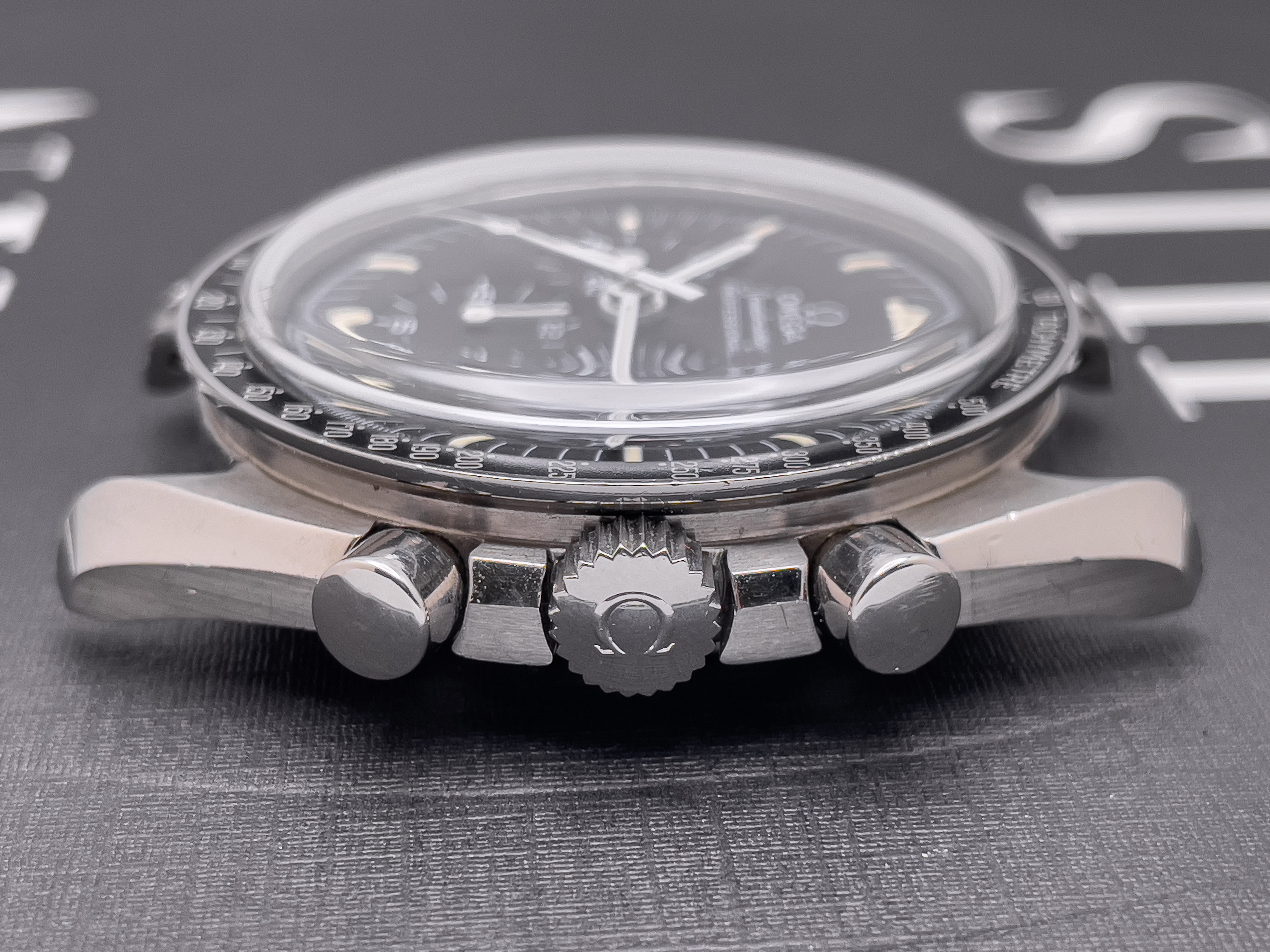 Over the last year I have picked up a couple other Speedies, which resulted in this one getting much less wrist time. I purchased this piece from fellow member Ndgal, which he had advertised as from 85. I don't have an extract for this, but using ilovemyspeedmaster.com I got an estimated March 1985 date. While I cannot say this is "unpolished" as I am not the original owner of this, the case does have sharp edges and shows wear commensurate with it's ~37 years of age. During service the case was not refinished. The original TACHYMETRE bezel is in overall great condition with small chips at 85, 93, 98, & 105, which is photographed below. The dial is in excellent condition with soft custardy tritium. The hands are original to the watch despite the tritium being softer in color than the dial. Please note there are two small cracks in the lume of the hour hand. During service, Kelly inspected these under microscope and confirmed the lume is secure. The pushers were rebuilt during service. The crystal is in good shape and could do with a light polish and has the present Ω in the center. The caseback has a superficial tool slip mark from a previous owner. Note the short tail Q and the ADB (A. Donze-Baum SA) Fir Tree. The 1171 with 633 end links is original to the watch and full size (with three additional links not photographed). During service I had the pins/tubes replaced and requested a new set of Omega spring bars. My wrist is between ~7" - ~7.25" and the bracelet is comfortably sized to the middle of 8 micro adjustments. As this is a full size bracelet, there is plenty of room for adjustment in either direction.