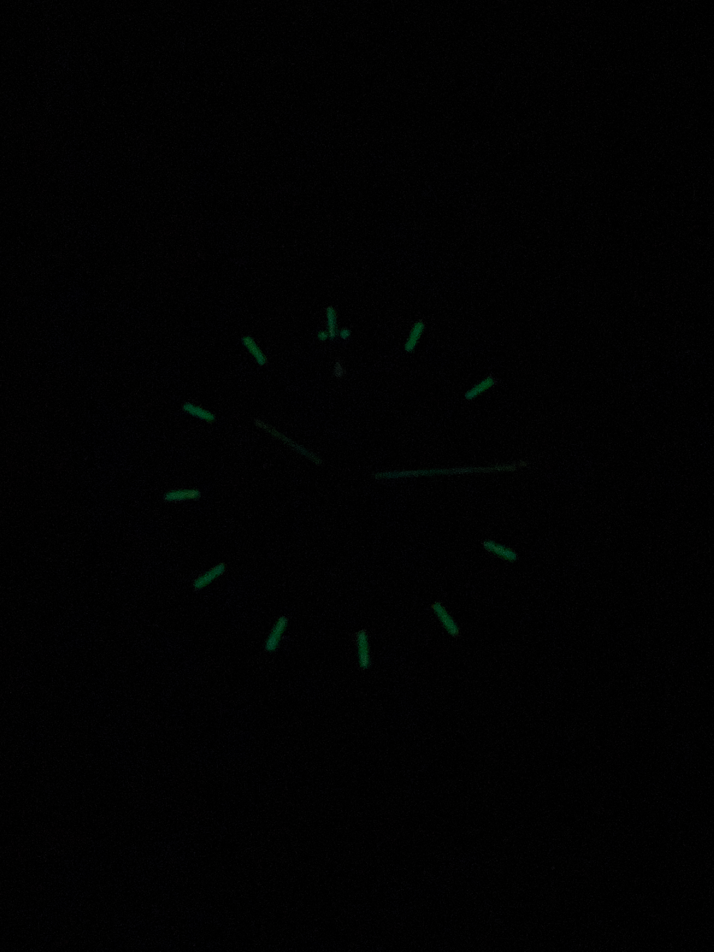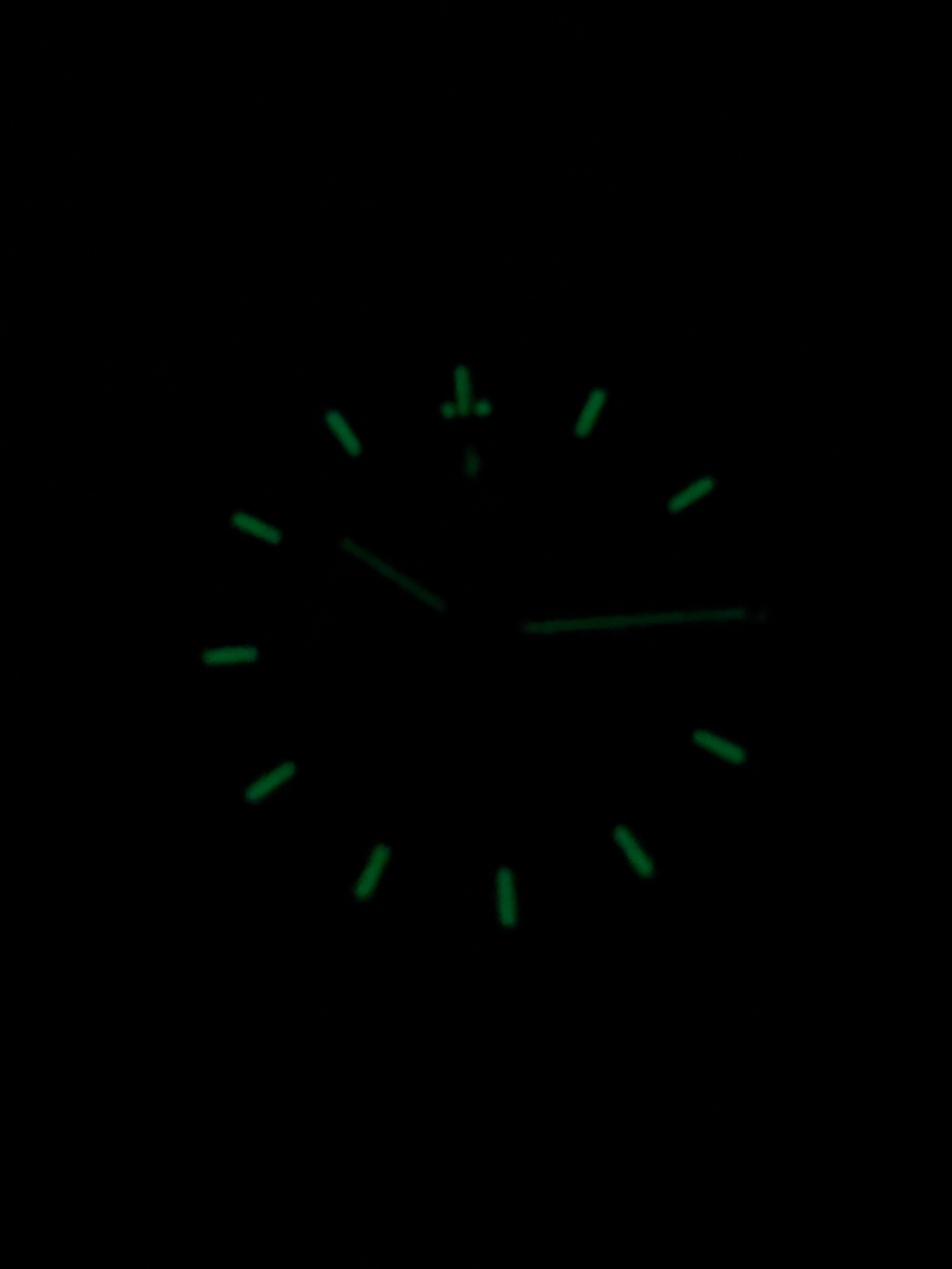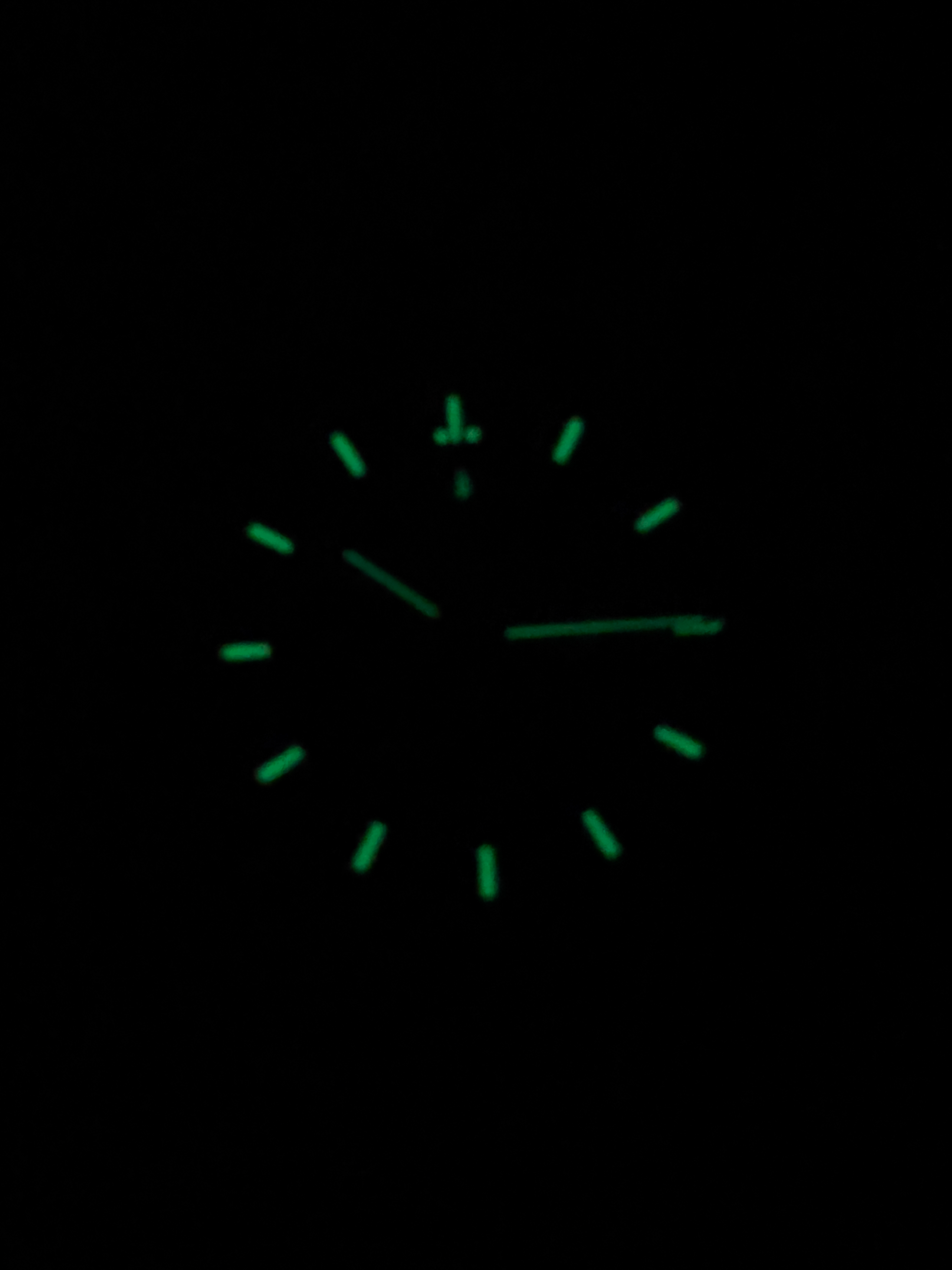 Charged by the sun, these lume shots span maybe 20 seconds. Note the short distance travelled by the minute hand as it moves just over the 3 o'clock indice.