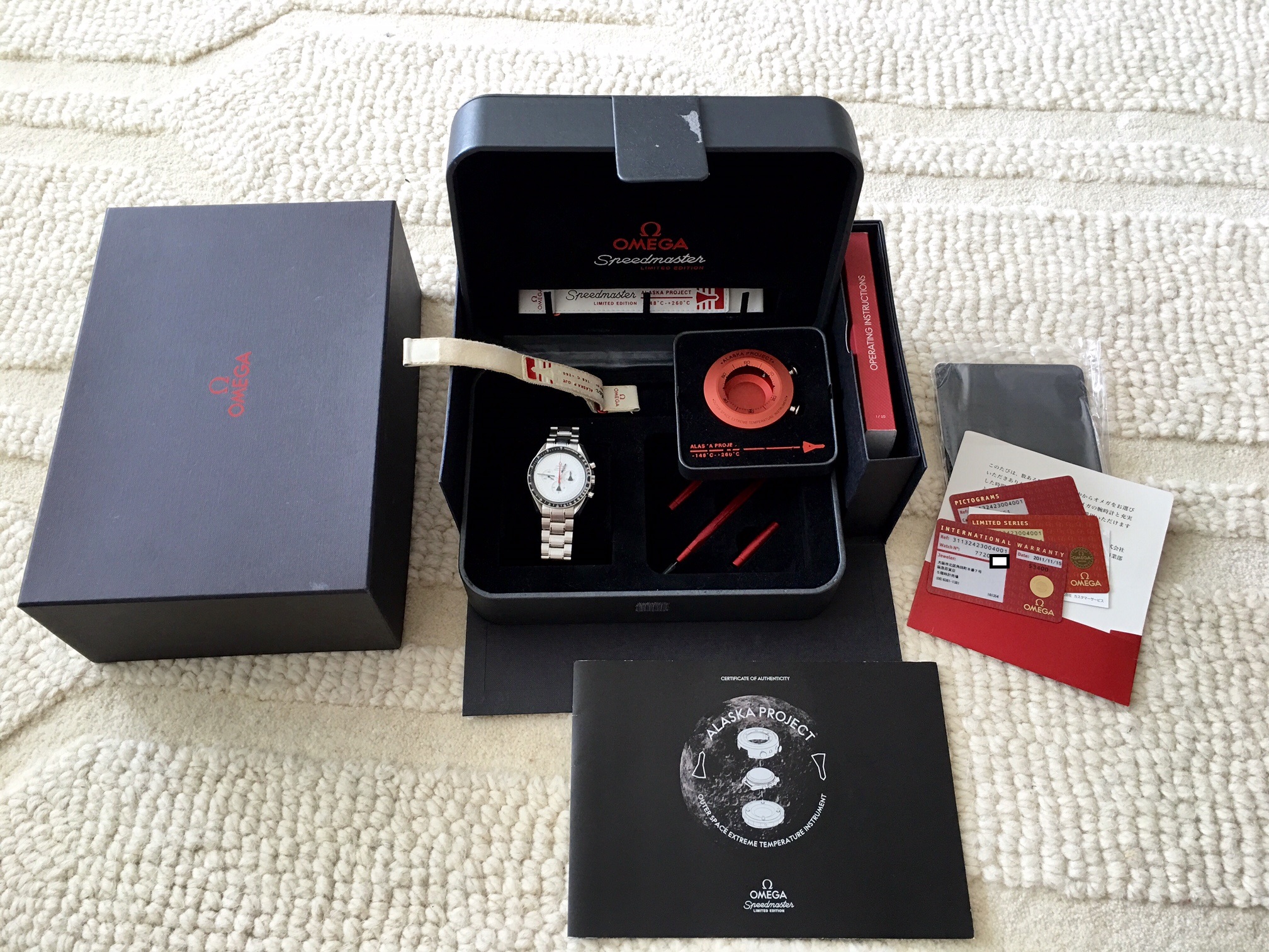 I have an Omega Speedmaster Professional 311.32.42.30.04.001 "Alaska Project" for sale. It comes with only what is stated or shown in photos. It runs well and has plenty of amplitude. Please view pictures for any wear marks. Created in a limited 1975 batch. The red case is a little lighter than normal looks like a bit of sun fading otherwise in great shape.