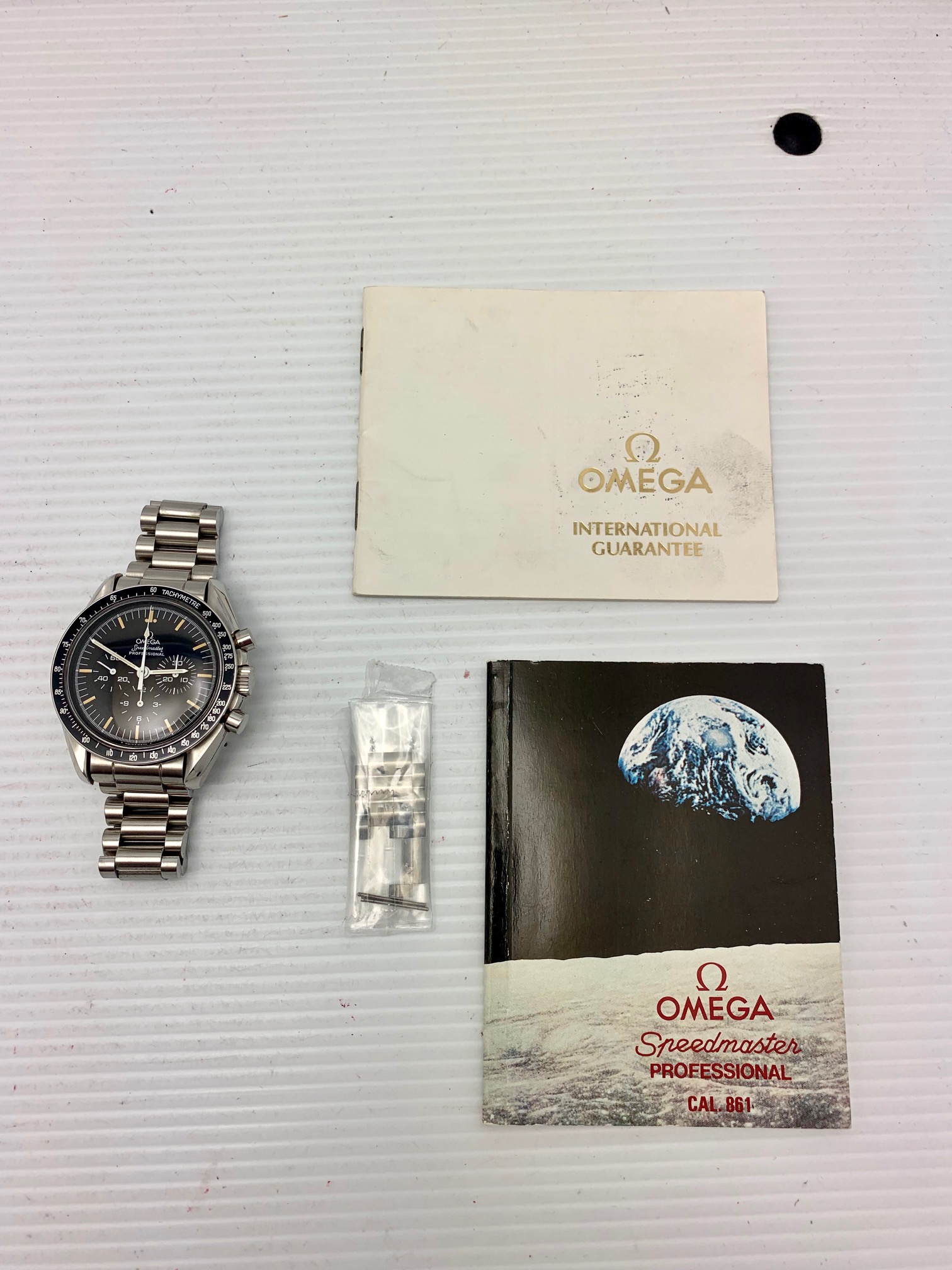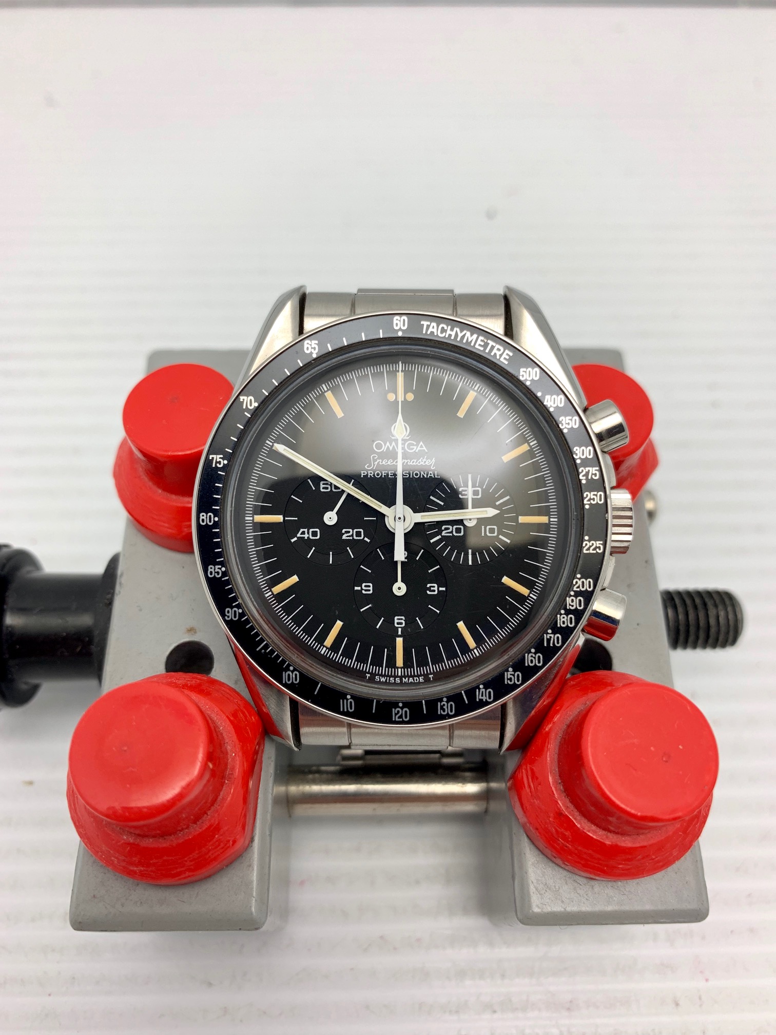 I have an Omega Speedmaster Professional 345.0808 second series A1000 for sale. The Hesalite look with viewing of the beautiful movement! Please take a look at photos for condition. This is part of the second series of 1000 produced with the yellow gilt movement.