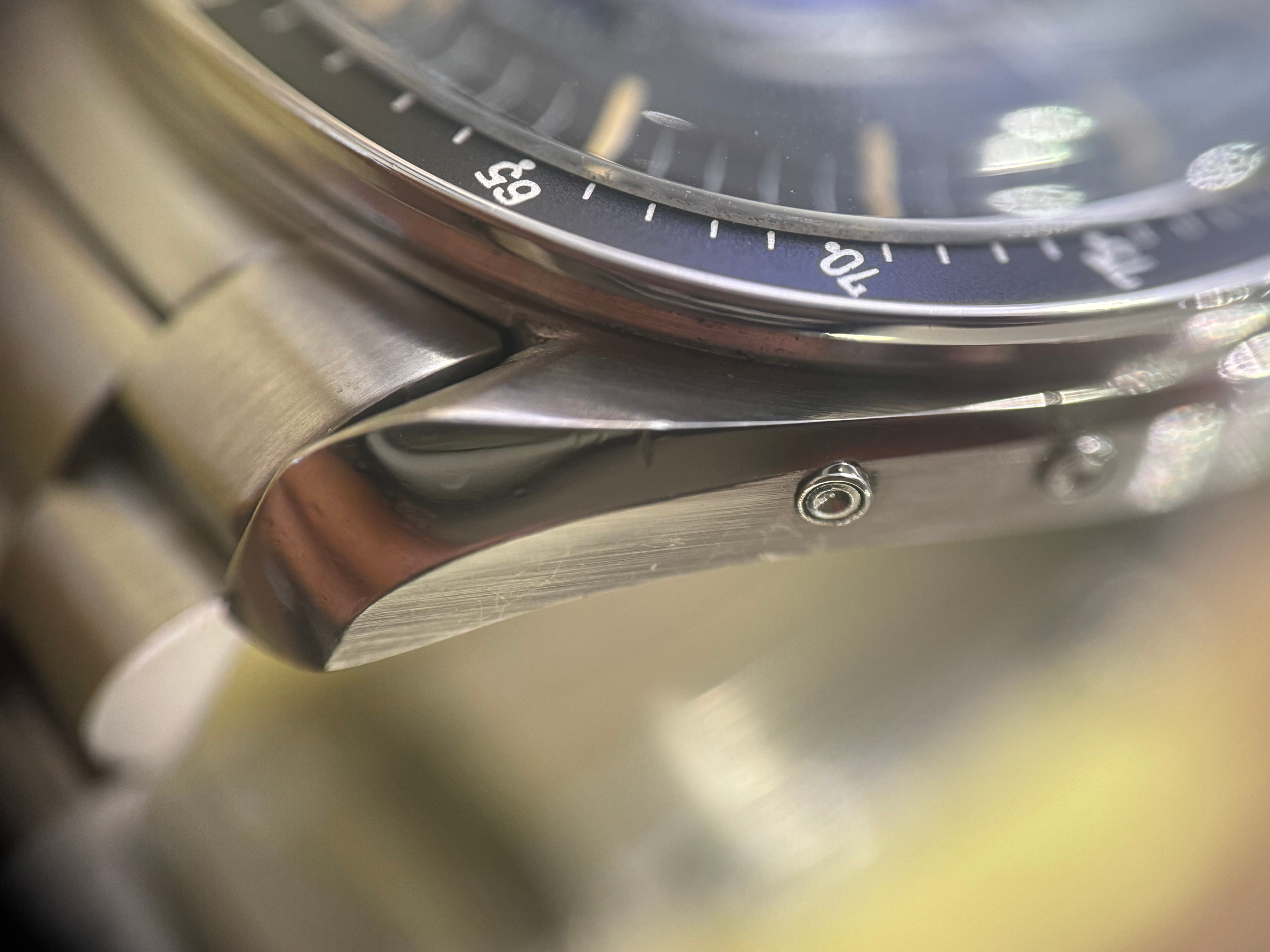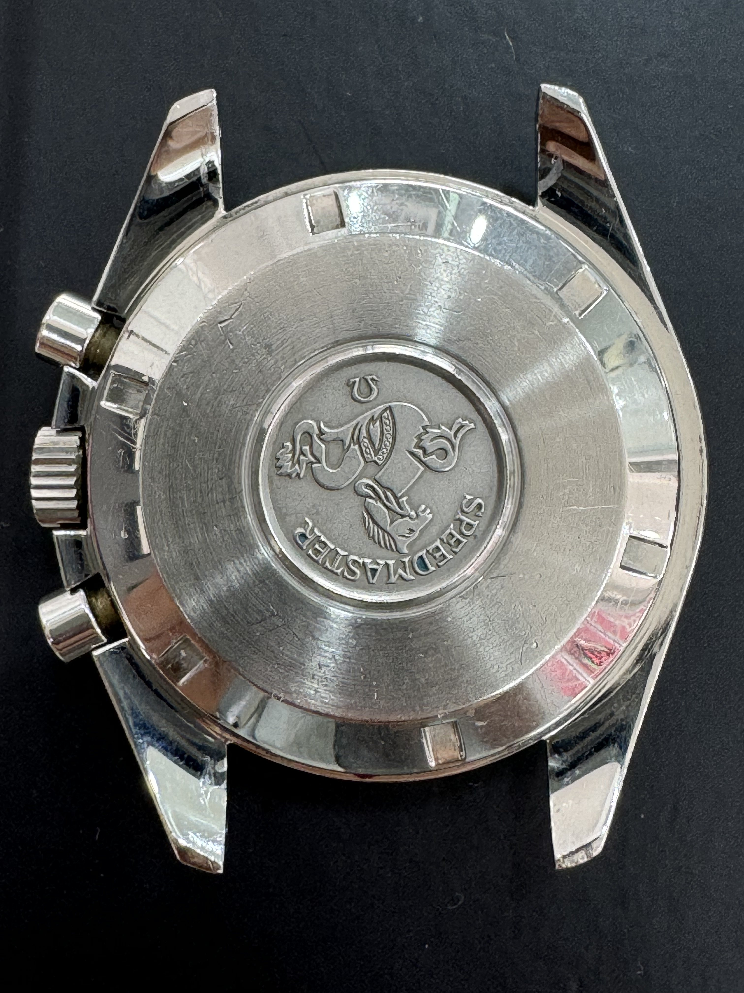 Case (asymmetrical/twisted lugs; type B1) and caseback (no engraving, smooth medallion; type C2): in good condition, with some signs of mild polishing and a few small dents/dings/chips only visible under magnification.