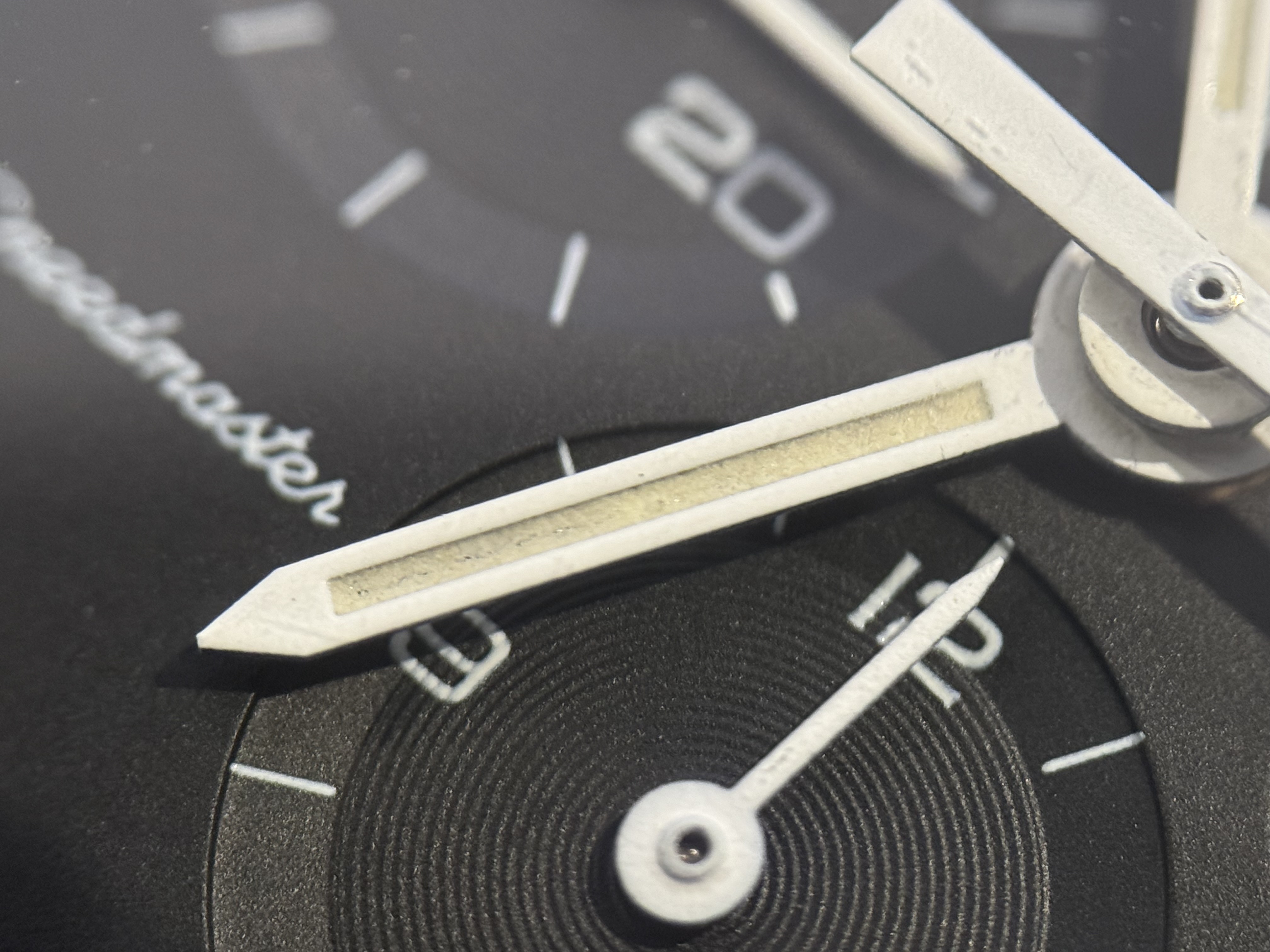 Hands (painted baton/stick, flat-end chronograph seconds, tritium; configuration C1): in very good condition, with a very pleasing patina. The hour hand has a very minor amount of cracking only visible under magnification.