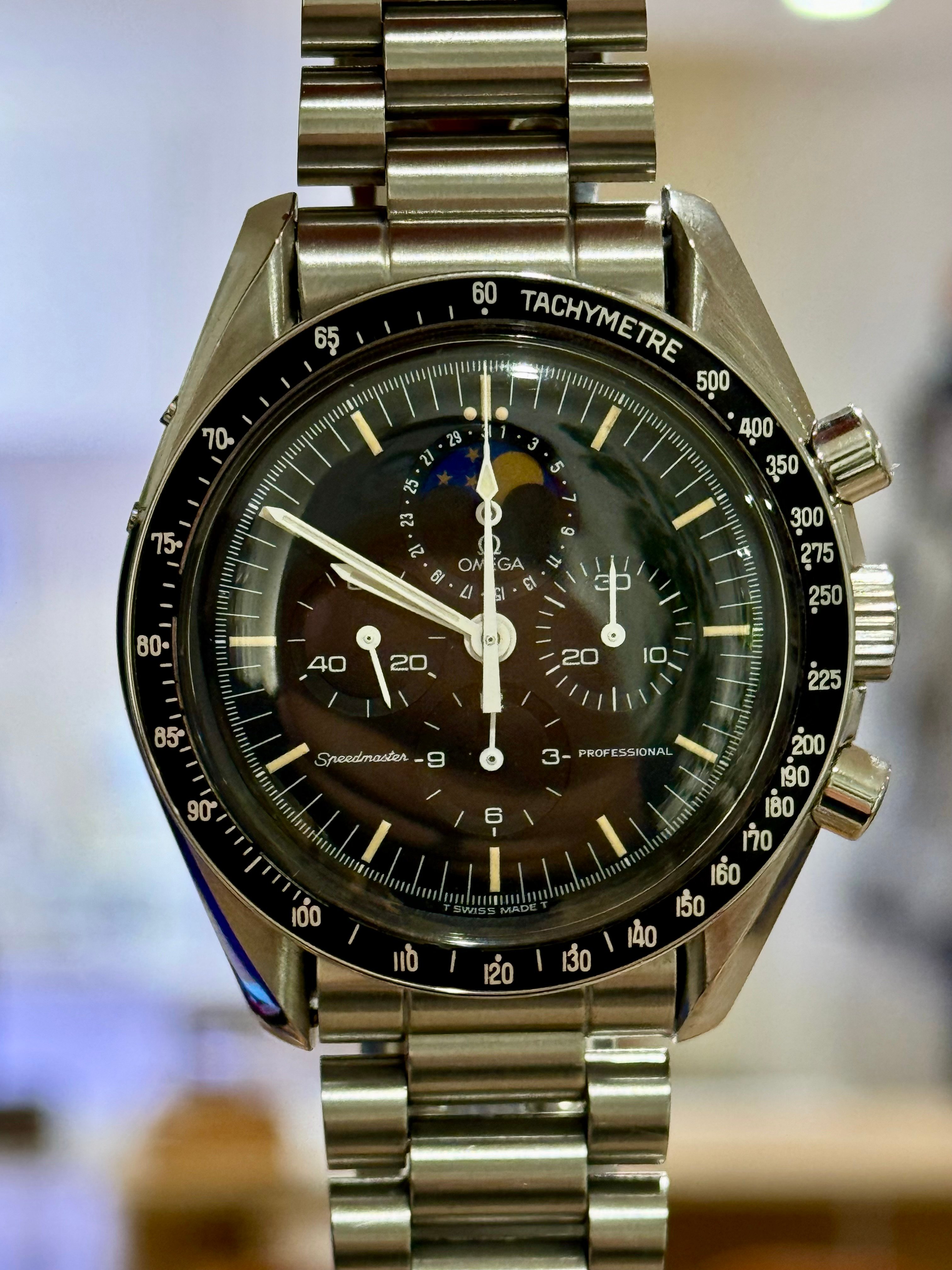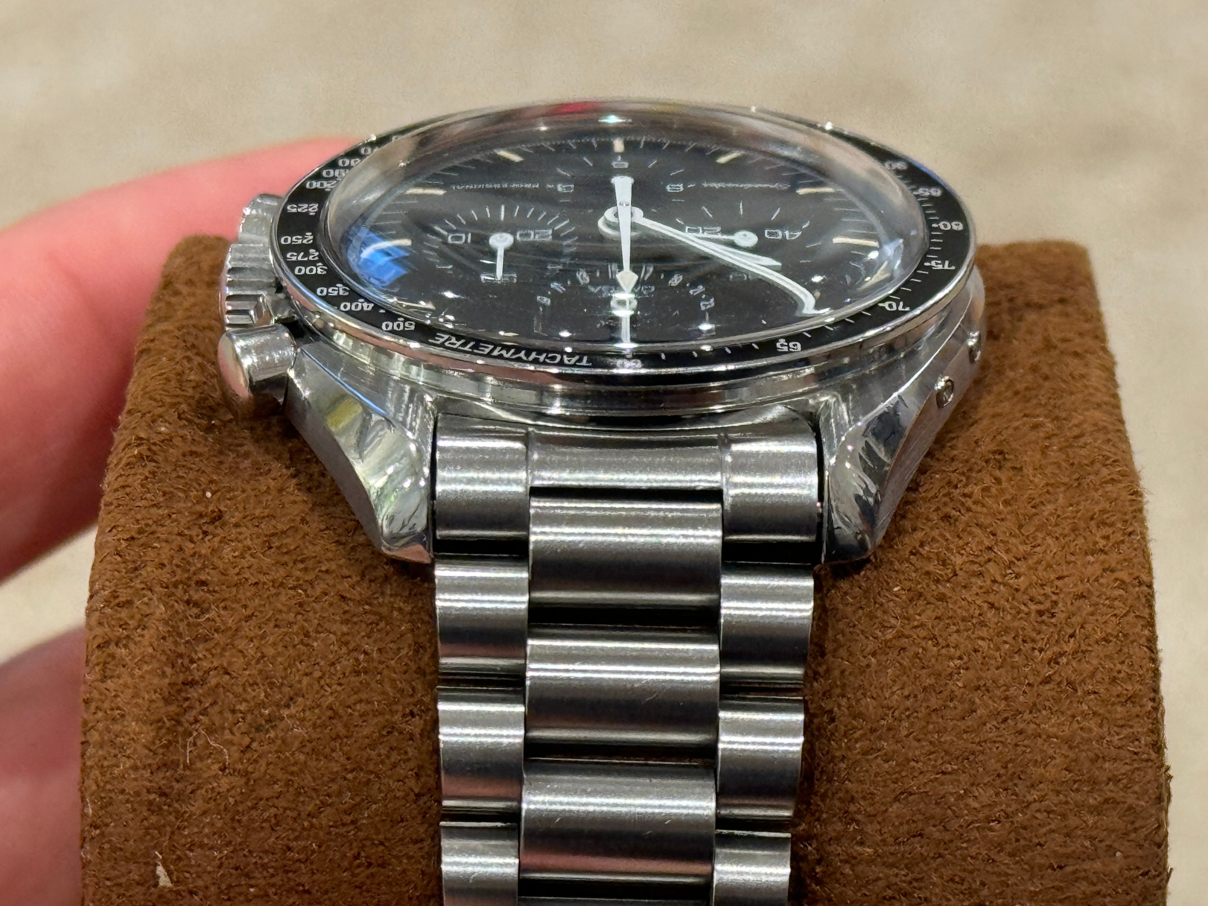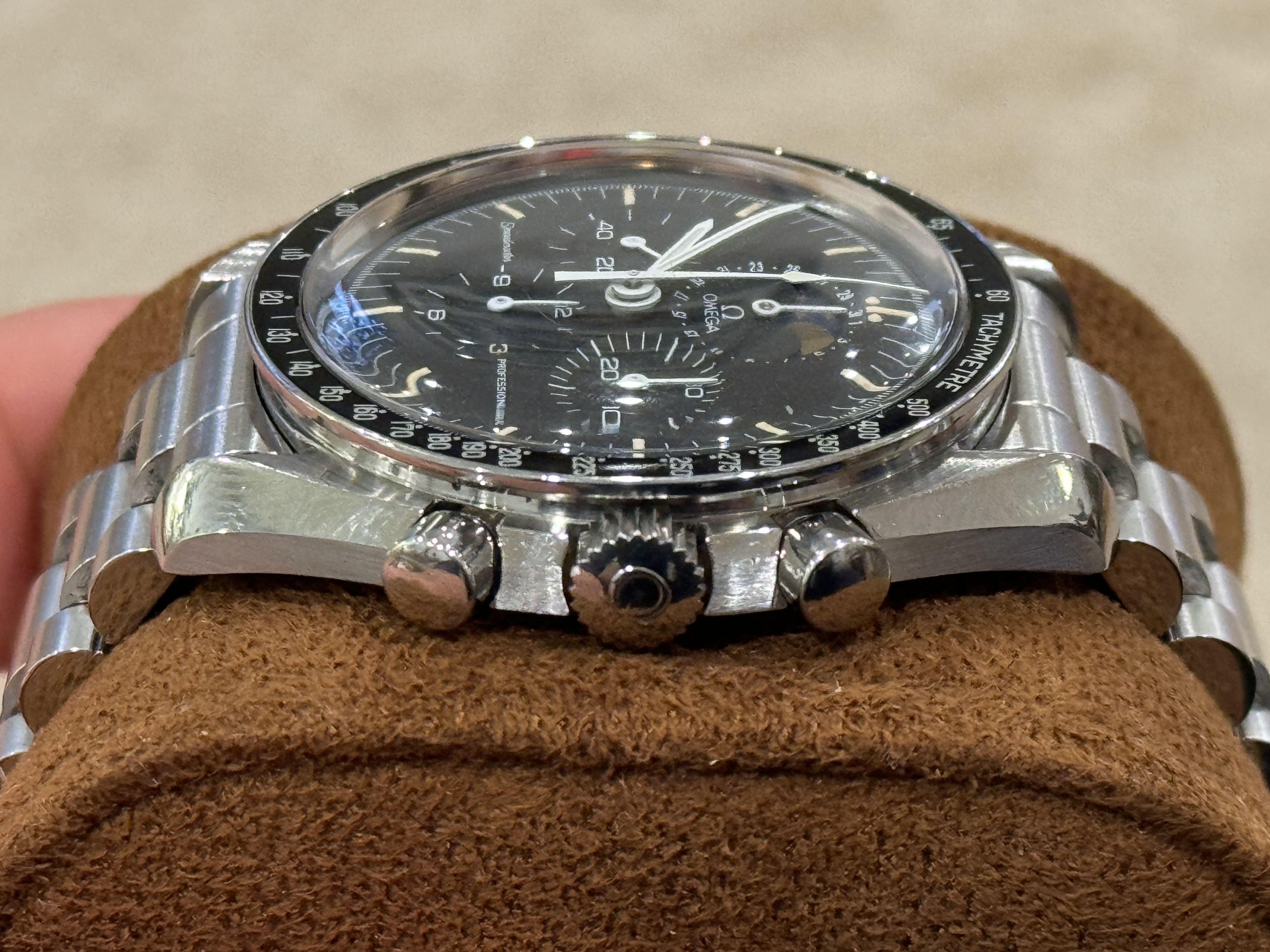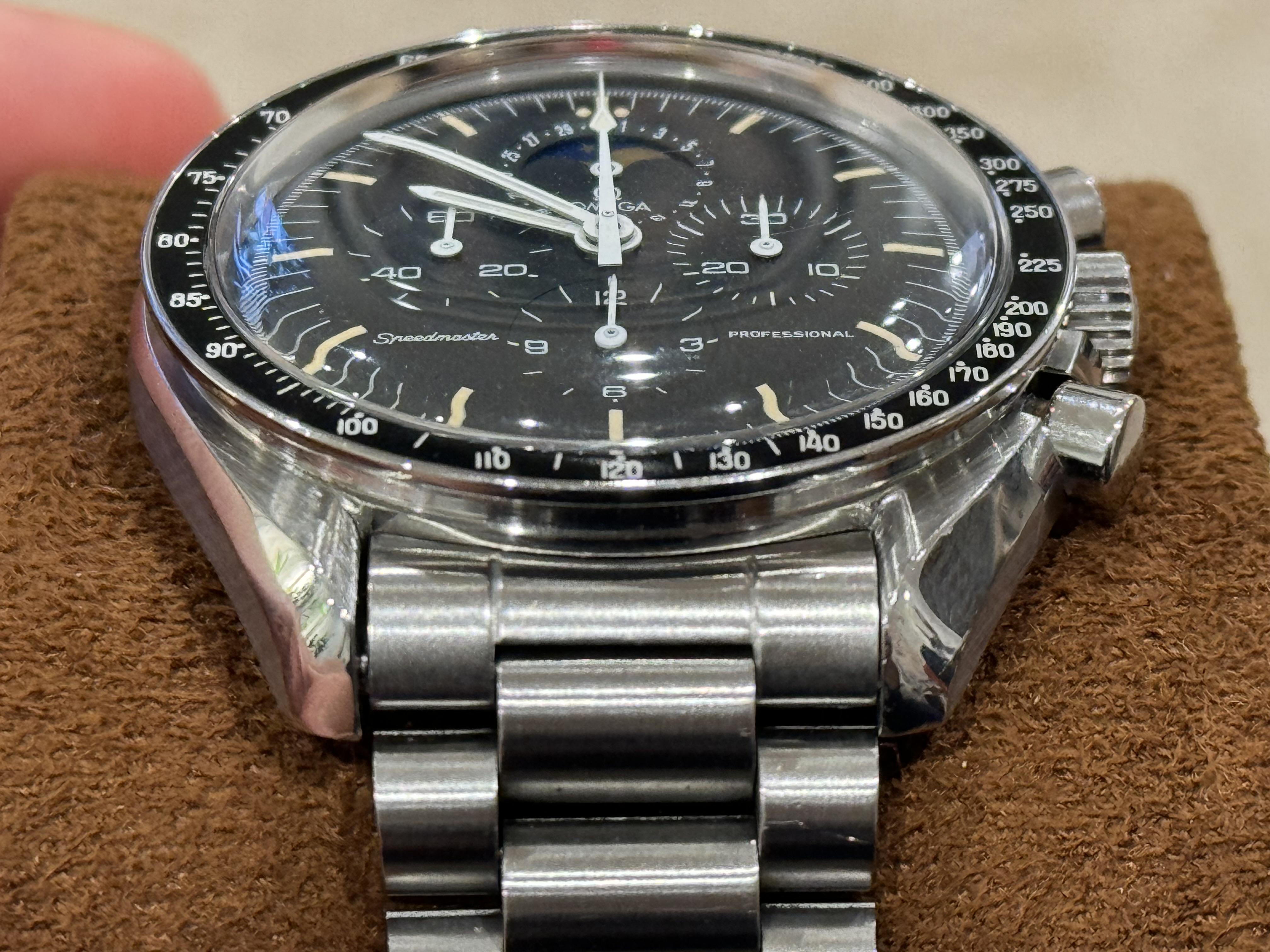 Glass (hesalite; category A): in very good condition, without the etched Omega logo, which is original for this reference, per the MoonWatch Only book. No major scratches that can't be buffed out.