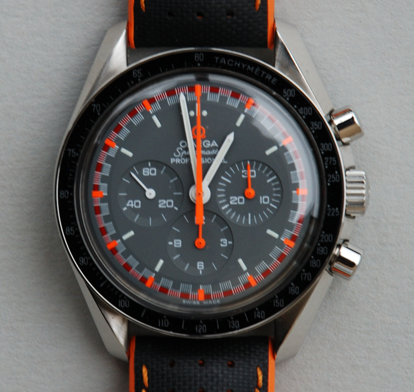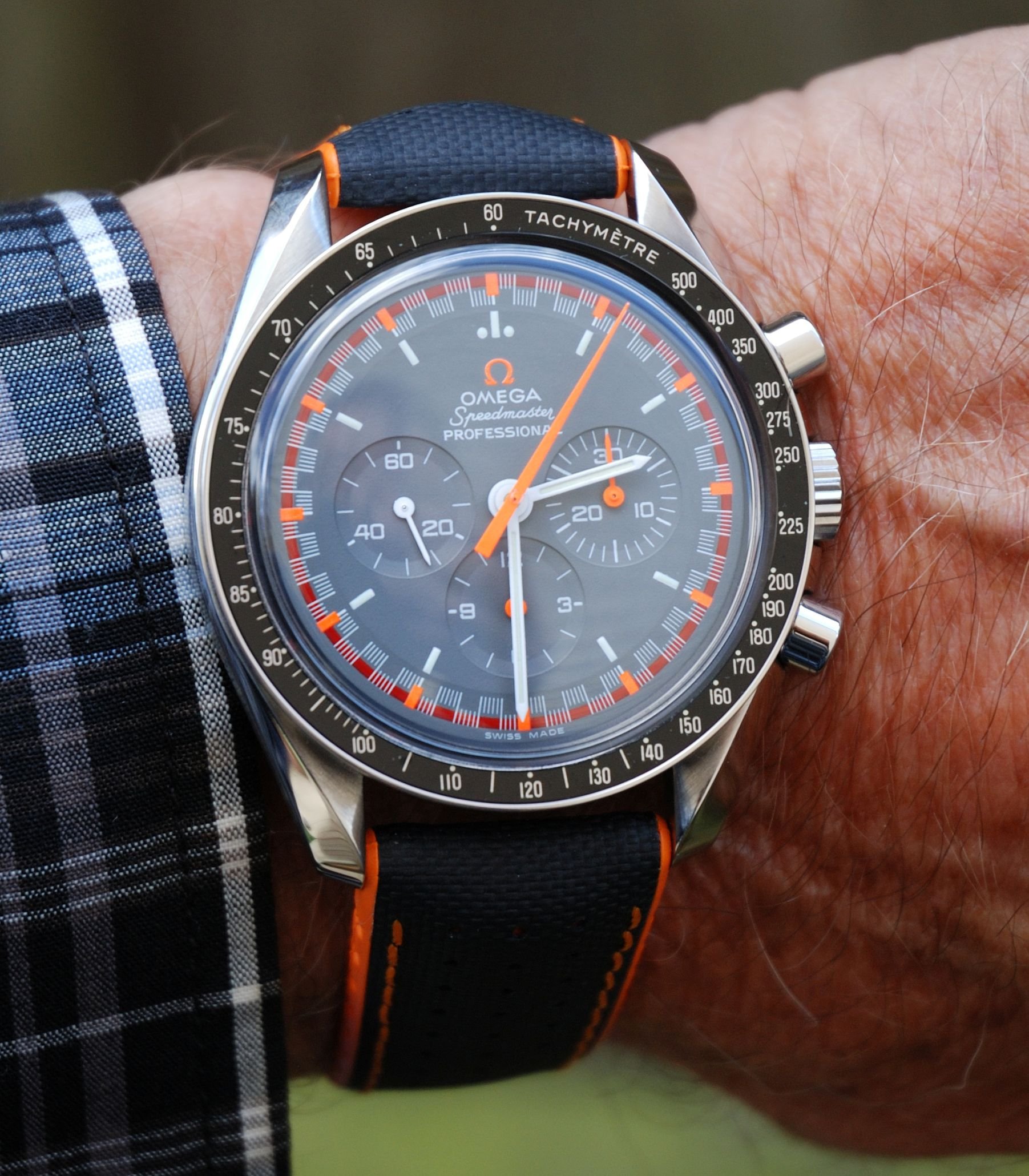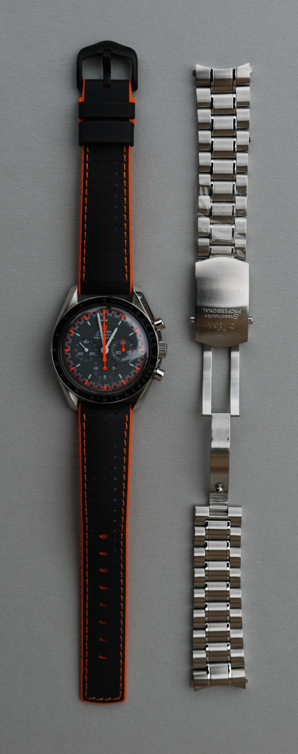 ·Omega Speedmaster Professional, 3570-40, 2004 ‘Japan Racing’ limited edition chronograph in excellent + condition, with outer white box, red leatherette box, instructions book, cards holder and hangtag. Watch is on a Hirsch ‘Robby’ sailcloth strap, but also supplied is the original (I presume), and apparently unworn, Omega 1998/849 bracelet.