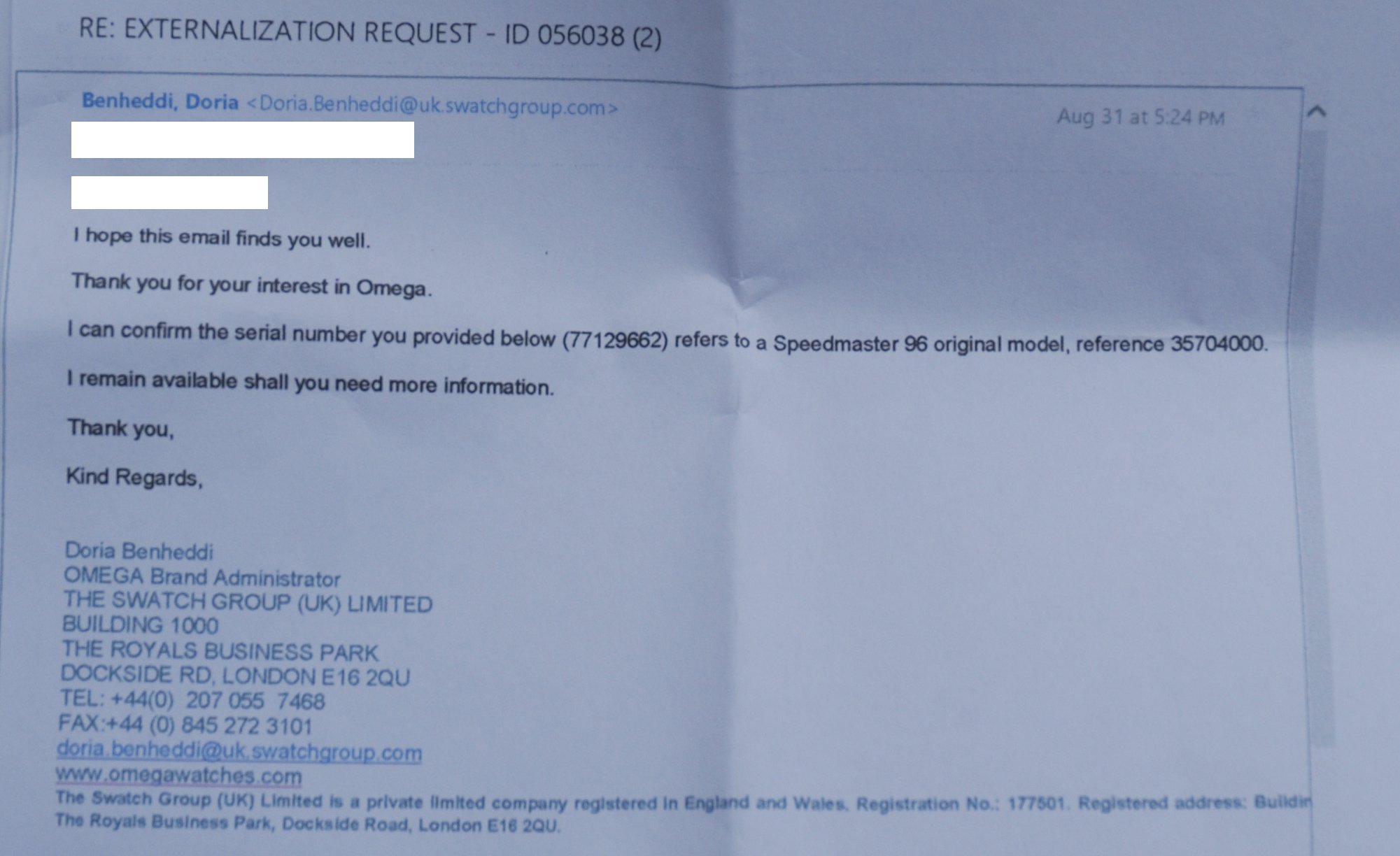 I am also aware of the availability of kits to ‘convert’ standard 3570-50s with a ‘Racing’ dial and hands. Prior to my purchase of this watch (in 2016) I took the precaution, with reference to the serial number, of obtaining written confirmation from Omega that this watch was manufactured as a 3570-40 - copy e-mail illustrated below and supplied with the watch.