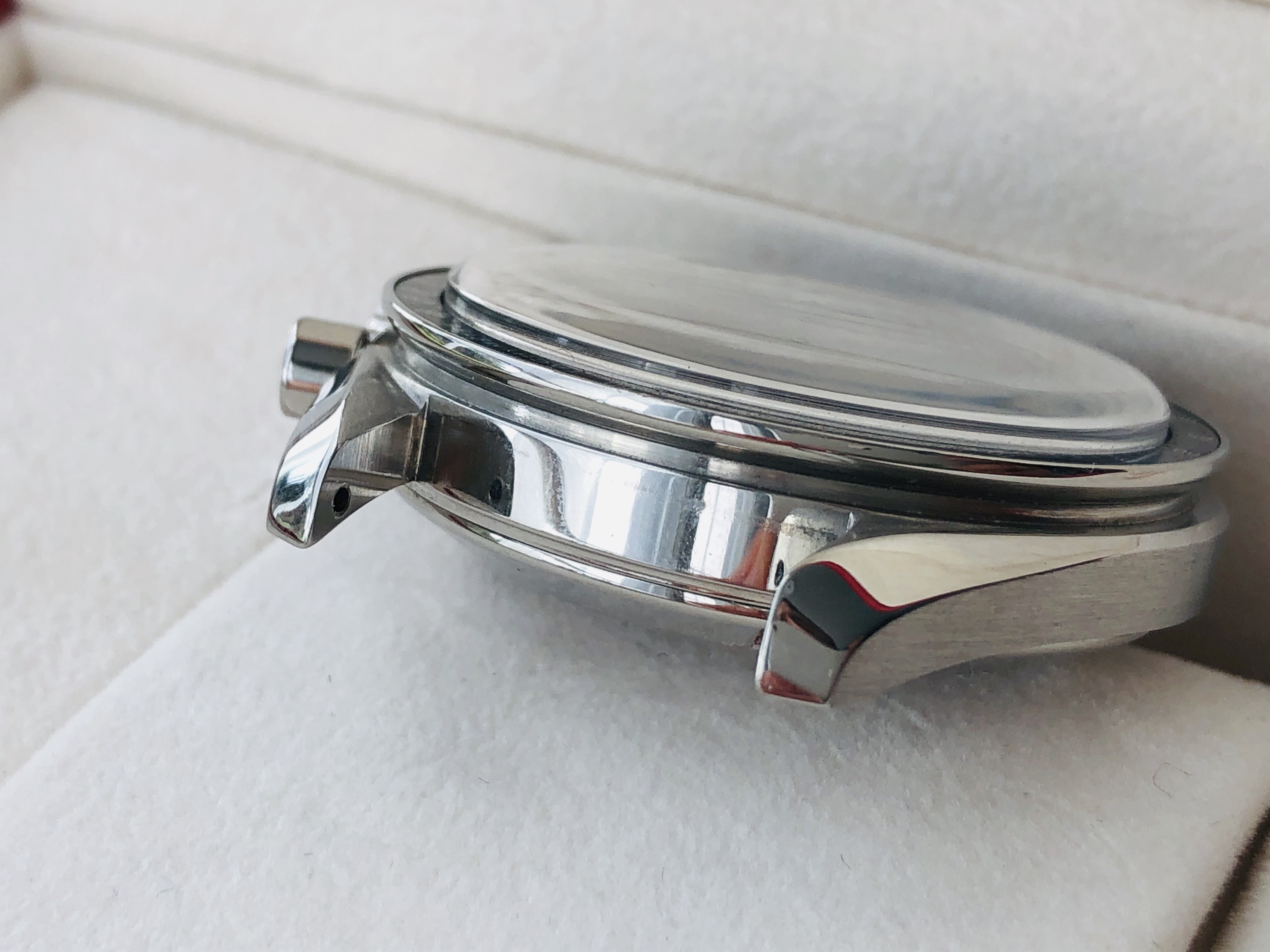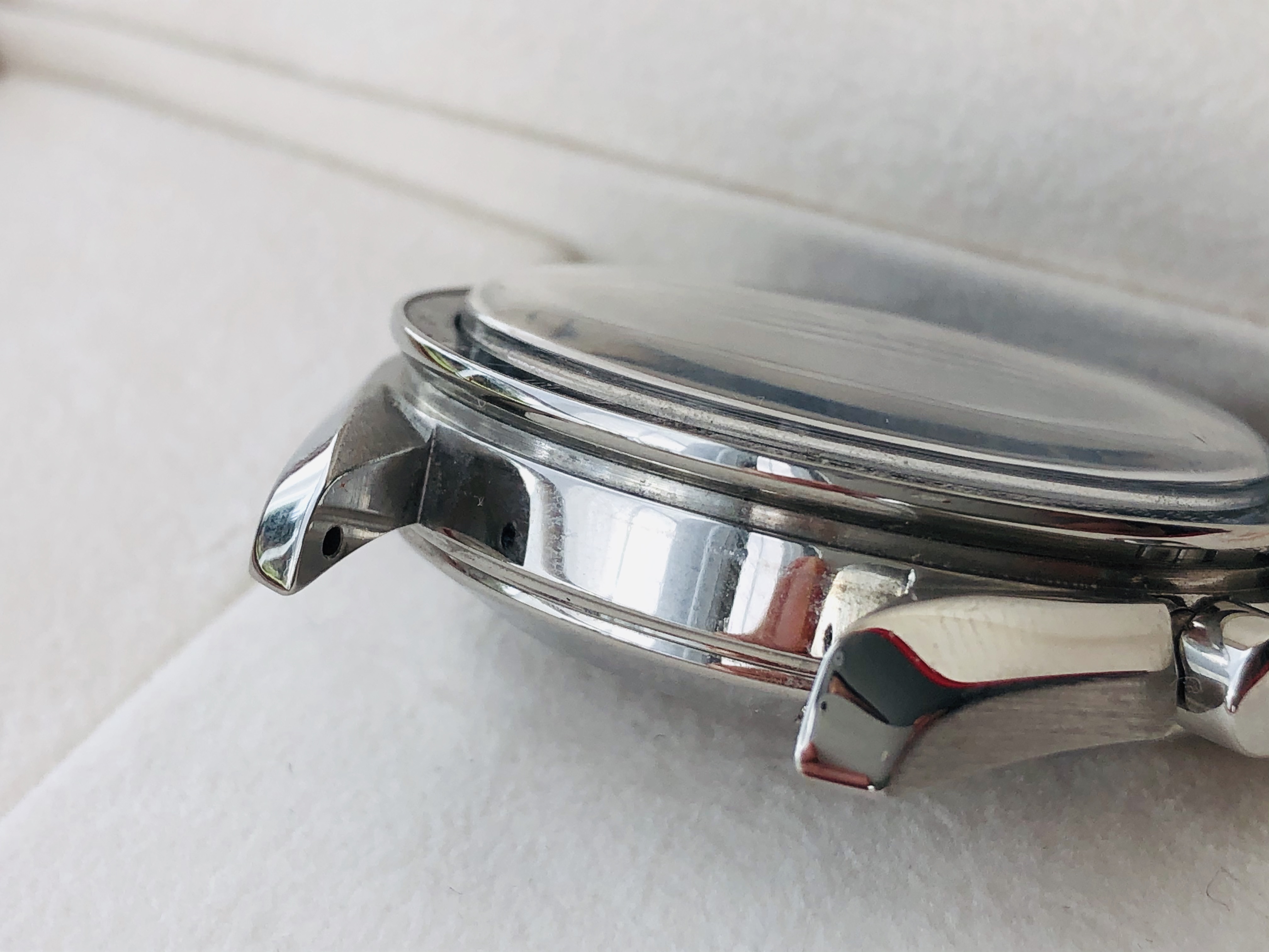 Condition: Very good. There are a few scratches on the underside of the lugs from strap and bracelet changes. There is a tiny dent on the crown-side of the bezel.