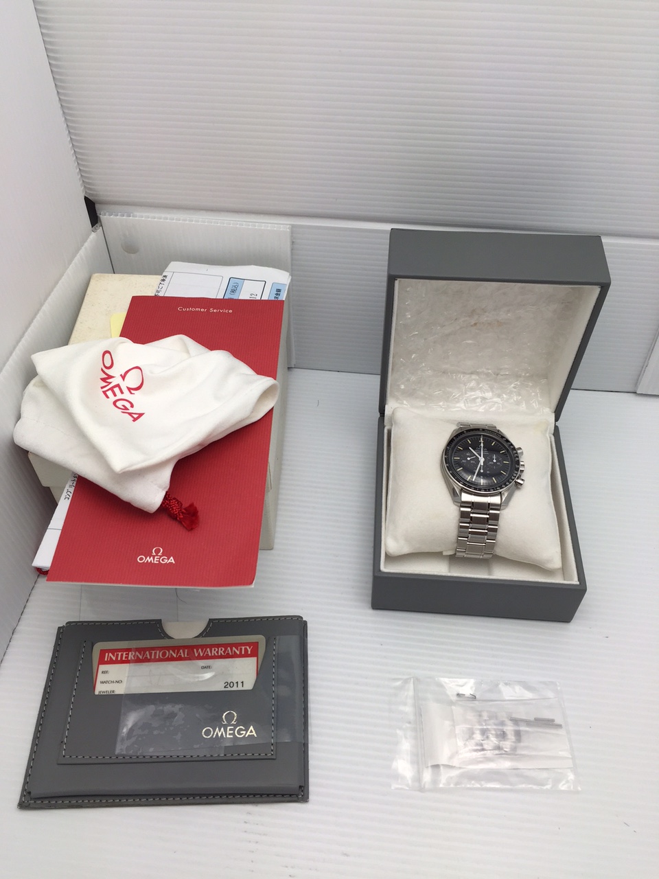 Accessories: Boxes, manuals, card holder, warranty card, service paperwork, omega travel bag