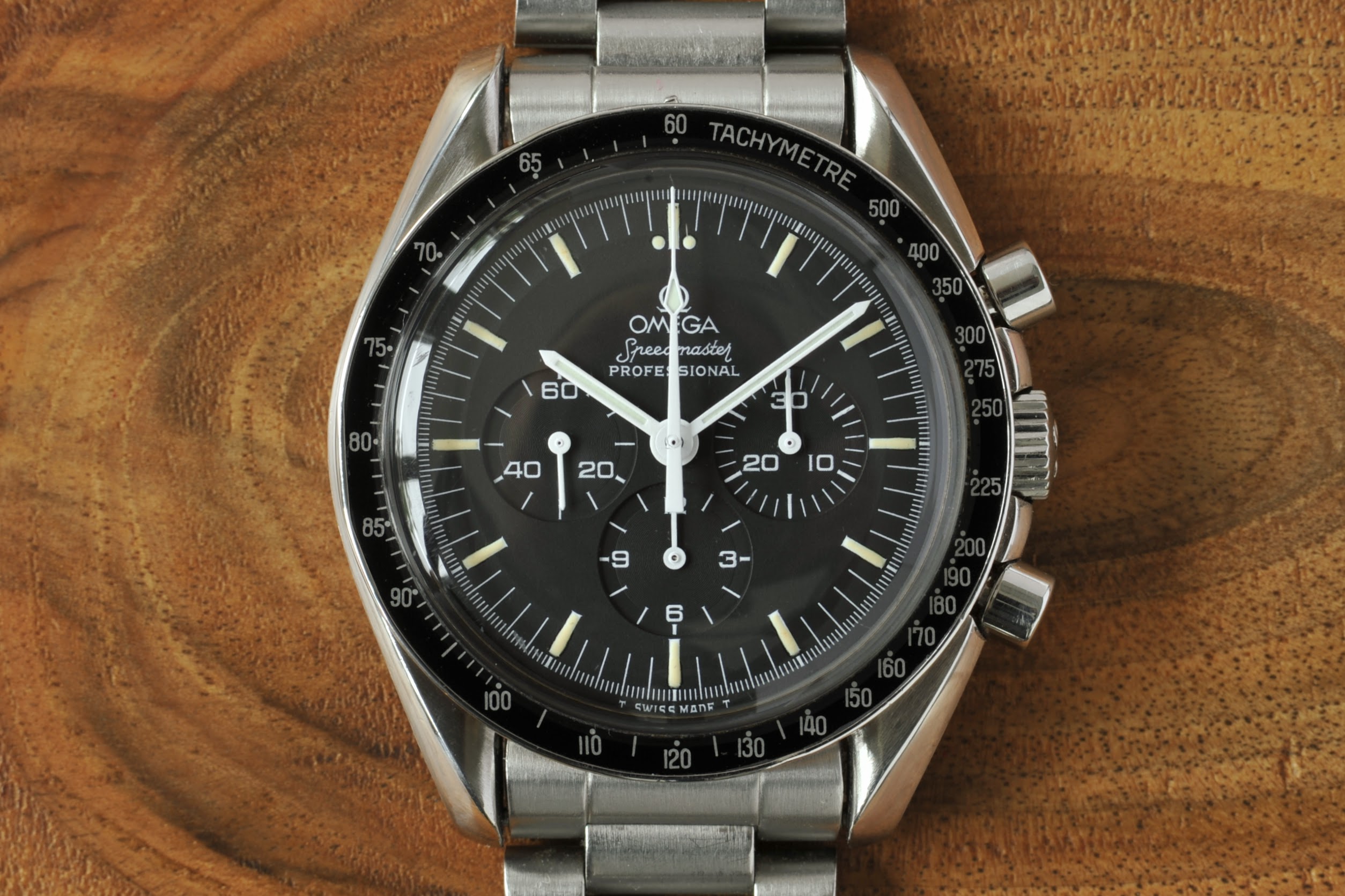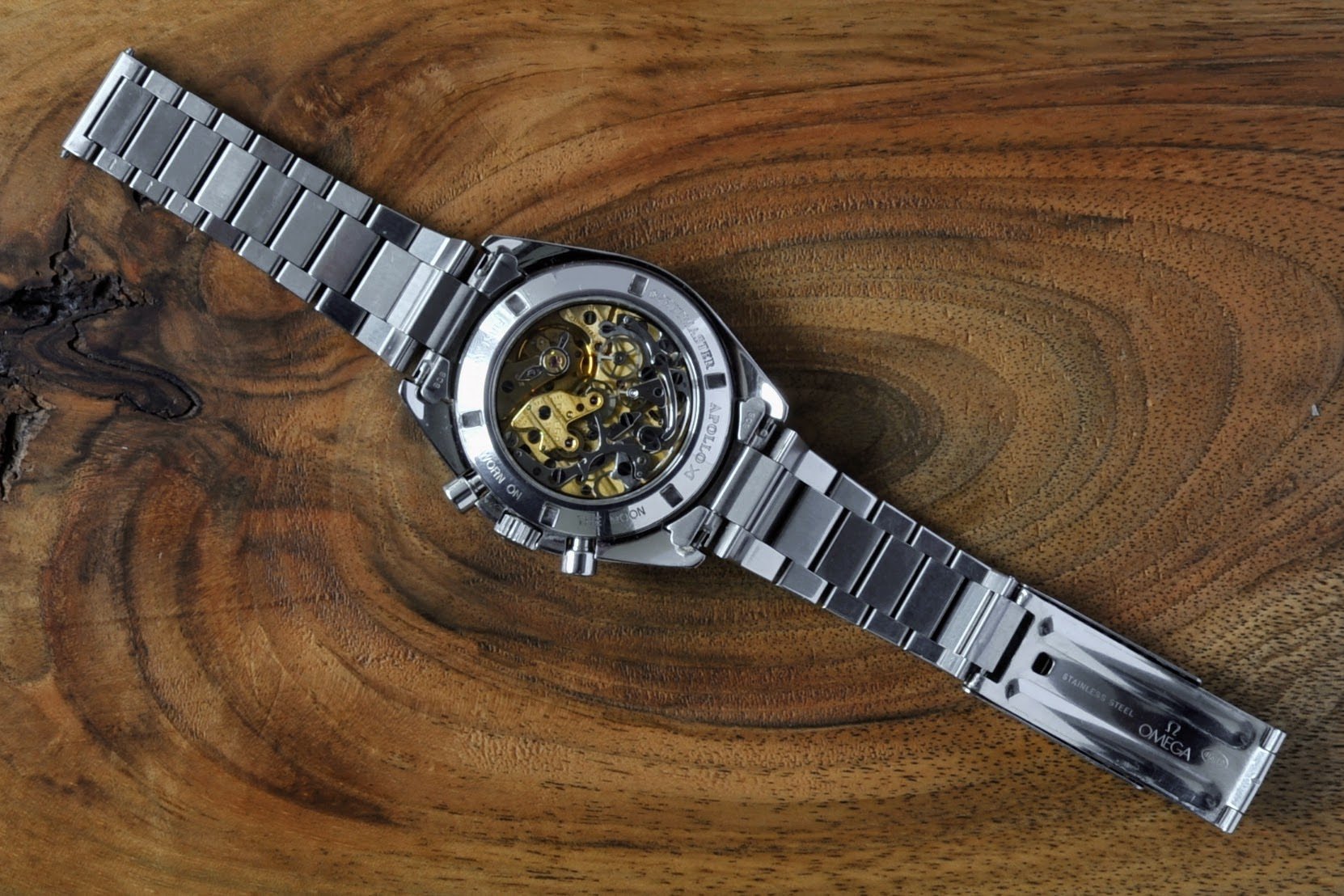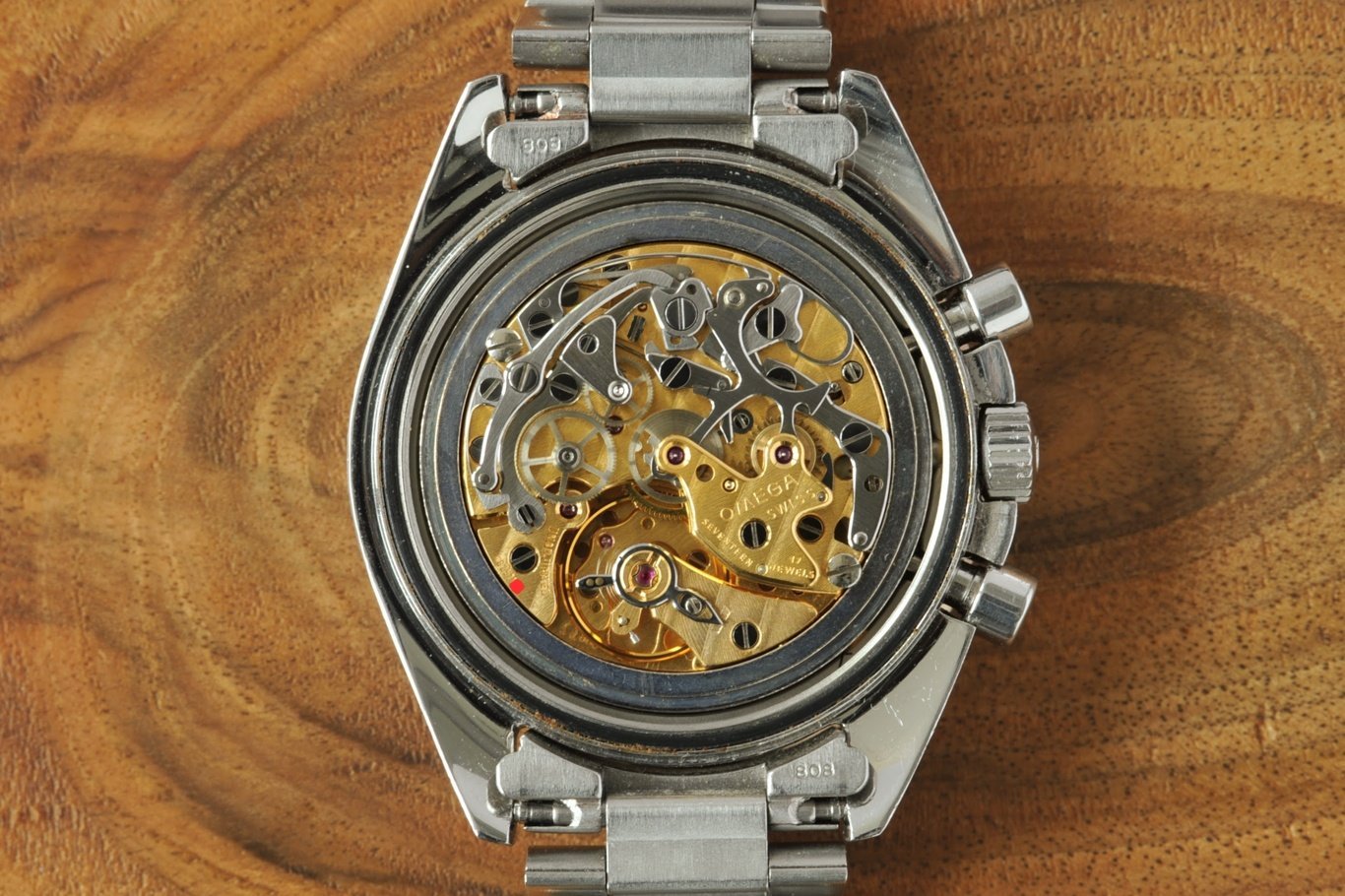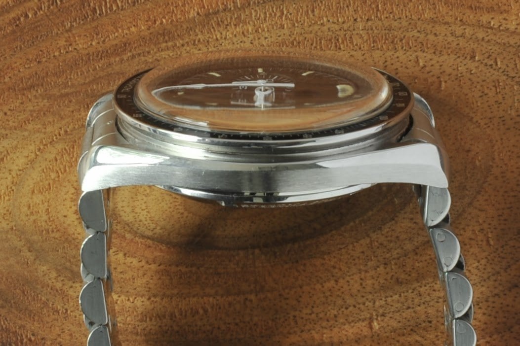 The case appears unpolished to me with only a few lights marks commensurate with age. Original A3 wide 24t crown and type 4 wide & tall pushers. The case back is correct D3 stamped Apollo XI and numbered A 0587.