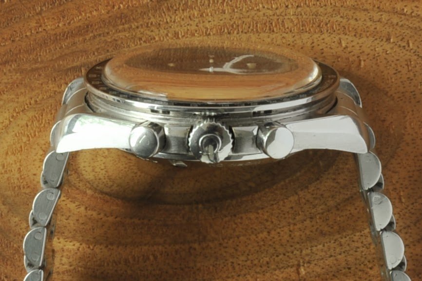 The watch has aged well with a lovely patina. The dial has vanilla hour plots as is often seen with this reference. Dial is correct C4 with tall and closed S. The bezel is correct B2 dot close to 70 - narrow C. Hands are correct baton with flat end chrono.