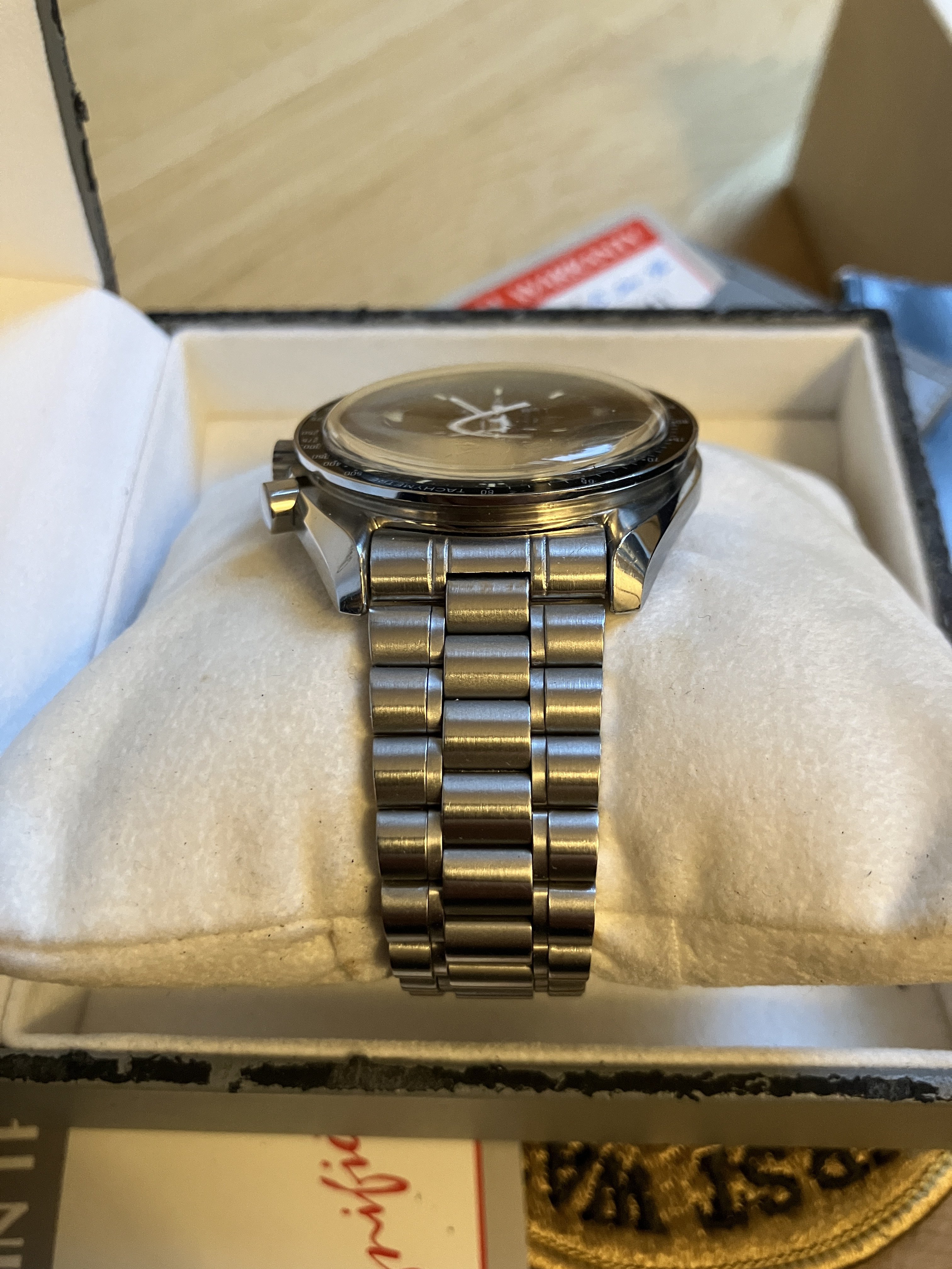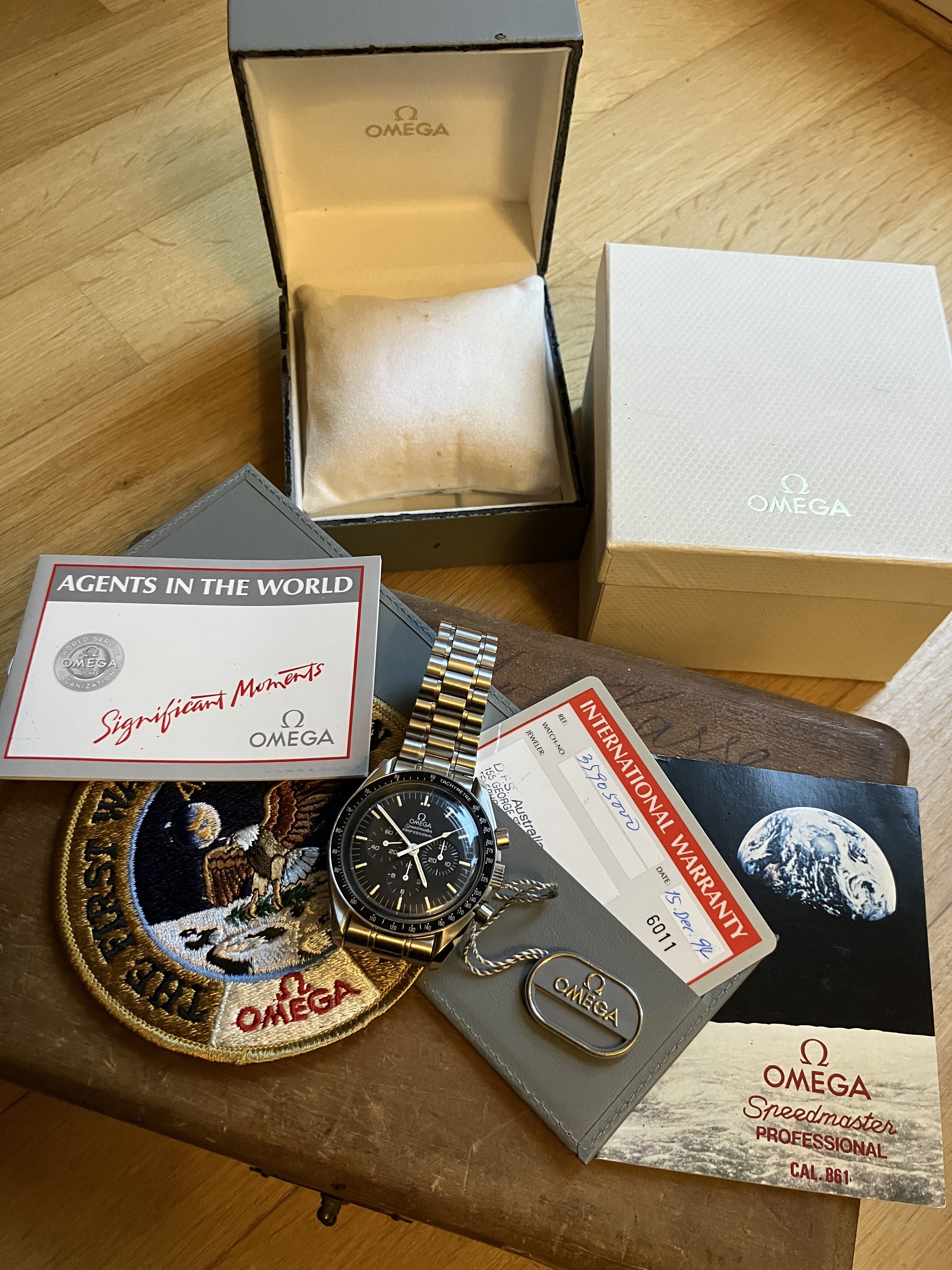 Original omega outer box in white, grey speedmaster Box, card holder, card, missions patch, booklet and even the Hangtag with matching serial / reference sticker is included. There‘s literally nothing more to ask for for a full set.