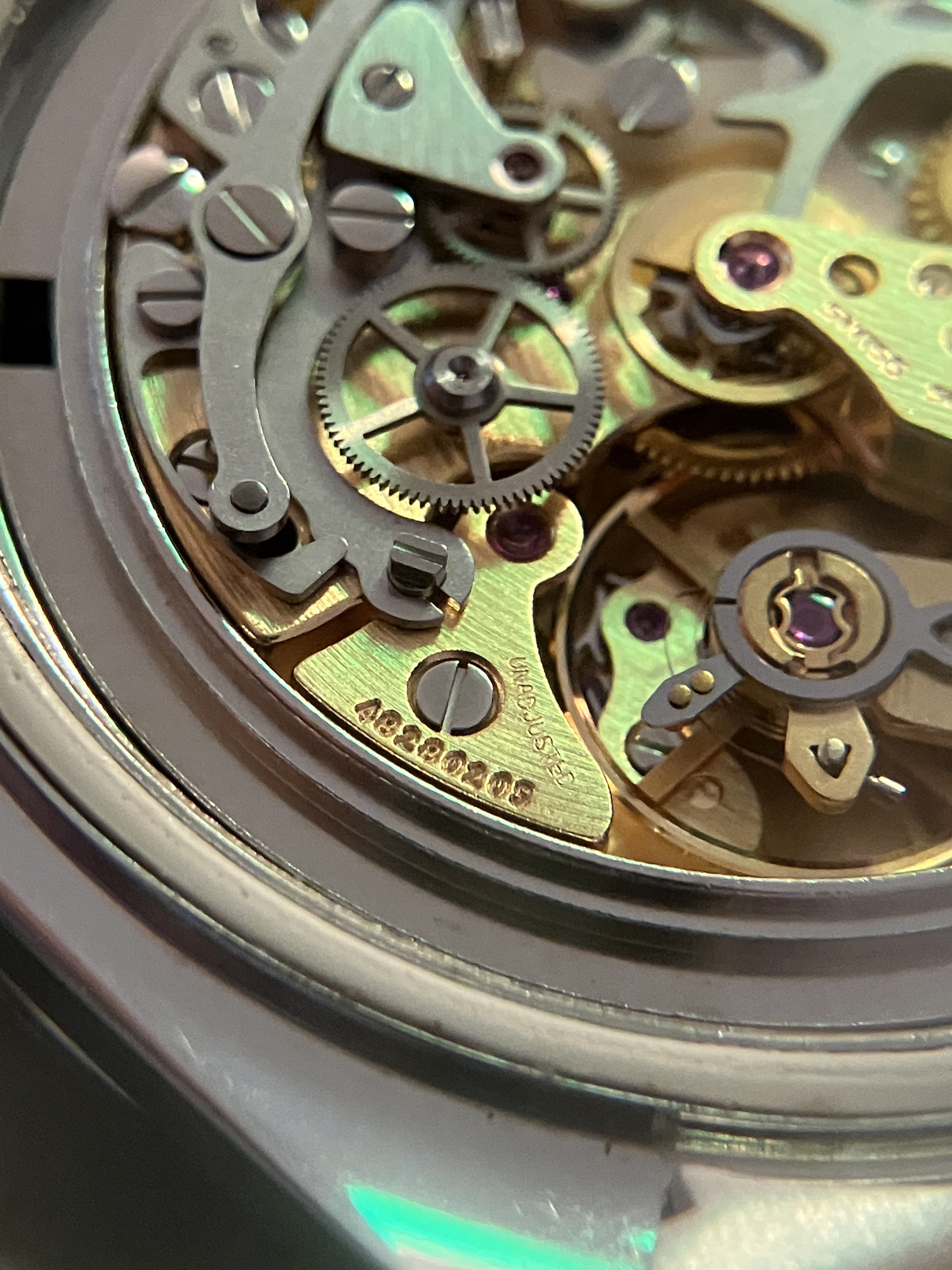 The movement is the 861 caliber, as expected. Serial of course matches the Case, Hangtag and papers. Winds smooth, runs strong, chrono functions as it should, reset is perfect, no chrono creep. The movement was not serviced while in my possession.