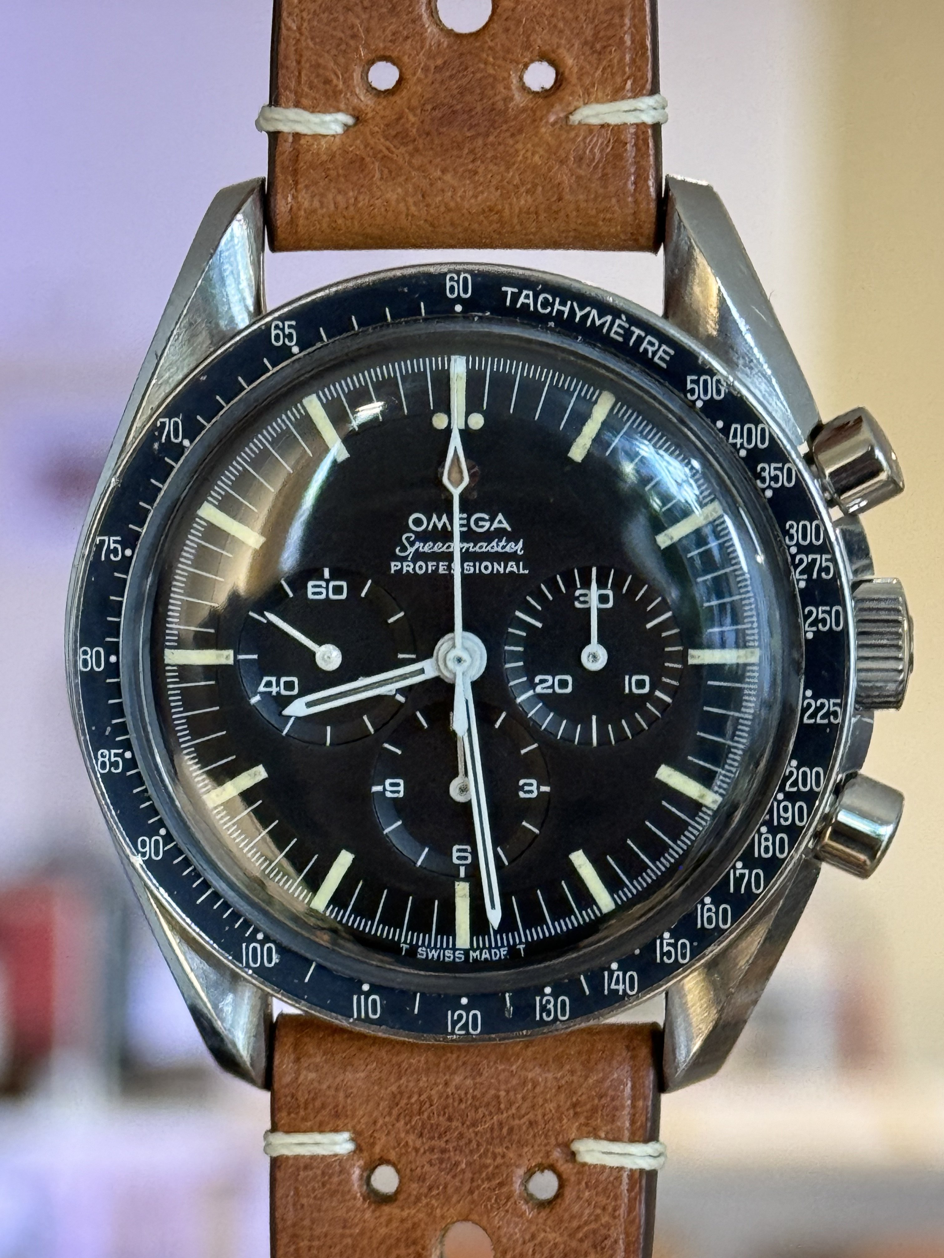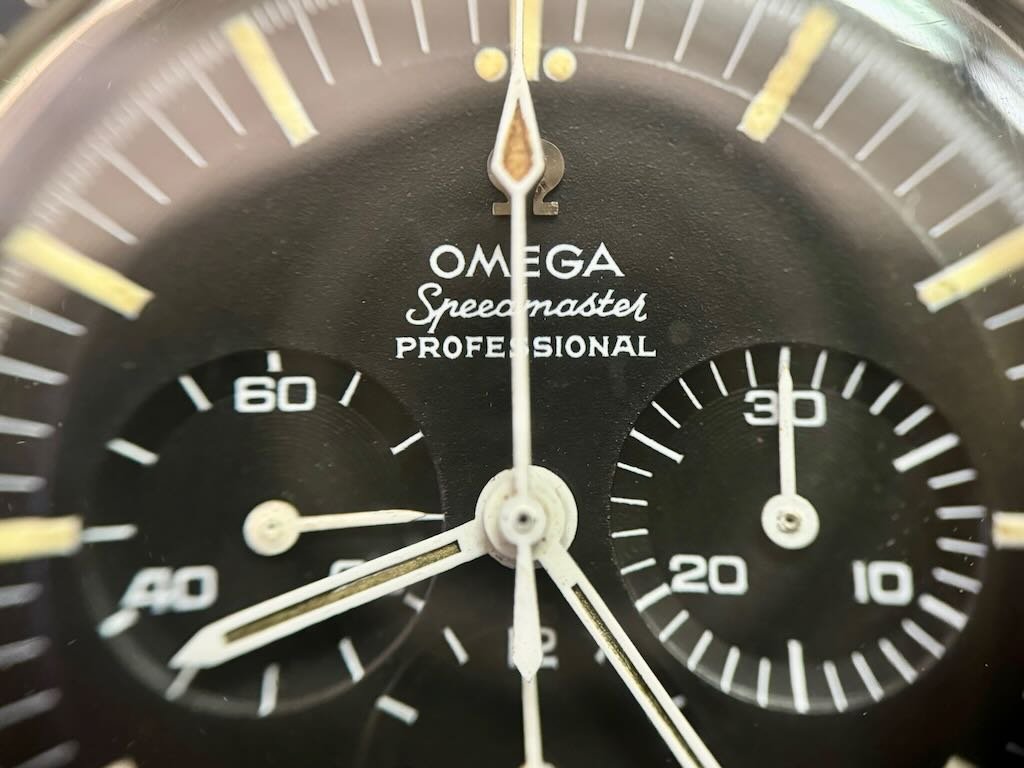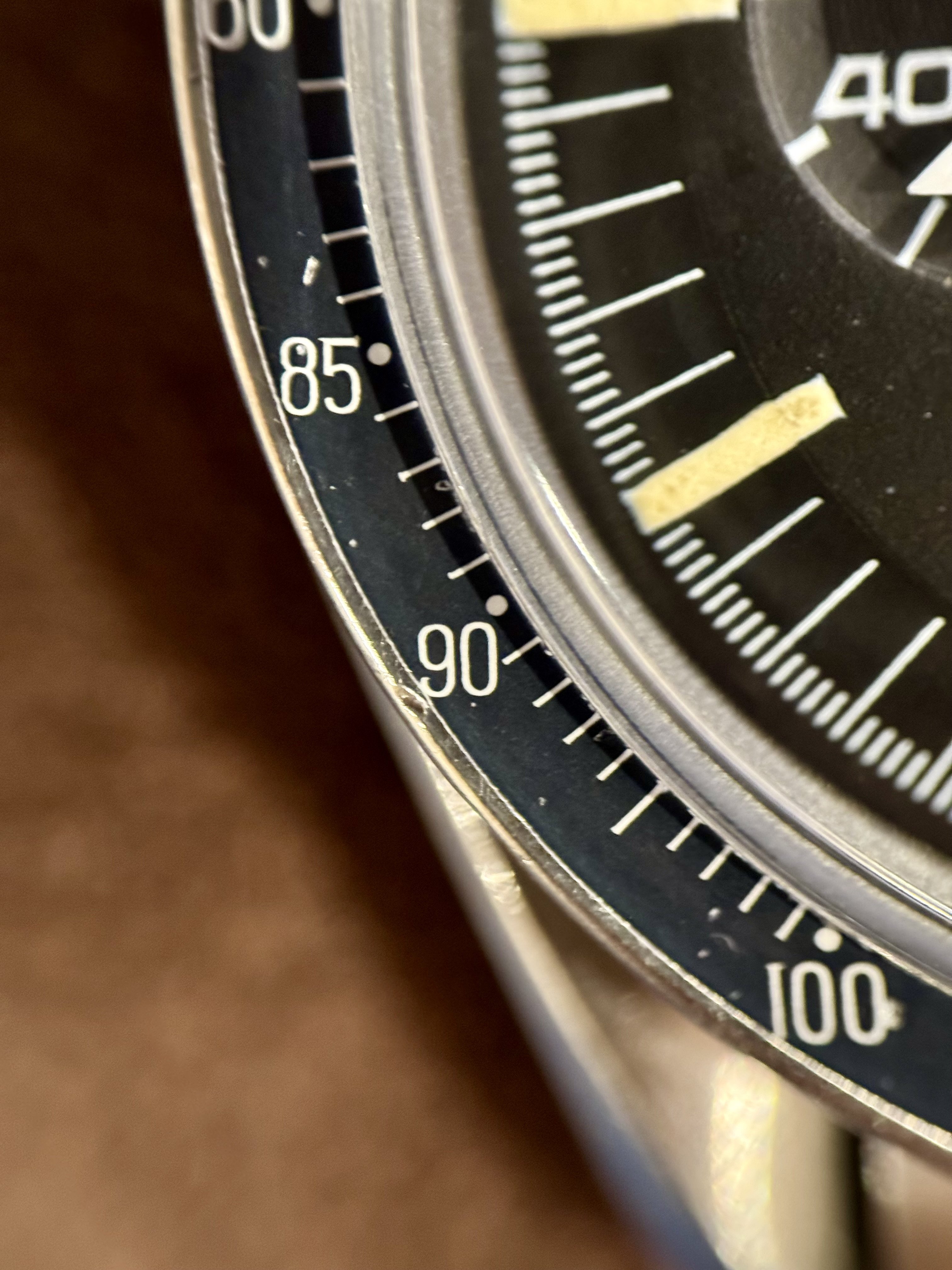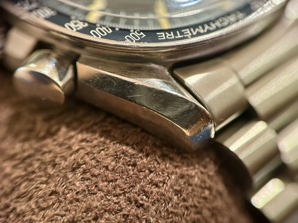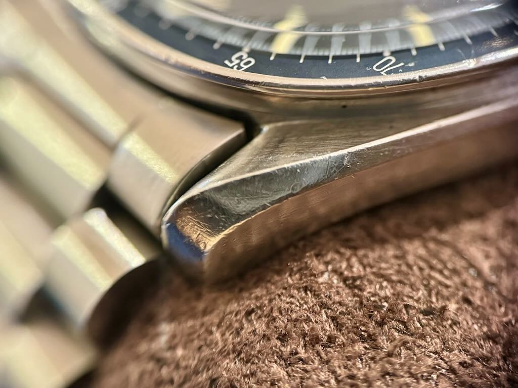 Crown (B2) and pushers (type 4, wide and tall): in very good condition. Unsure whether they are original or service, but if they are service, they are not new/recent ones. Per Moonwatch Only, significant numbers of 145.012s have been fitted with the wide/32-tooth crowns, leading them to conclude that they could be original, so that is my assumption here.