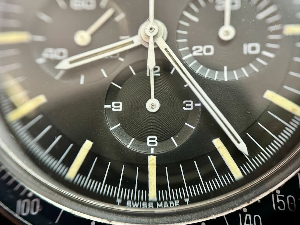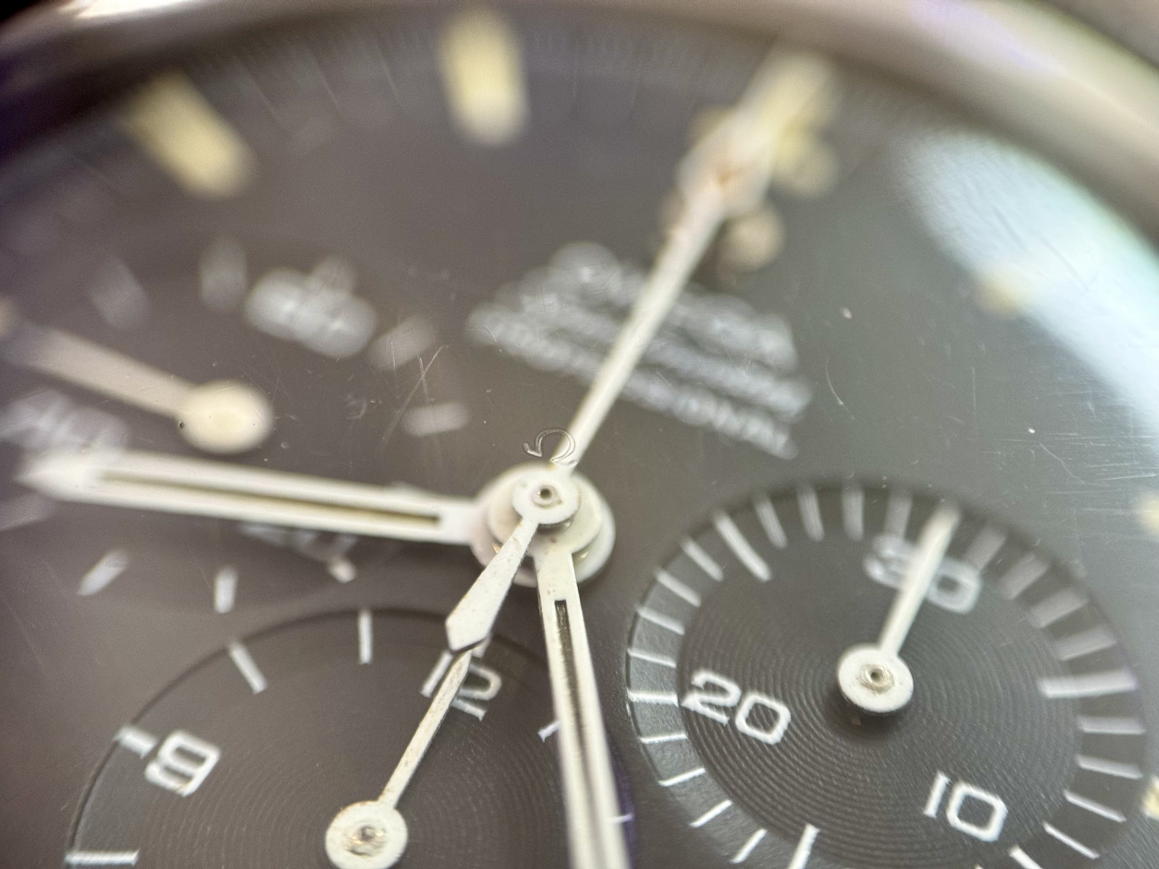 Hands (painted baton/stick, drop-end chrono seconds, tritium; configuration C1): in very good condition, with a patina slightly darker than the dial. The small seconds hand appears slightly glossier than the others, indicating that it may have been repainted at some point, but this is only visible at certain angles under 10x magnification.