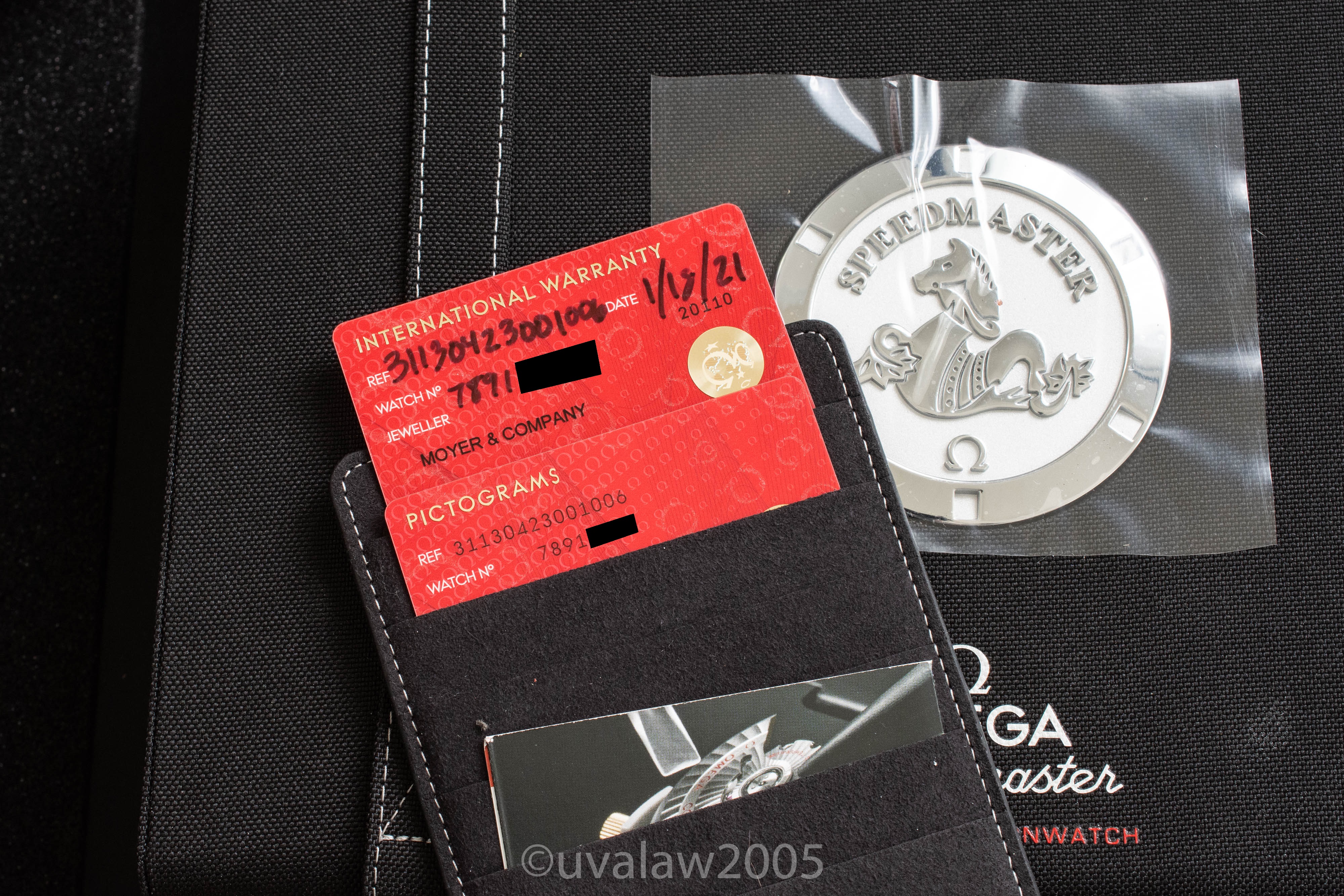 Complete kit with the enormous inner/outer box, hang tag, manual, unworn OEM black NATO and Velcro strap, loupe, medallion, pictogram, and signed/stamped AD warranty card dated January 2021. Five-year Omega warranty runs through January 2026.
